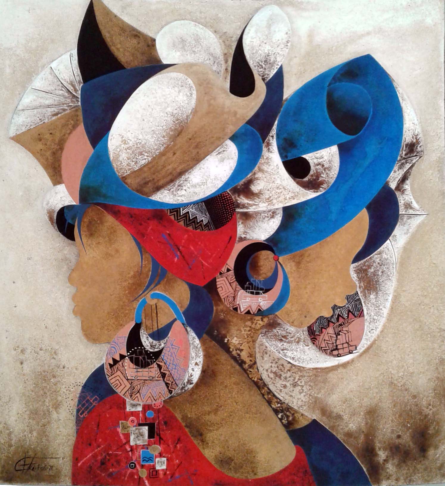 Comme il ne se fixe aucune limite dans son processus de création et se réinvente chaque fois, la dernière série présentée à la Galerie Arte porte sur une inspiration stylisée des Coiffes et Parures qui ornent les visages de l’Afrique traditionnelle.