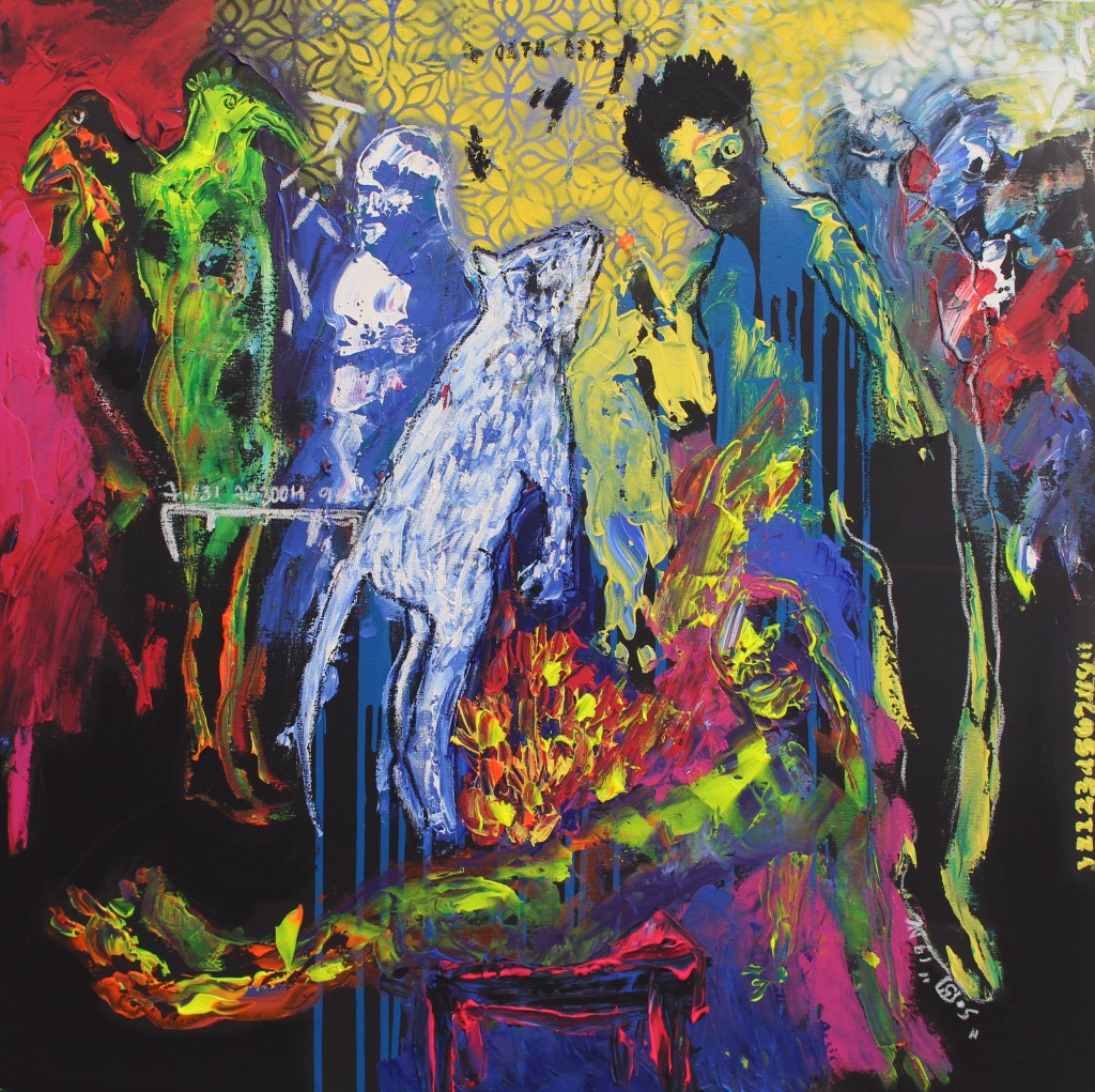 Admirateur de Francis Bacon et Basquiat, Soly compose une mythologie personnelle où se confondent des formes hybrides animales et humaines, des êtres improbables, des masques imaginés par l’artiste.
