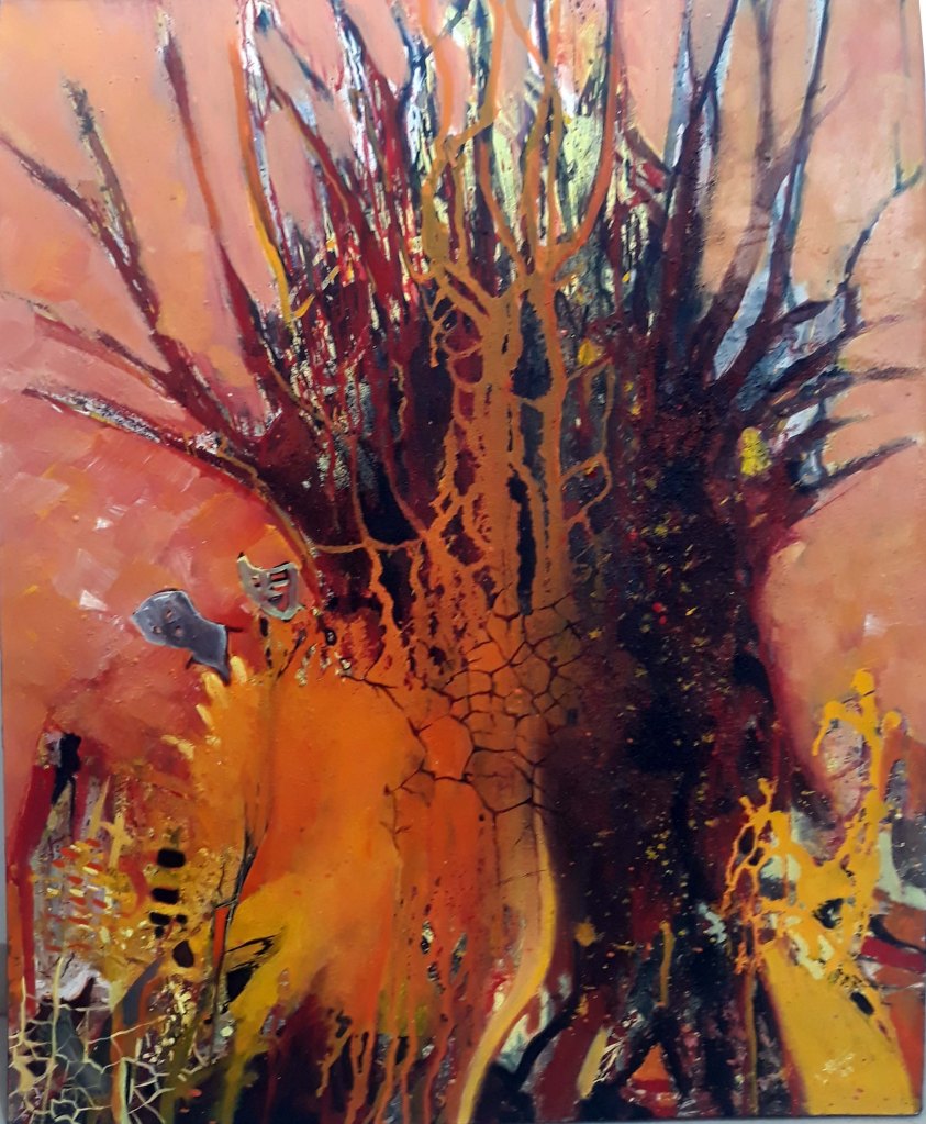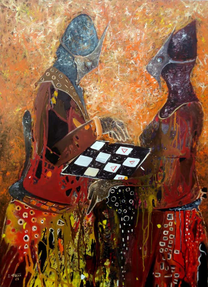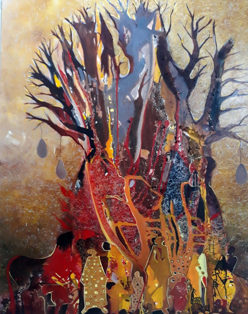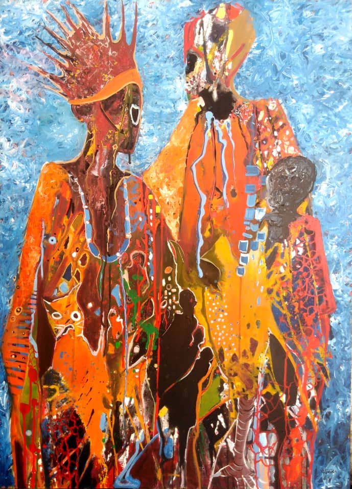 Sa peinture fluide est empreinte d’un certain mysticisme. Les baobabs, emblèmes du Sénégal, semblent être habités de vies invisibles comme le veut la légende locale. Les personnages sont souvent majestueux mais indéfinissables et semblent souvent occupés à des rituels secrets.