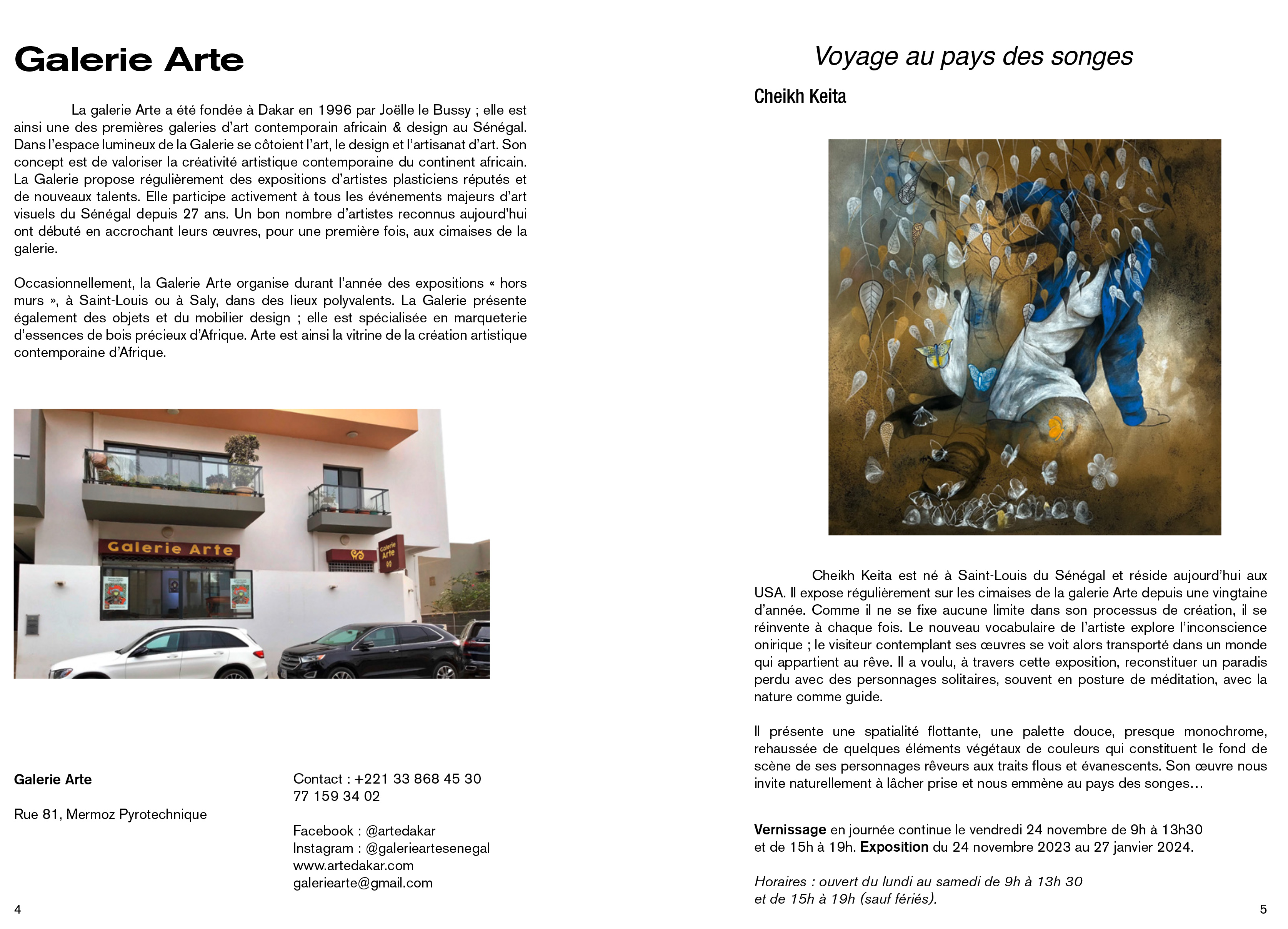 Cheikh Keita « Balade au pays des songes » Partcours 2023 A l’affût 101 X 80 VENDU Besoin de calme 101 X 85 VENDU Côte à côte 104 X 89,5 Dodo Mr Do 75 X 101 Doux sommeil 115 X 113 Vendu Entres amies 130 X 130 Etranges feuilles 60 X 45 Joie de vivre 50,5 X 40,5 Vendu Leader 2 118,5 X 100 Leader 1 101 X 75 Les jumeaux et la fleur 50,5 X 40,5 VENDU Lucky Boy 130 X 130 VENDU Matinal 119 X 100 VENDU Not Alone 104 X 89,5 Pluie d’érables 134 X 119 Prends ma main 99 X 99 VENDU Shooting 109 x 75 Un jardin paisible 130 X 130 Watch your stem 46 X 115 (triptyque) Whats going on in this world 129 X 99 Yes I can 116 X 100 LISTE DES PRIX Partager : Cliquez pour partager sur WhatsApp(ouvre dans une nouvelle fenêtre) WhatsApp J’aime chargement…