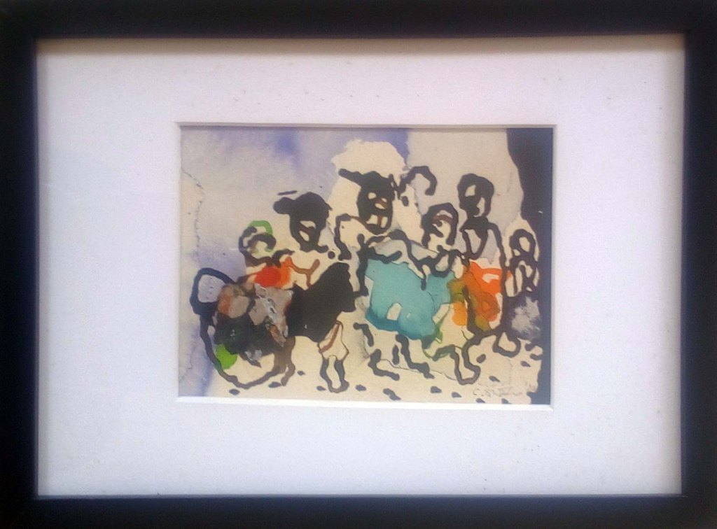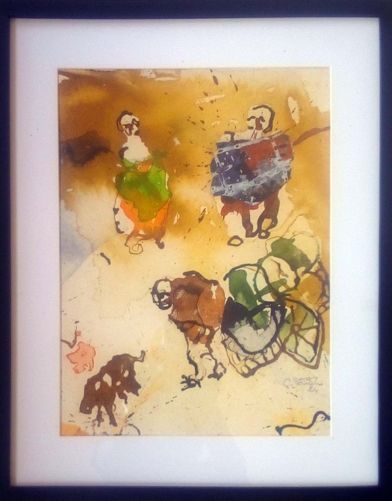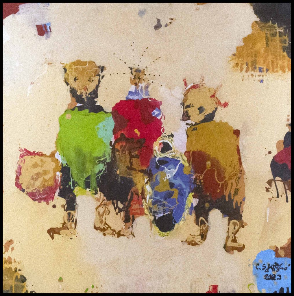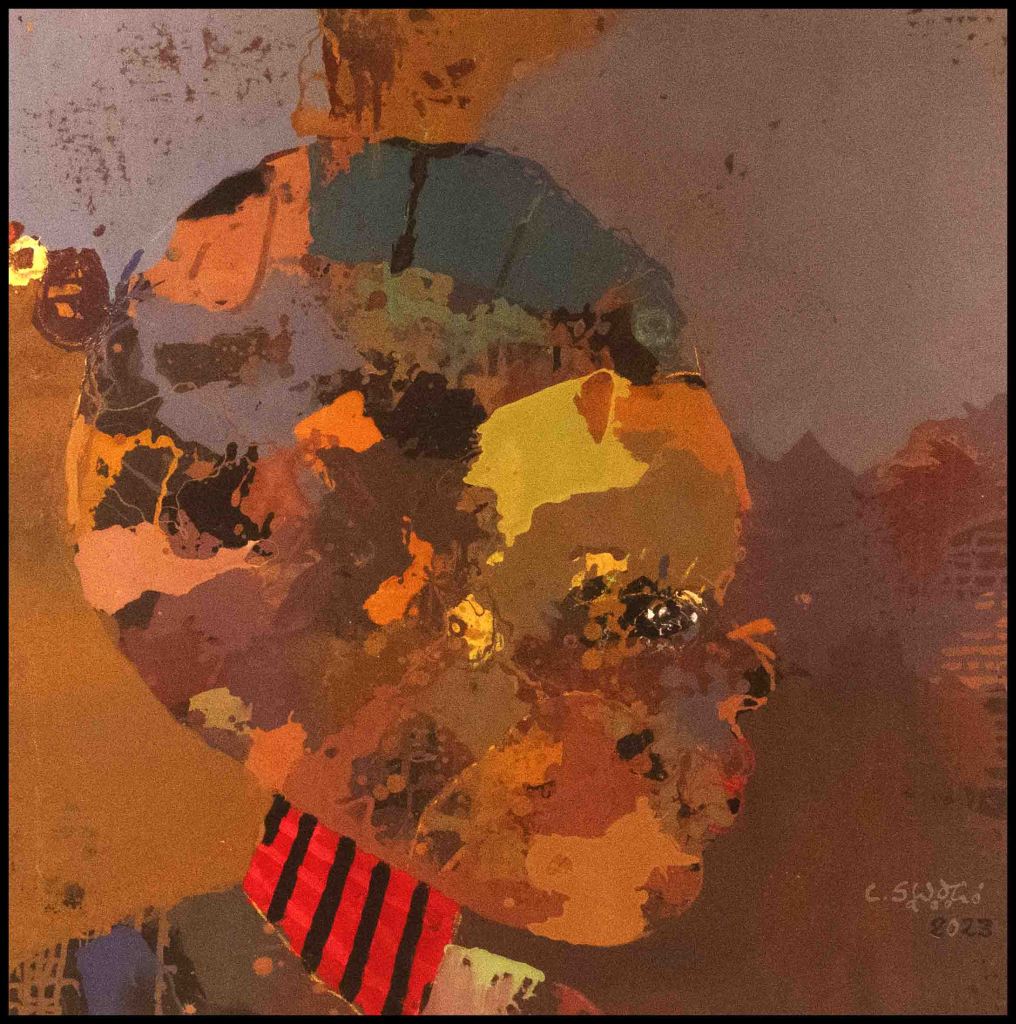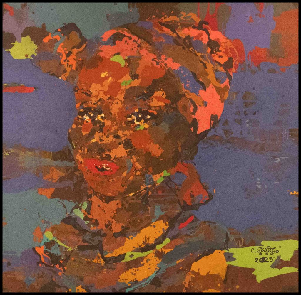 l’exposition d’aujourd’hui « Demain sera un autre jour » reflète son état d’âme du moment. Malgré la situation compliquée du Burkina Faso depuis quelques temps, sa philosophie est celle de « carpe diem ». Il puise toute son énergie, son équilibre et sa bonne humeur quotidienne dans la création. Il aime aussi transmettre son art et encadre bénévolement des femmes orpailleuses des mines d’or artisanales du Burkina Faso et du Ghana. Il encadre également des élèves déscolarisés auxquels il enseigne le dessin, l’art de dessiner des portraits.