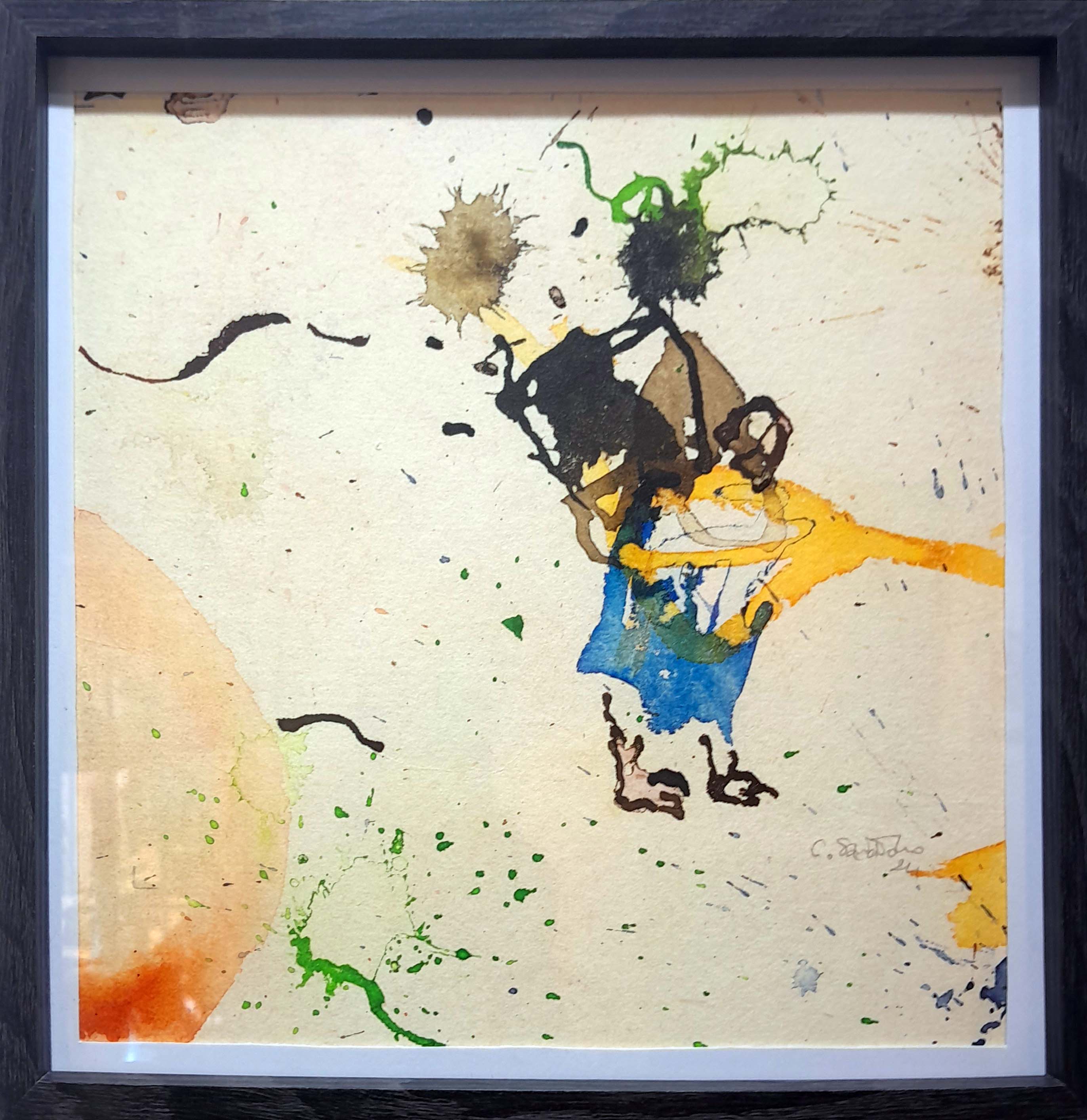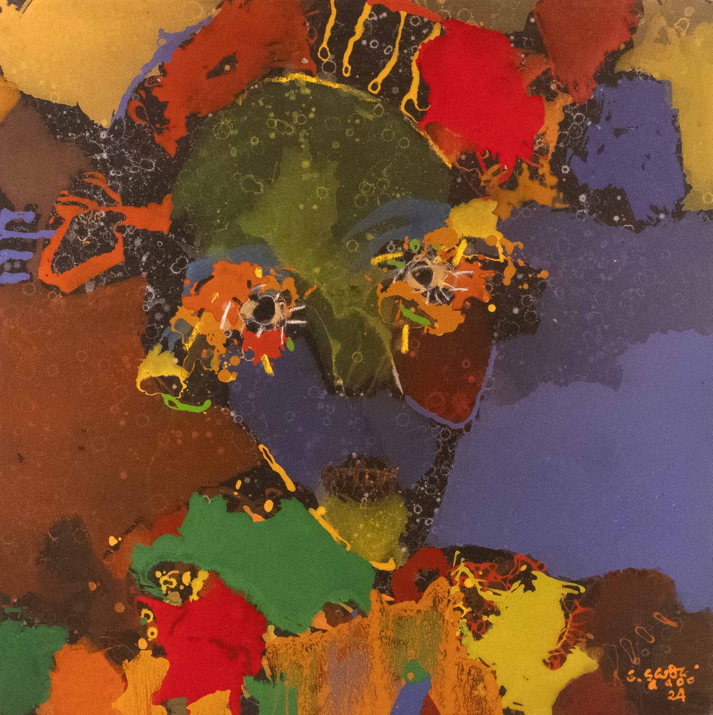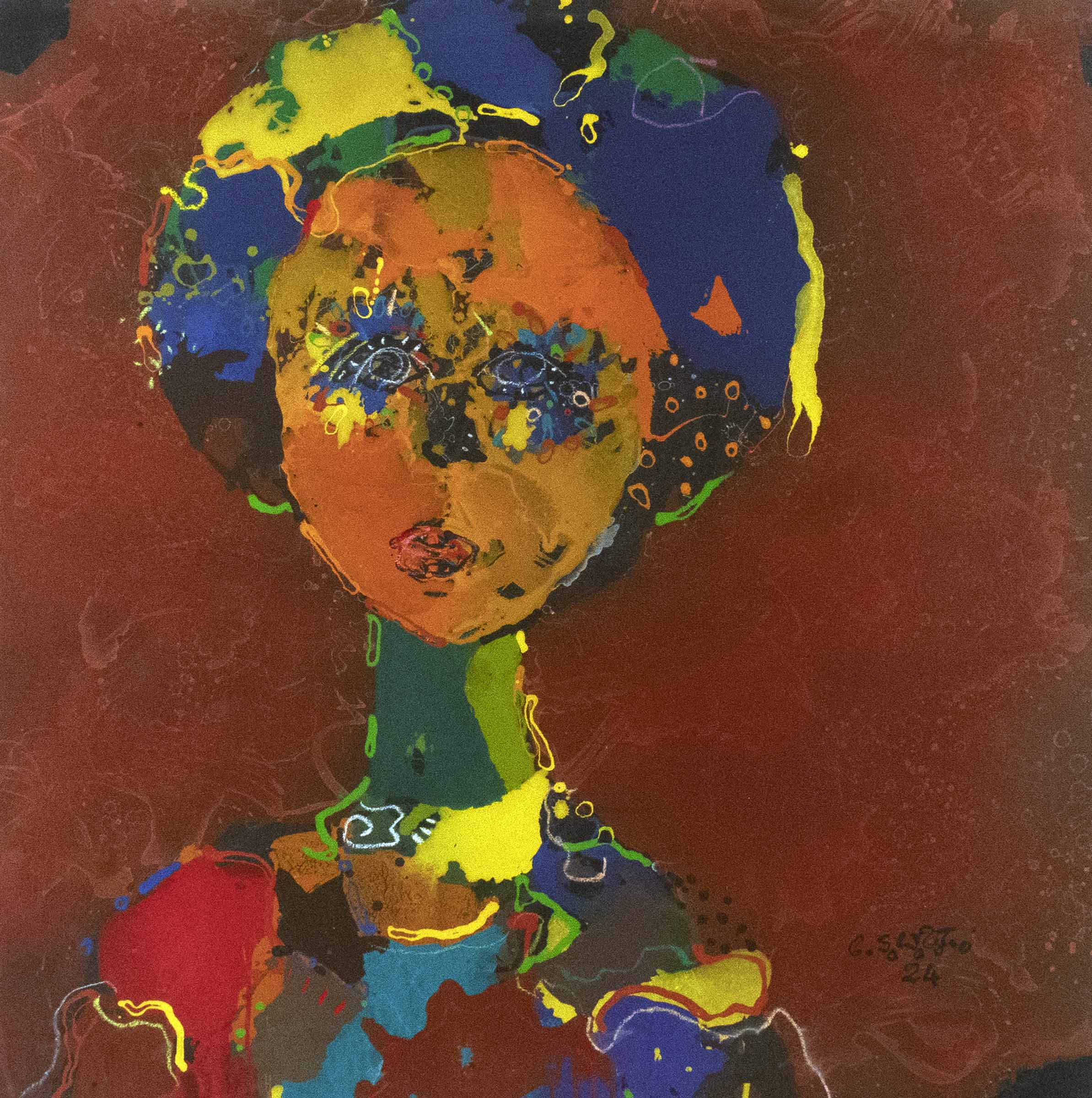 l’exposition d’aujourd’hui « Demain sera un autre jour » reflète son état d’âme du moment. Malgré la situation compliquée du Burkina Faso depuis quelques temps, sa philosophie est celle de « carpe diem ». Il puise toute son énergie, son équilibre et sa bonne humeur quotidienne dans la création. Il aime aussi transmettre son art et encadre bénévolement des femmes orpailleuses des mines d’or artisanales du Burkina Faso et du Ghana. Il encadre également des élèves déscolarisés auxquels il enseigne le dessin, l’art de dessiner des portraits.