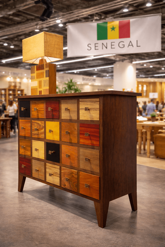 Design signé Joëlle Le Bussy, réalisé à Dakar en bois précieux d’Afrique.