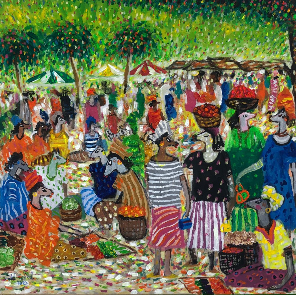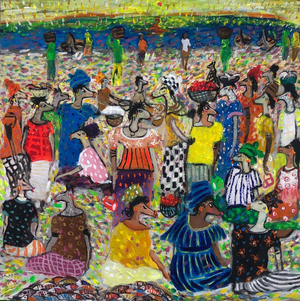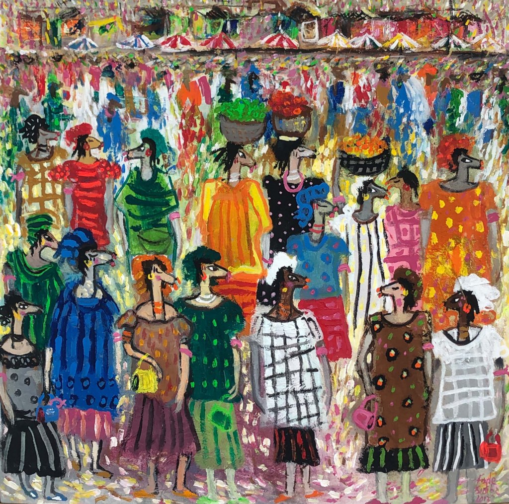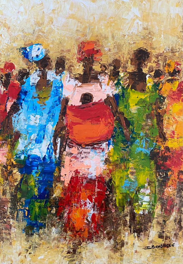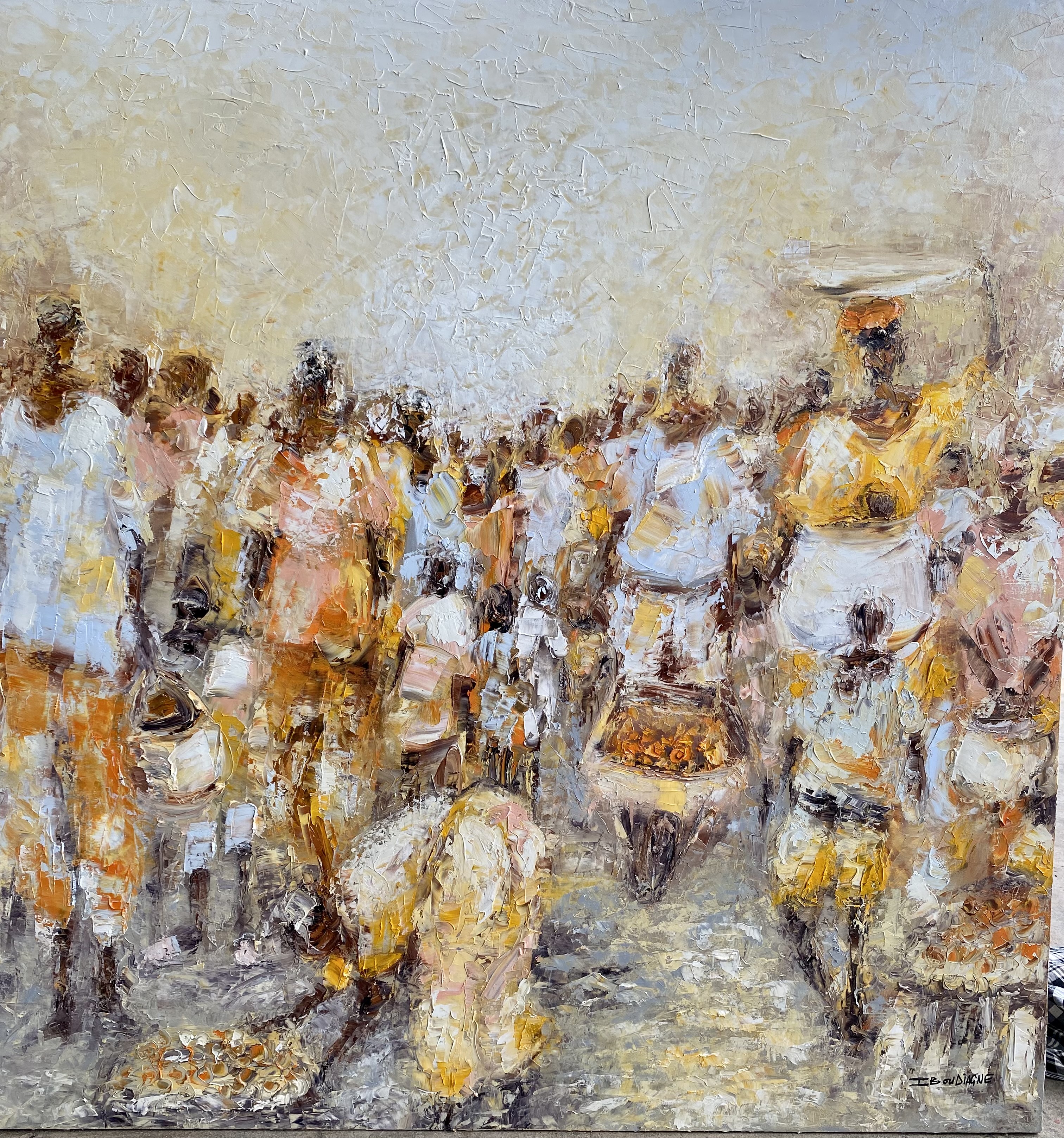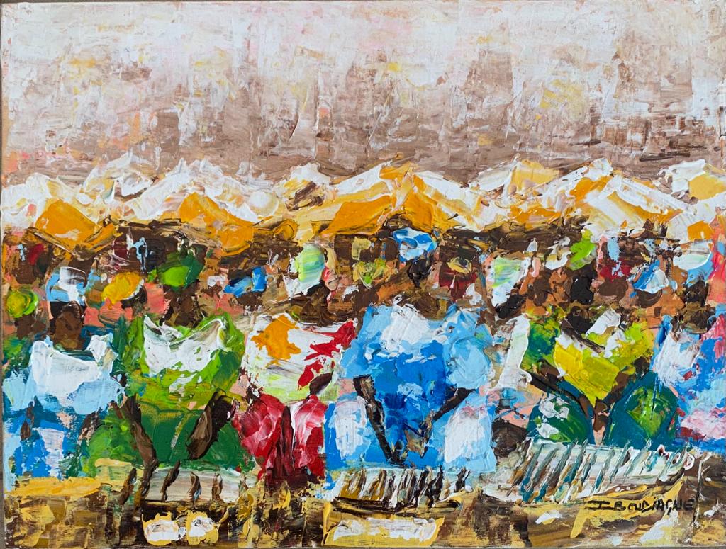 A travers sa démarche artistique, il porte un regard toujours bienveillant sur la société. De ses touches de couleurs chatoyantes inspirées par les grands maîtres de l’impressionnisme, il représente la foule et magnifie le travail des femmes au marché, aux champs.