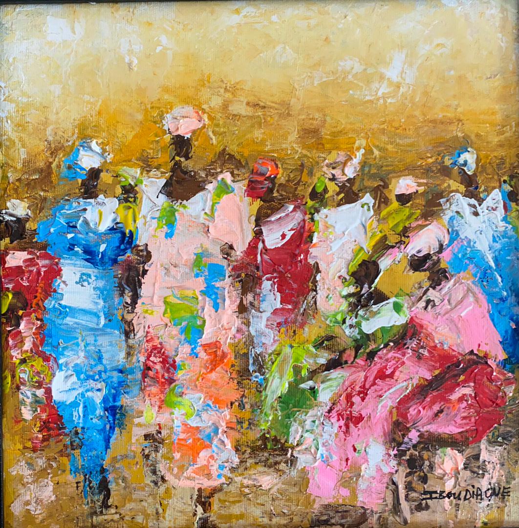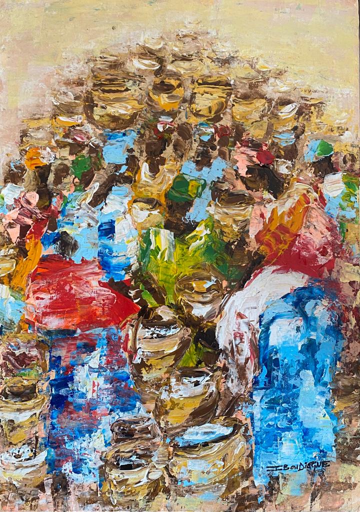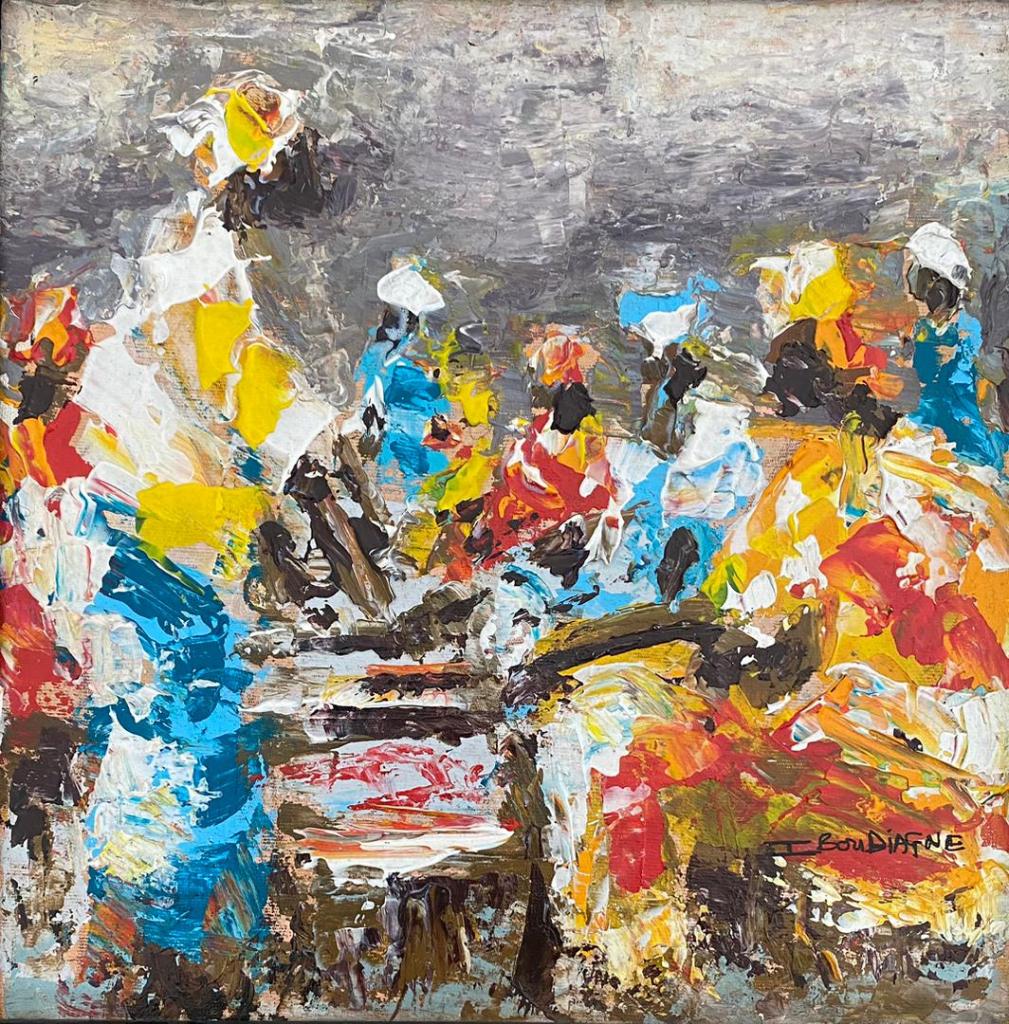 La préoccupation d’Ibou Diagne est de fixer une vision fugitive de la réalité changeante qui se traduit par sa technique picturale : la juxtaposition des couleurs complémentaires et les couches épaisses de peintures à l’huile ou à l’acrylique. Ce n’est plus le dessin et le contour qui donnent forme et volume aux choses mais la juxtaposition de touches de couleur.
