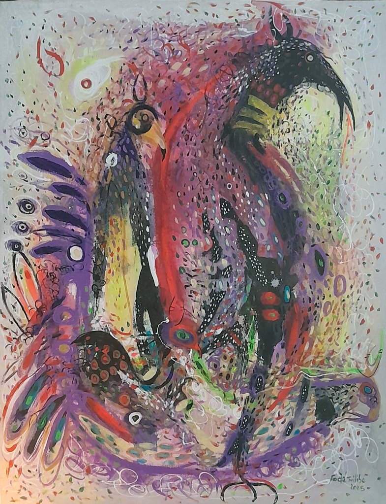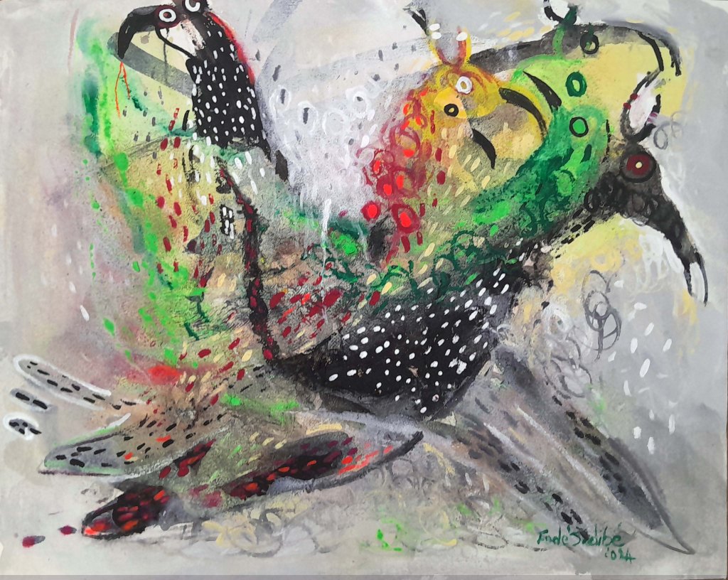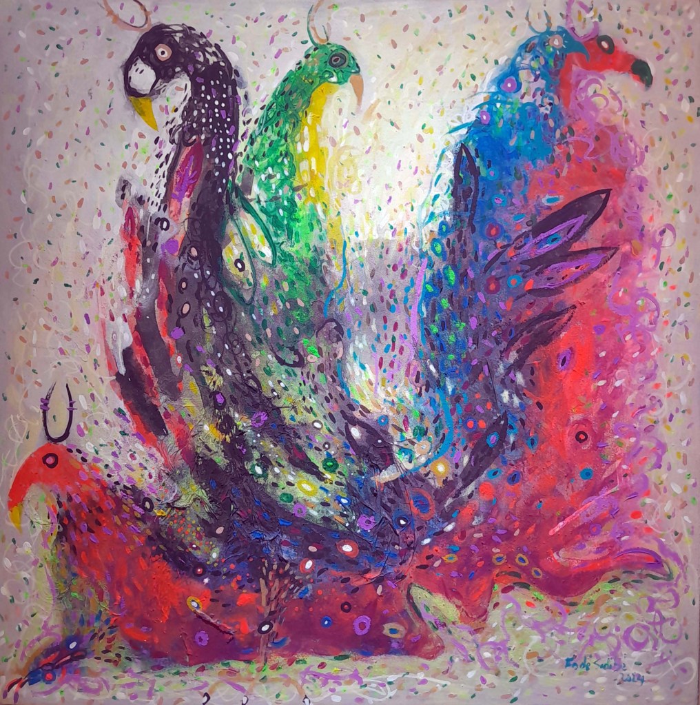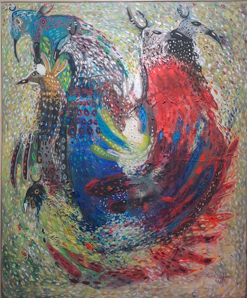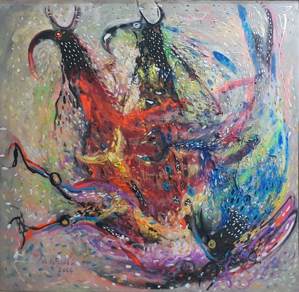 Fodé utilise l’acrylique dans ses toiles et une palette vive et colorée qui donnent vie à son univers artistique.