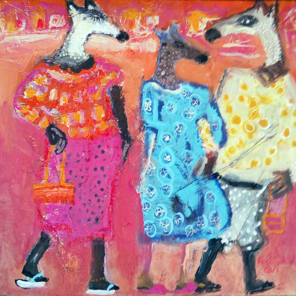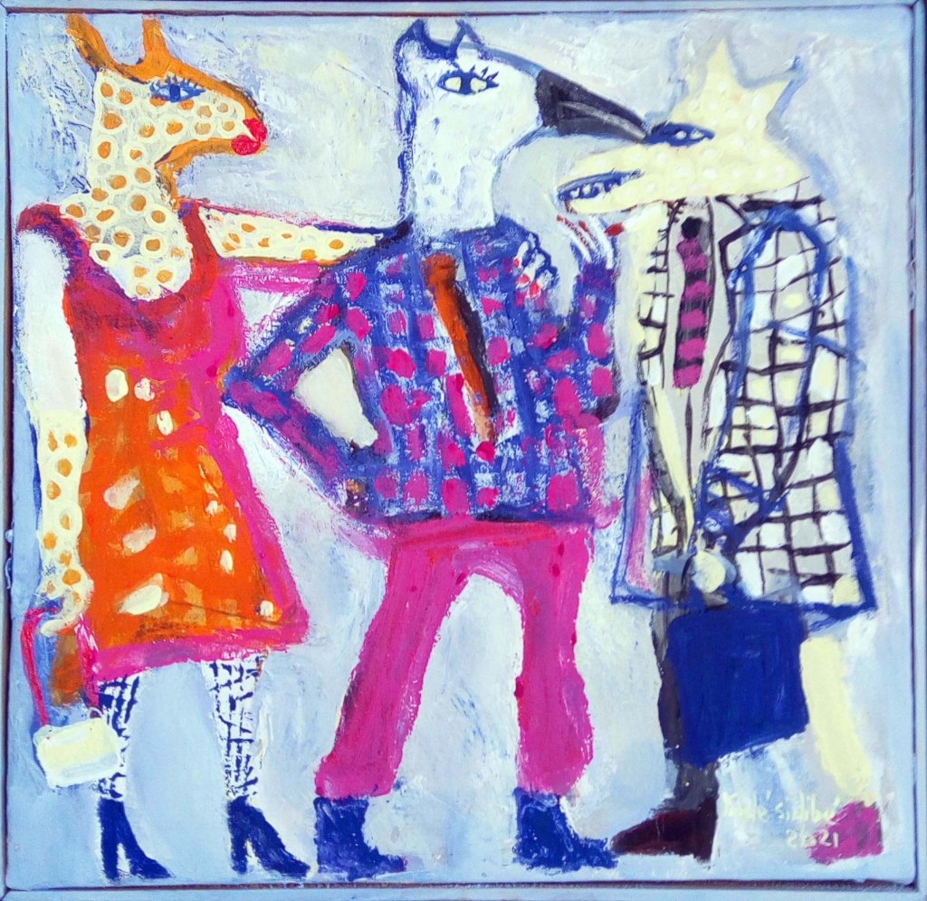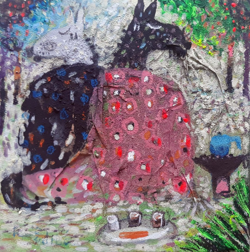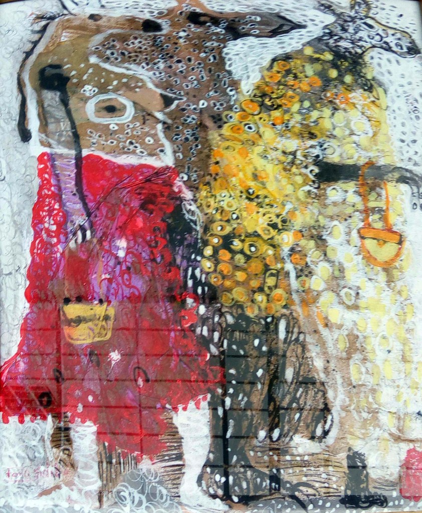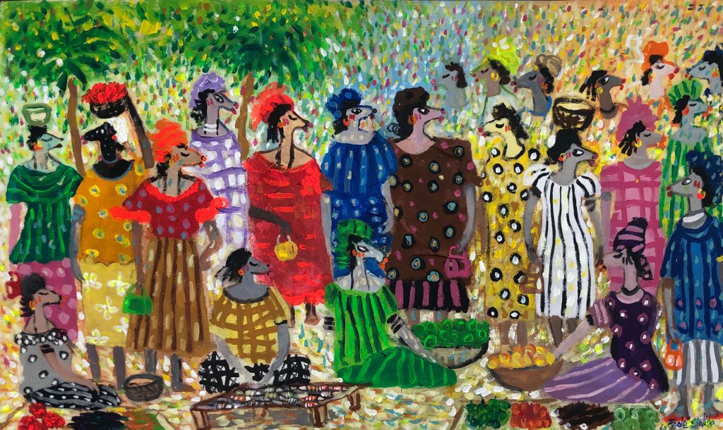 Fodé utilise l’acrylique dans ses toiles et une palette vive et colorée qui donnent vie à son univers artistique.