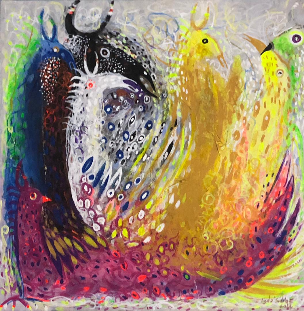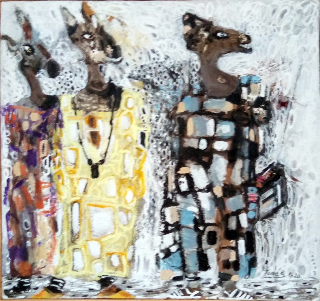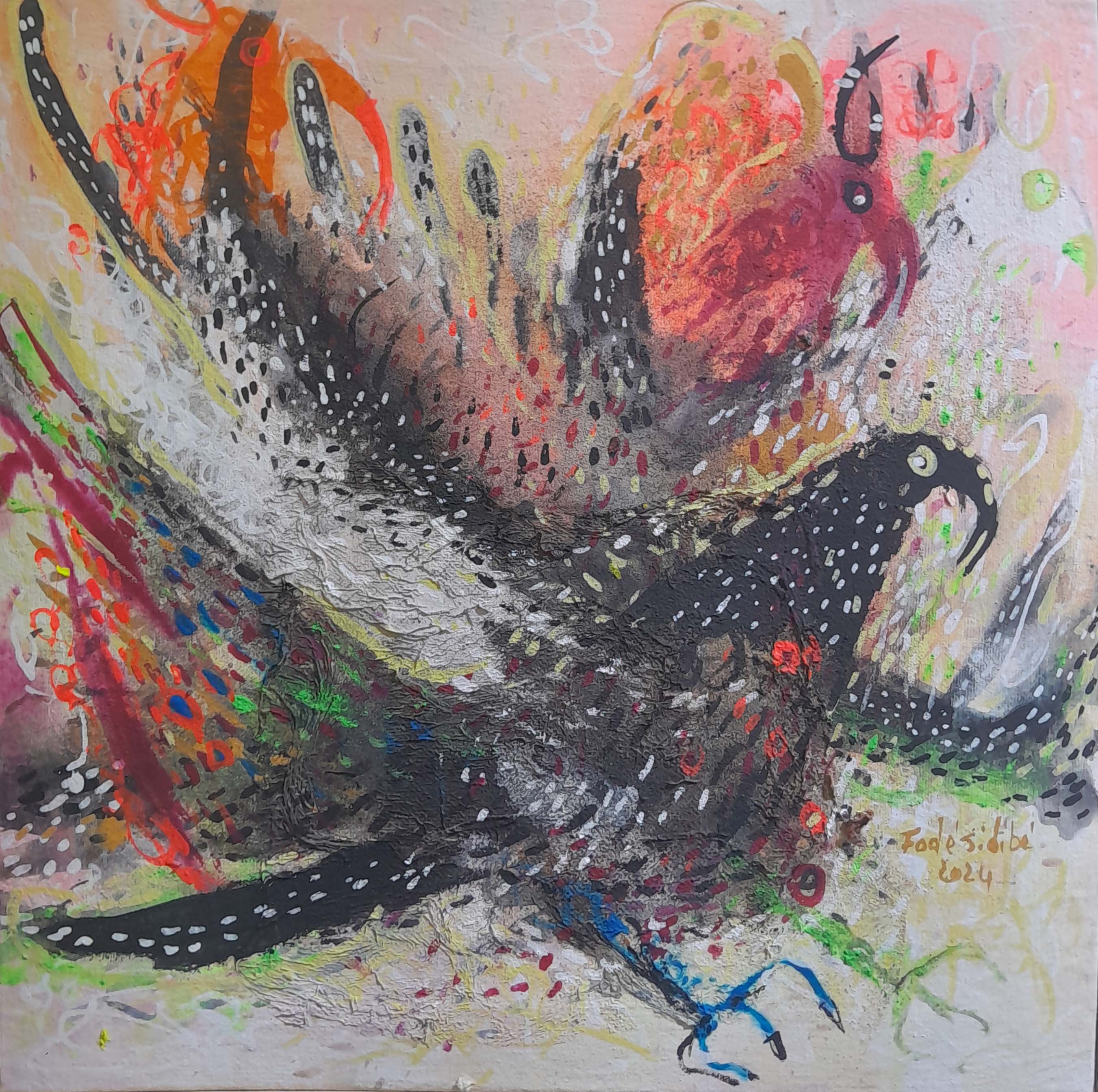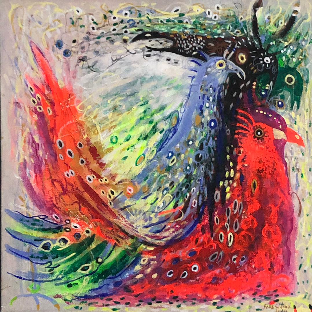 Fodé utilise l’acrylique dans ses toiles et une palette vive et colorée qui donnent vie à son univers artistique.