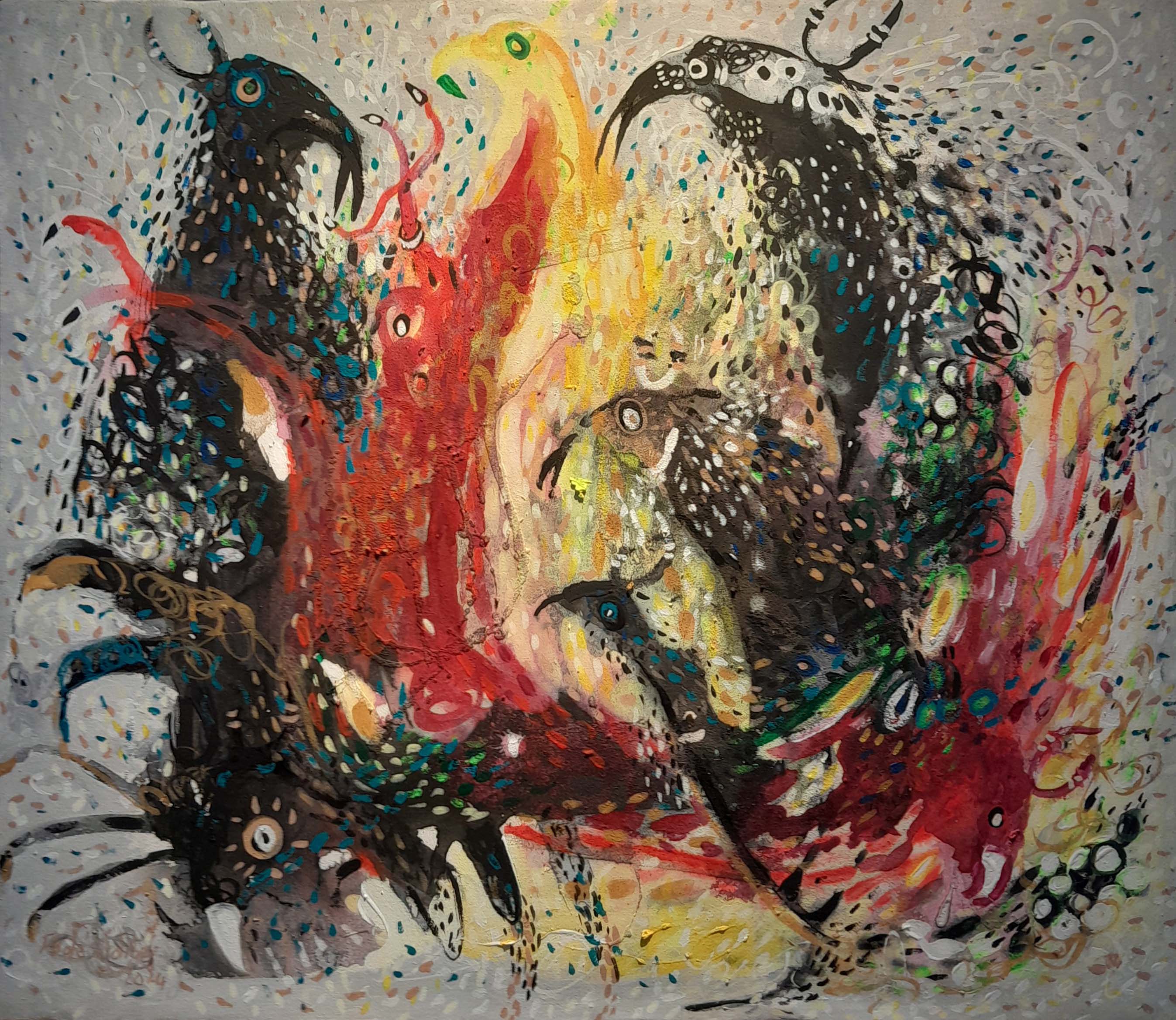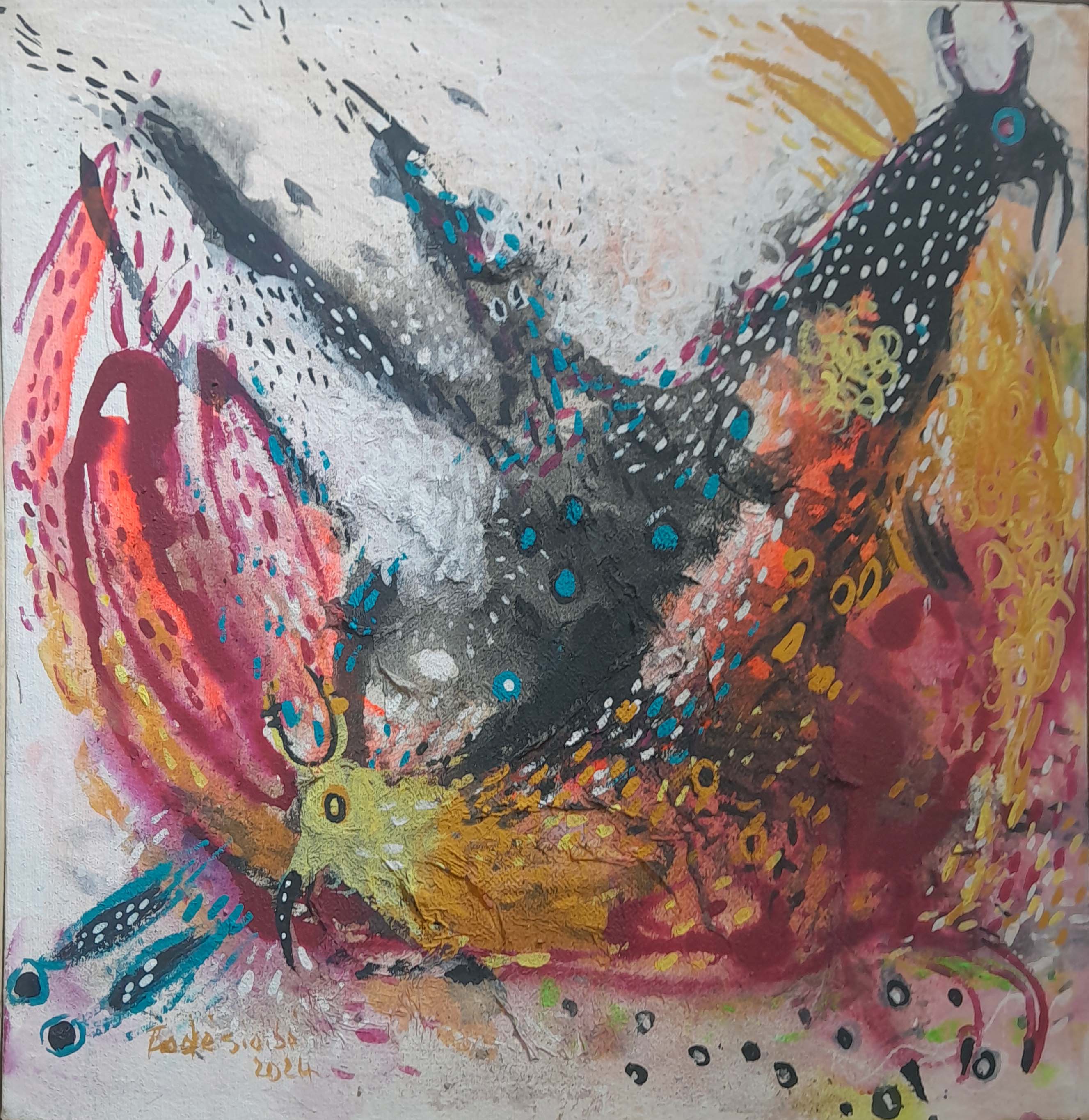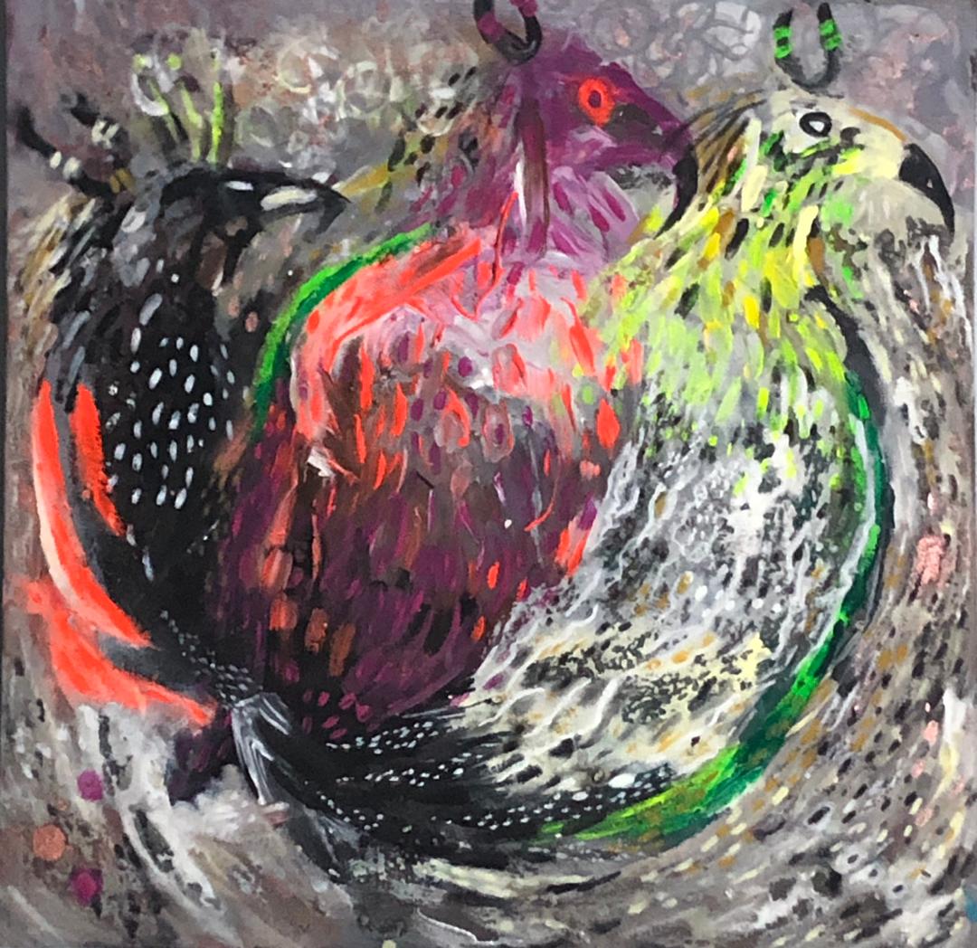 Fodé utilise l’acrylique dans ses toiles et une palette vive et colorée qui donnent vie à son univers artistique.
