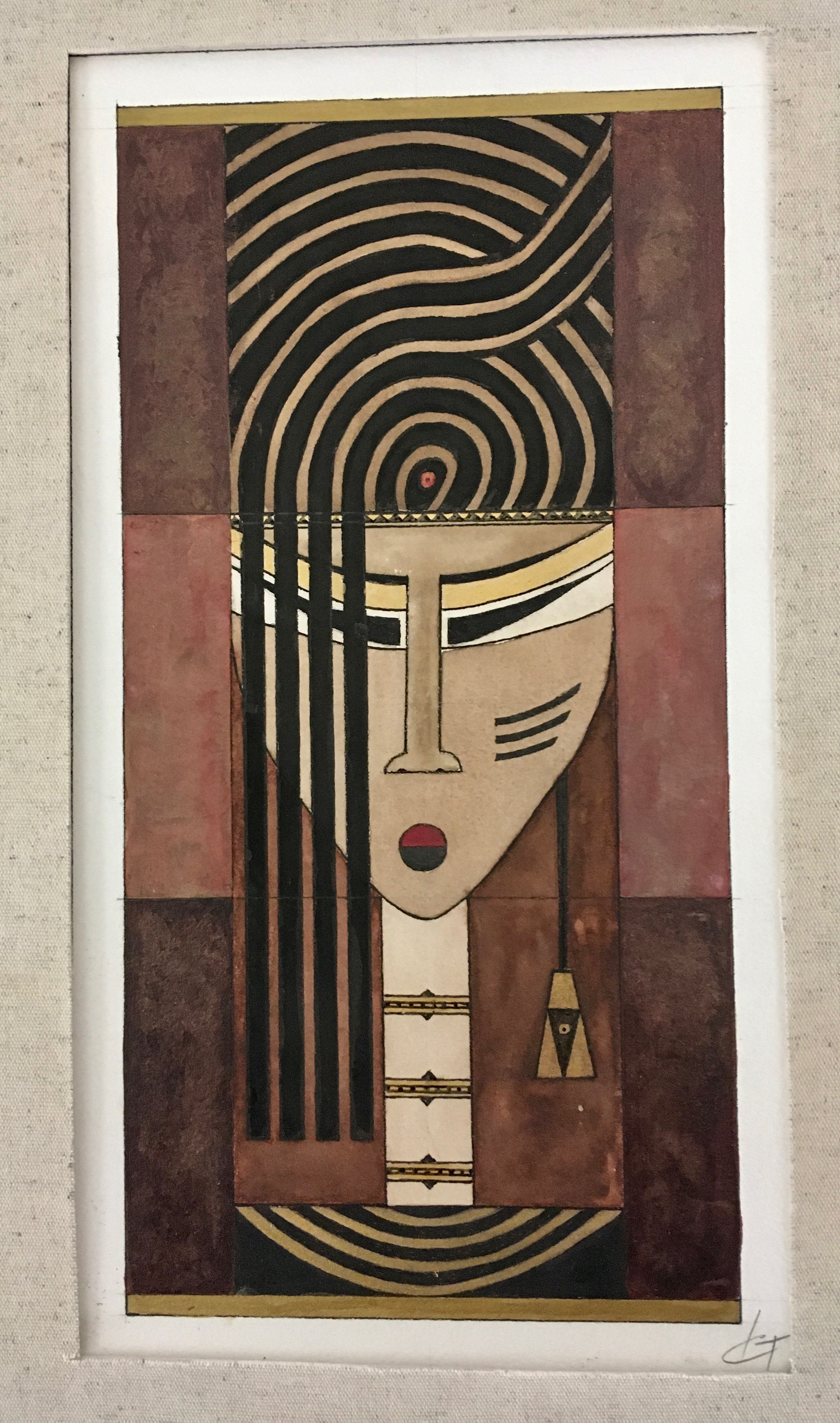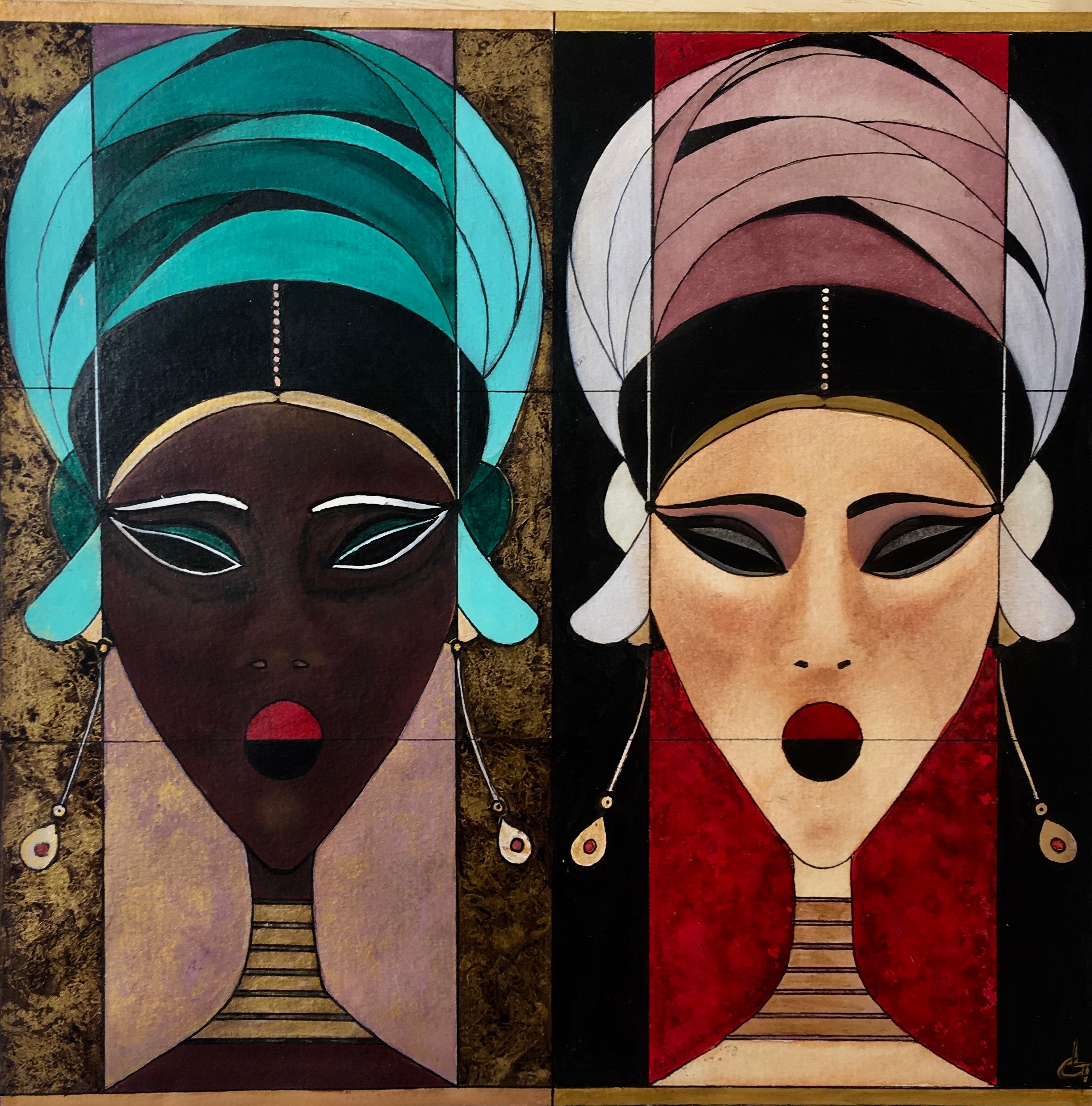 S’y entremêlent des visages, des formes géométriques, des coiffures, des bijoux.