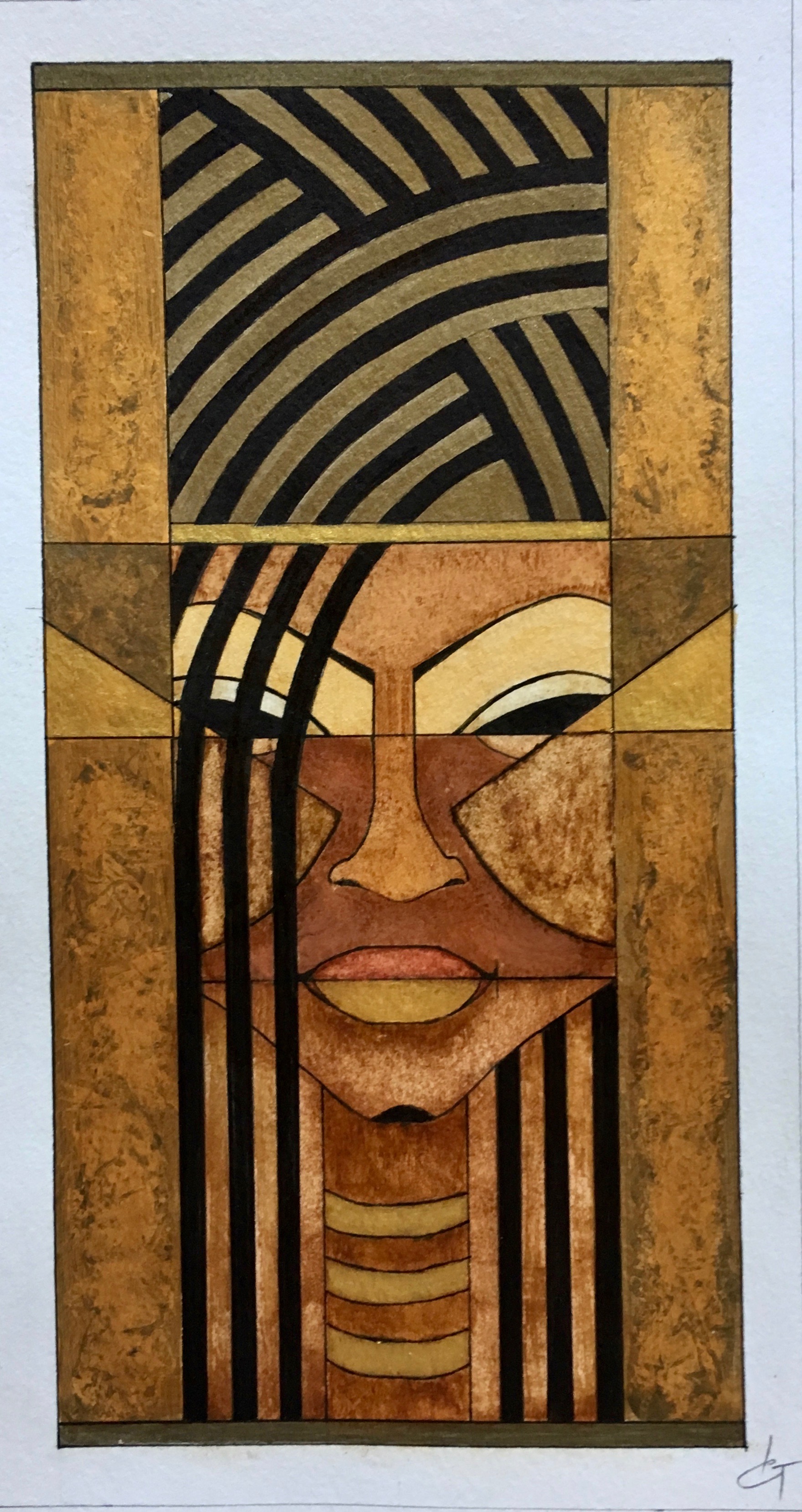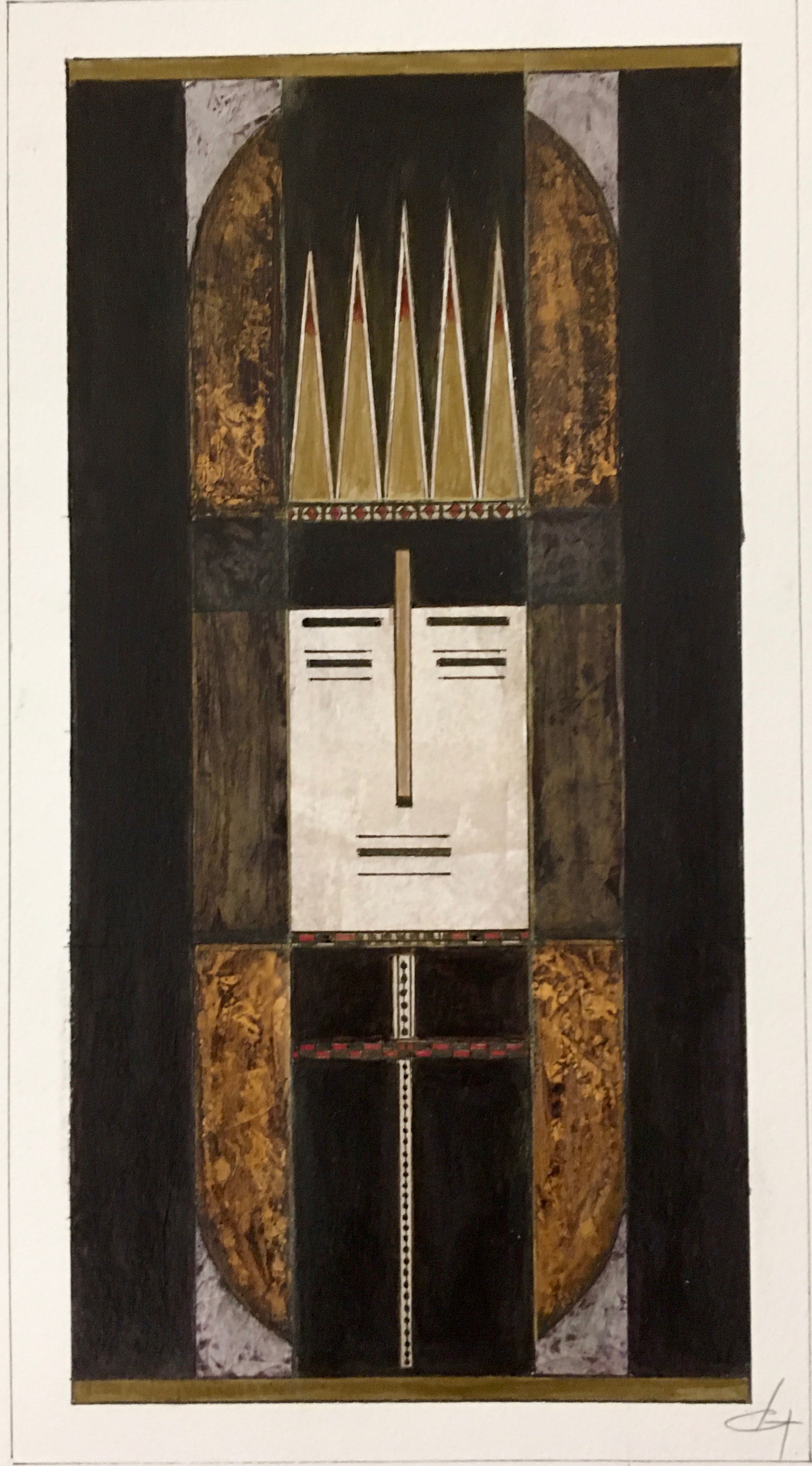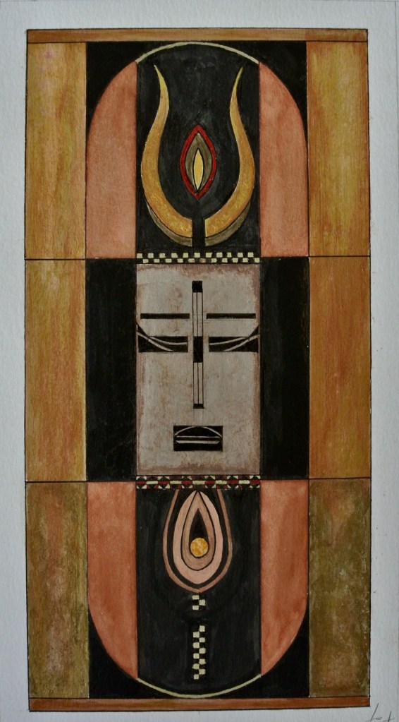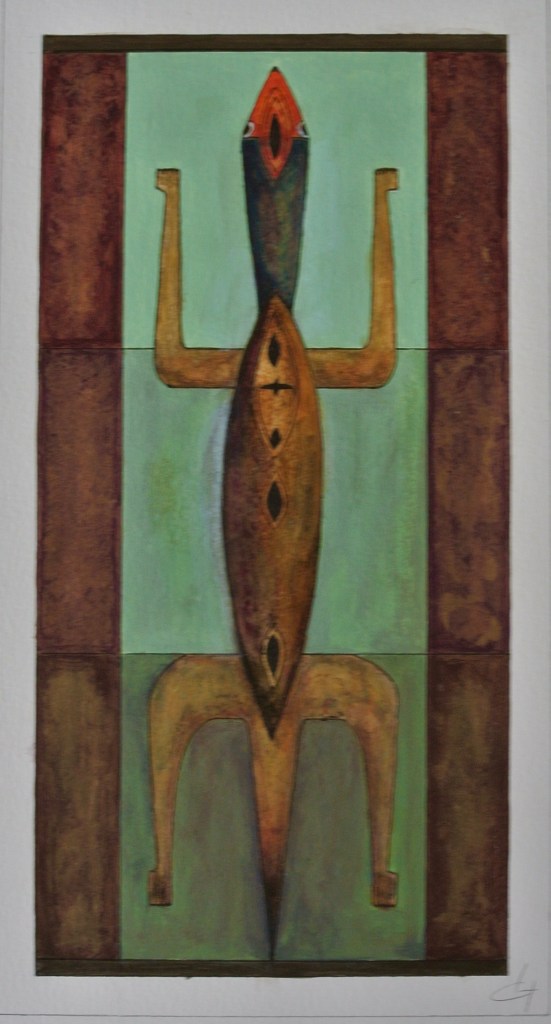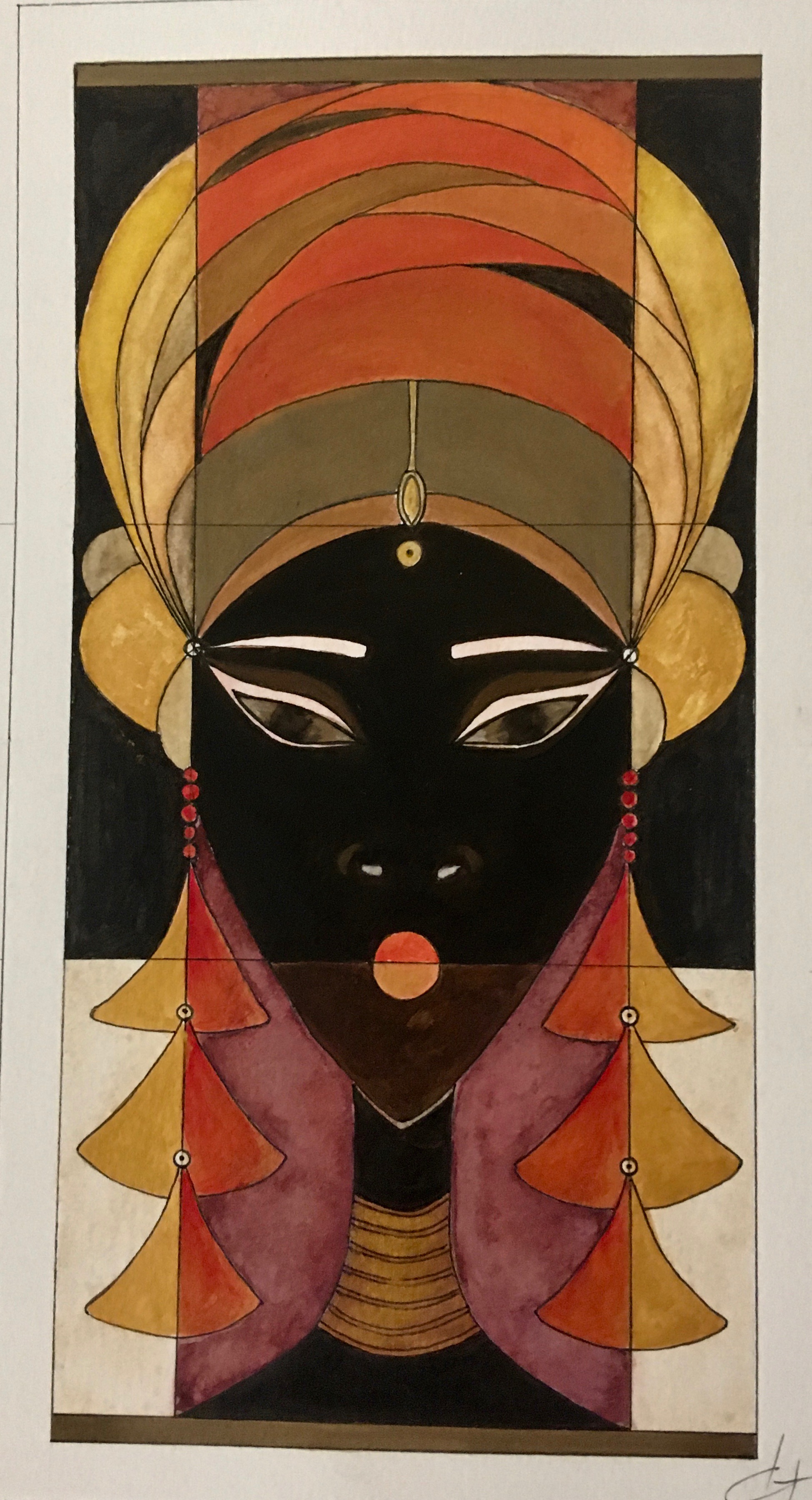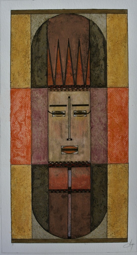 La technique est mixte (aquarelle, encre, acrylique) sur papier. Les couleurs chaudes et vives côtoient les touches dorées qui évoquent les icônes.