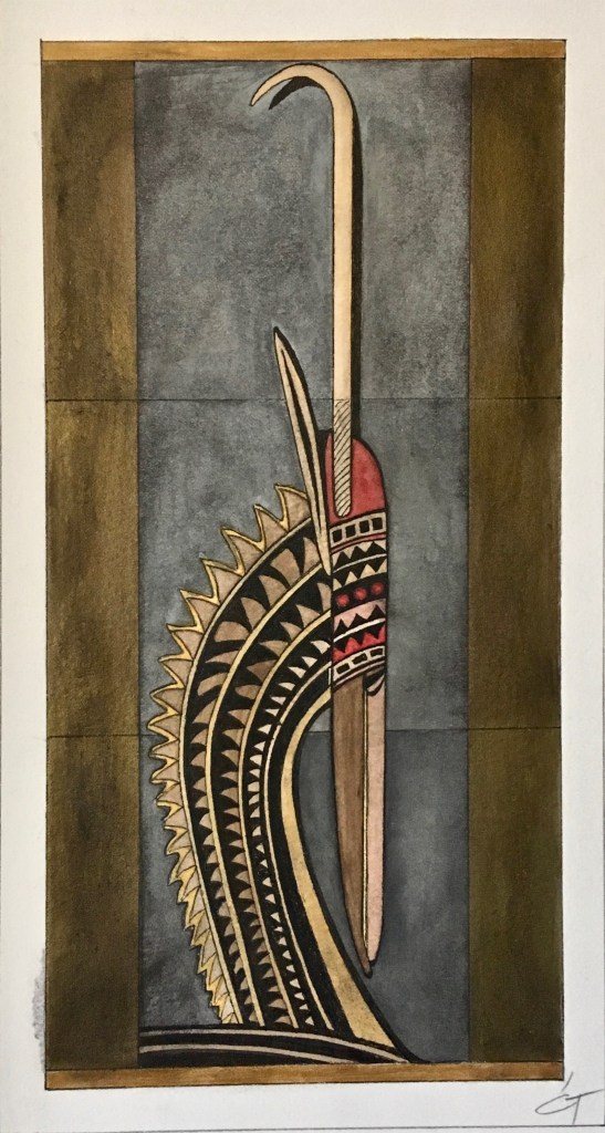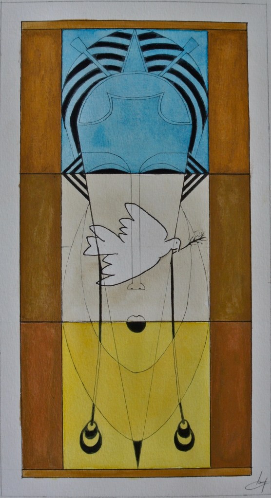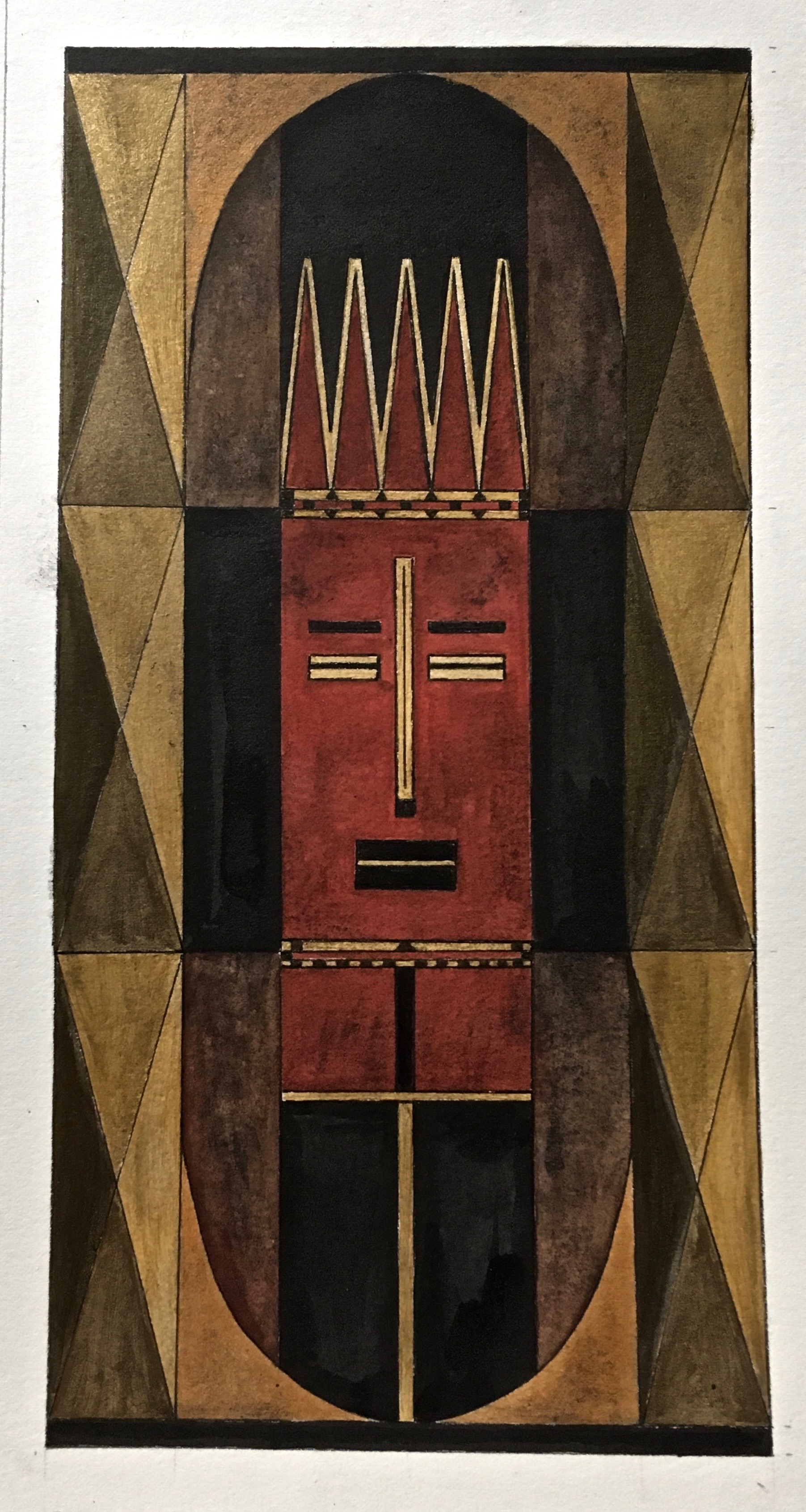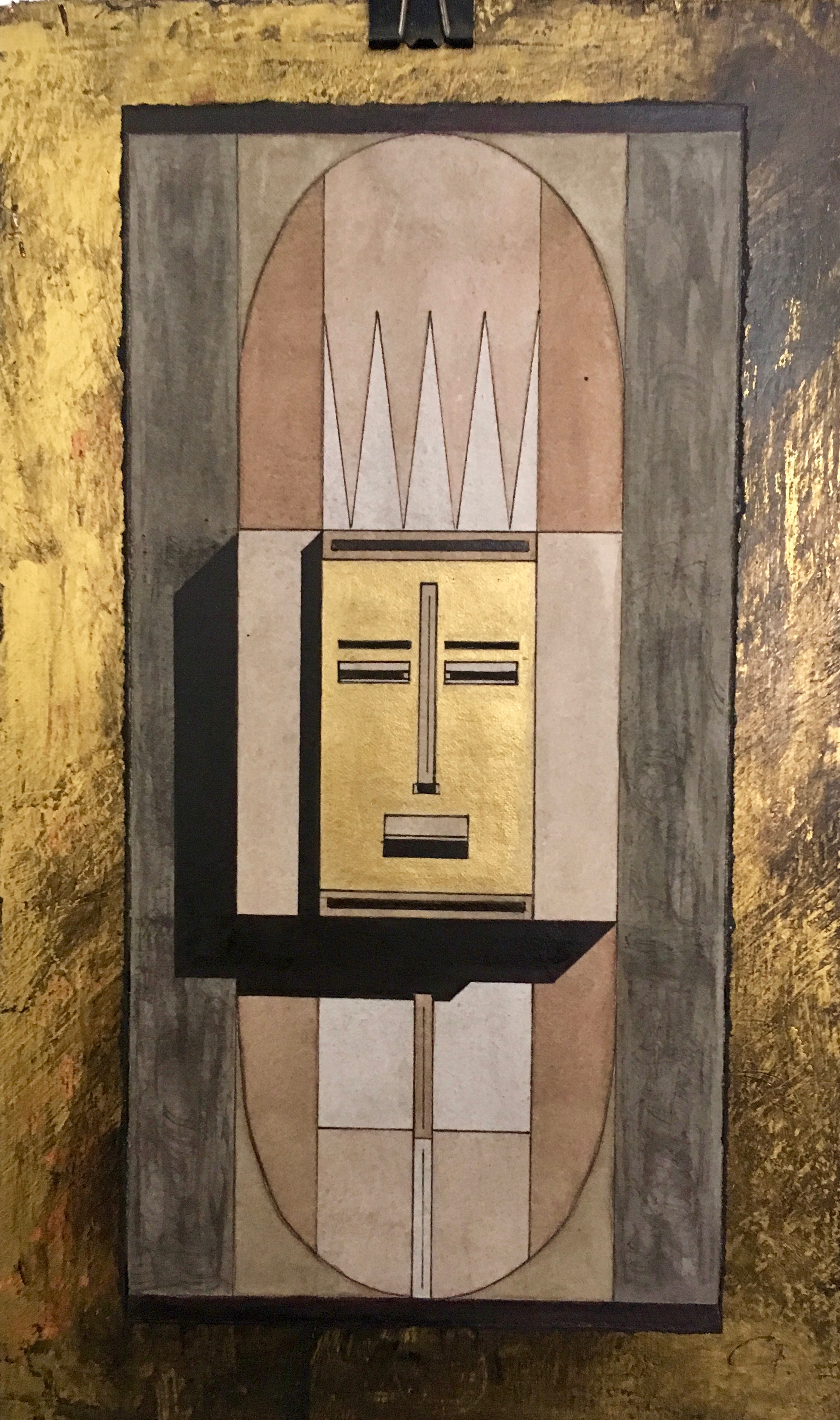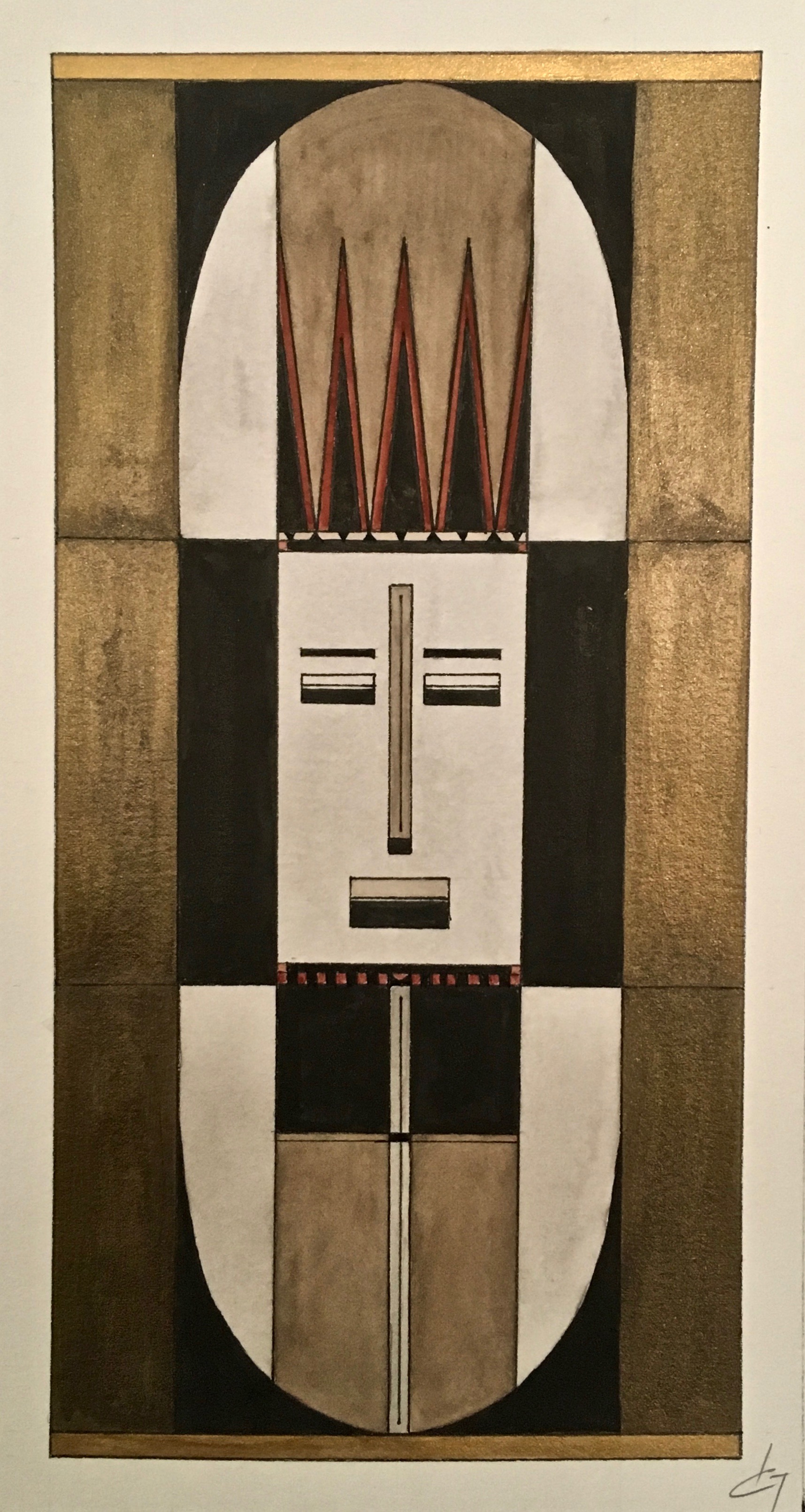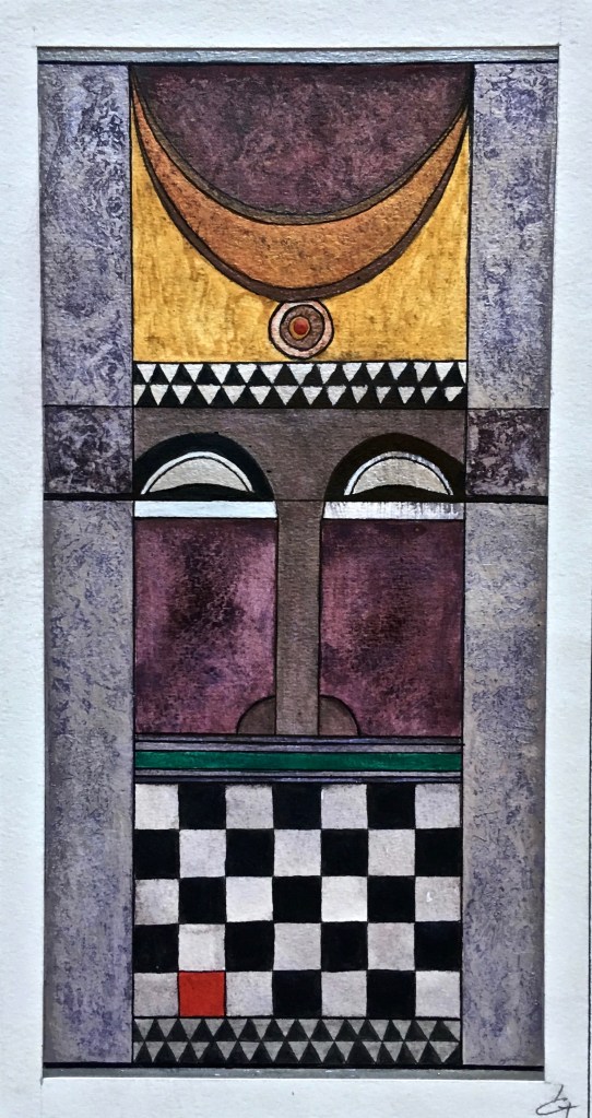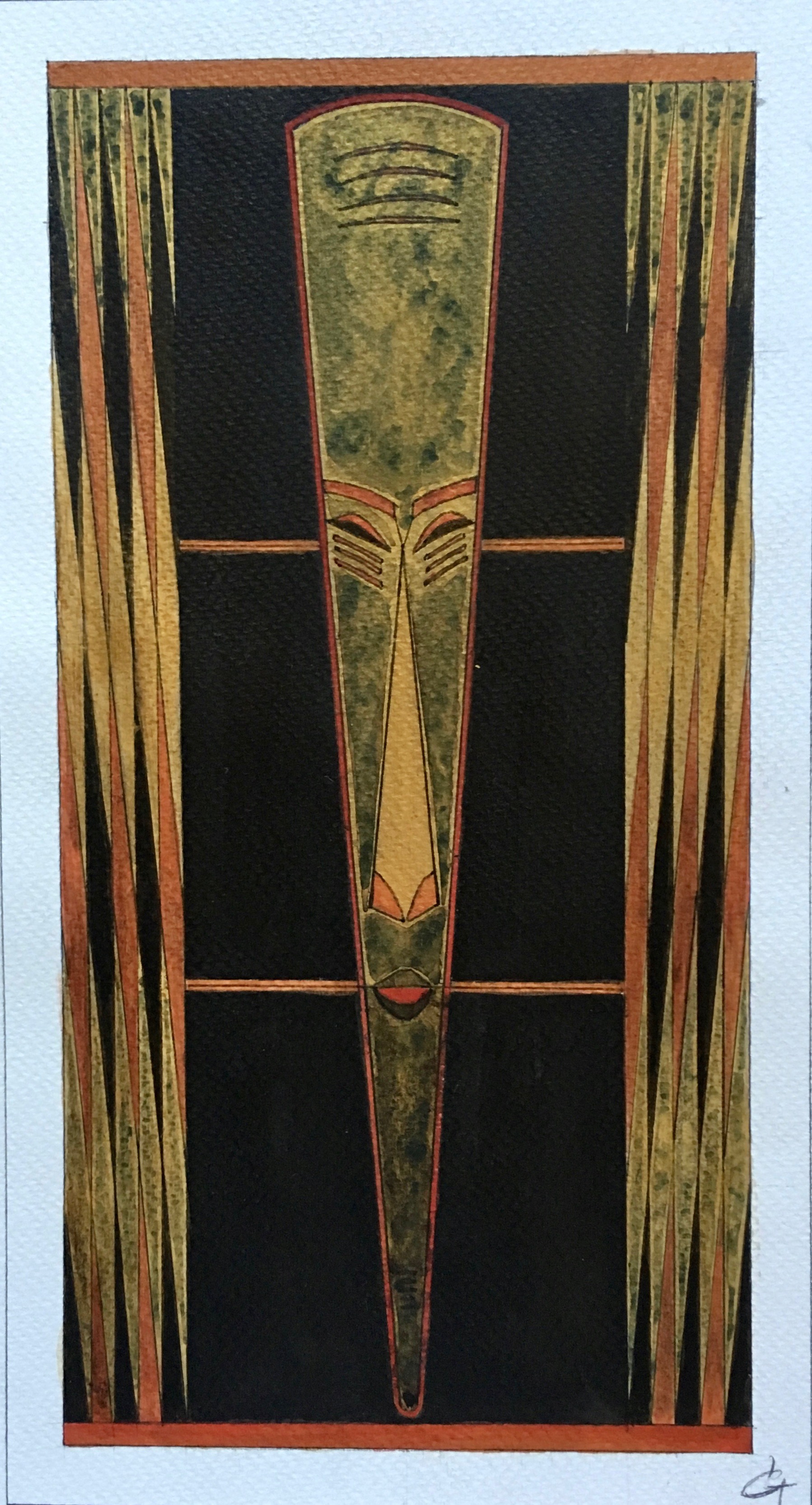 La technique est mixte (aquarelle, encre, acrylique) sur papier. Les couleurs chaudes et vives côtoient les touches dorées qui évoquent les icônes.