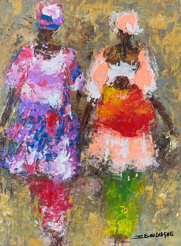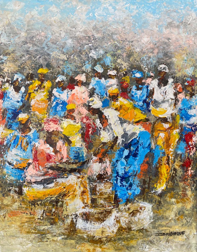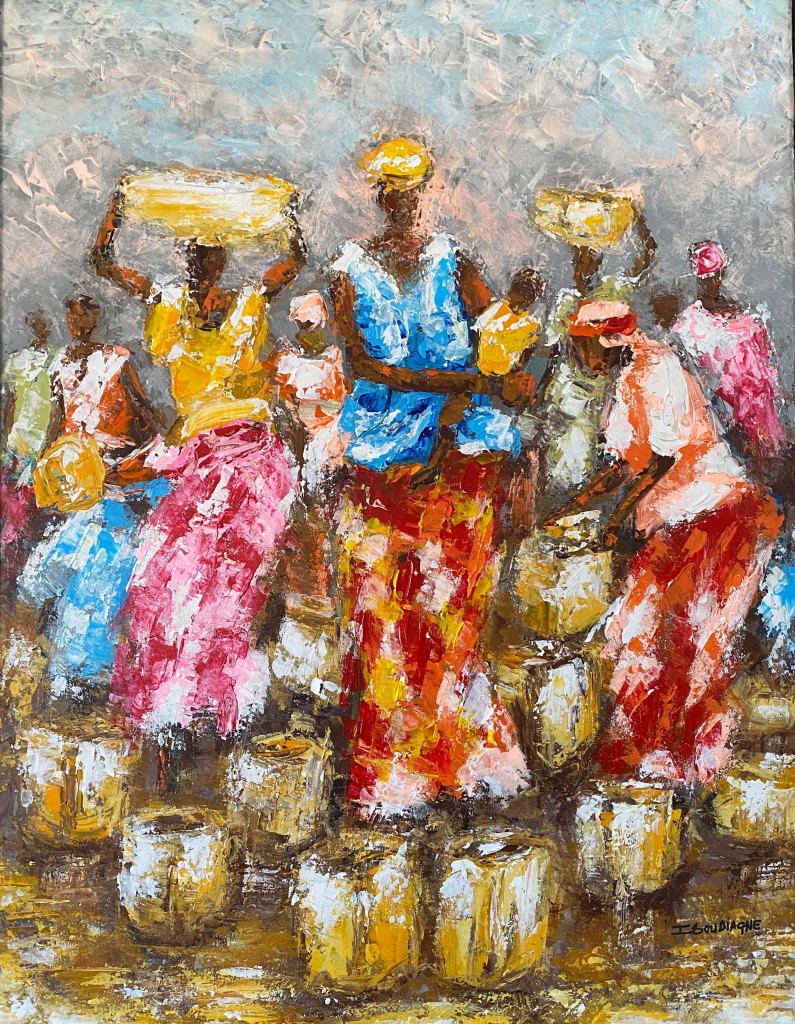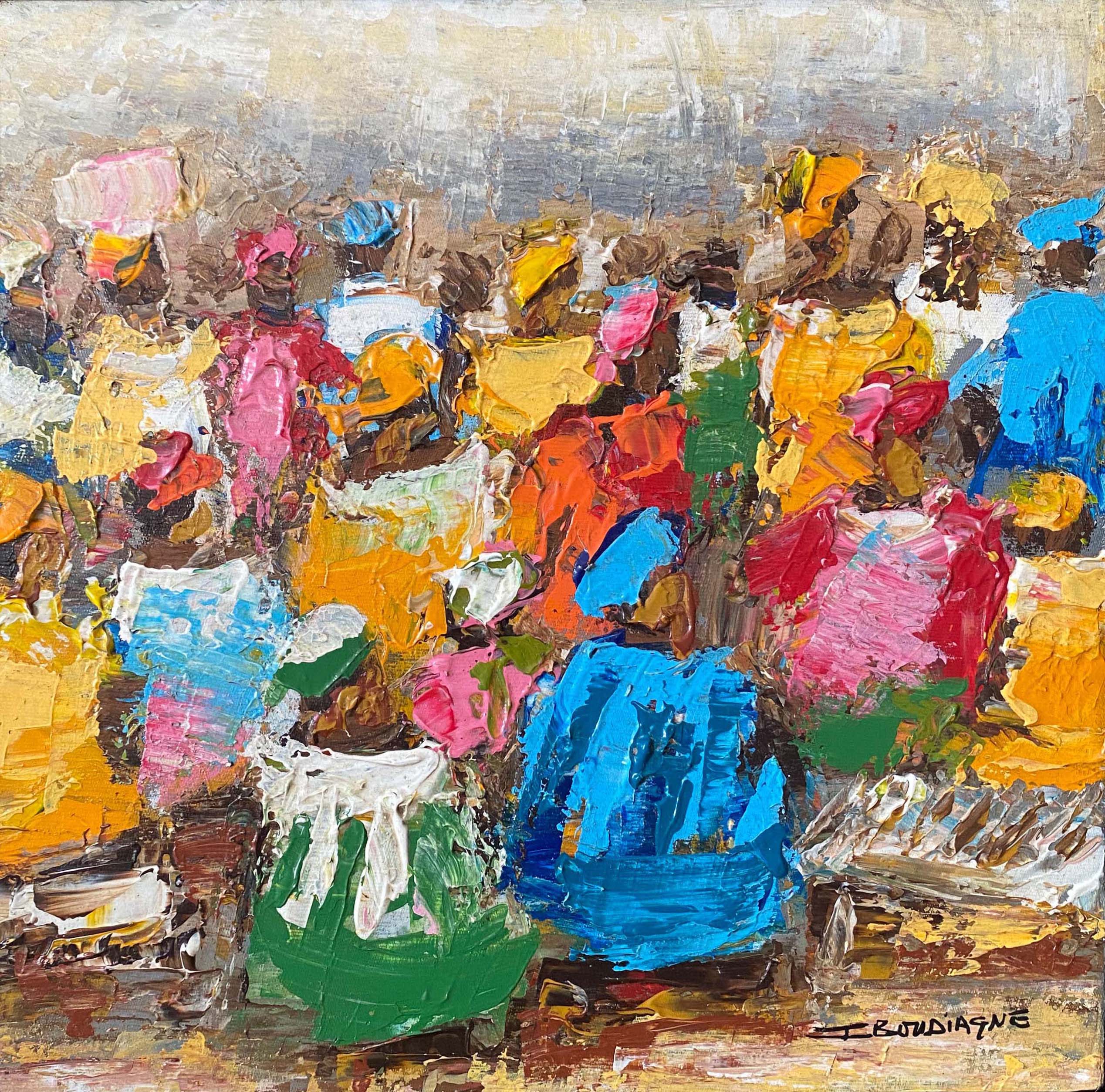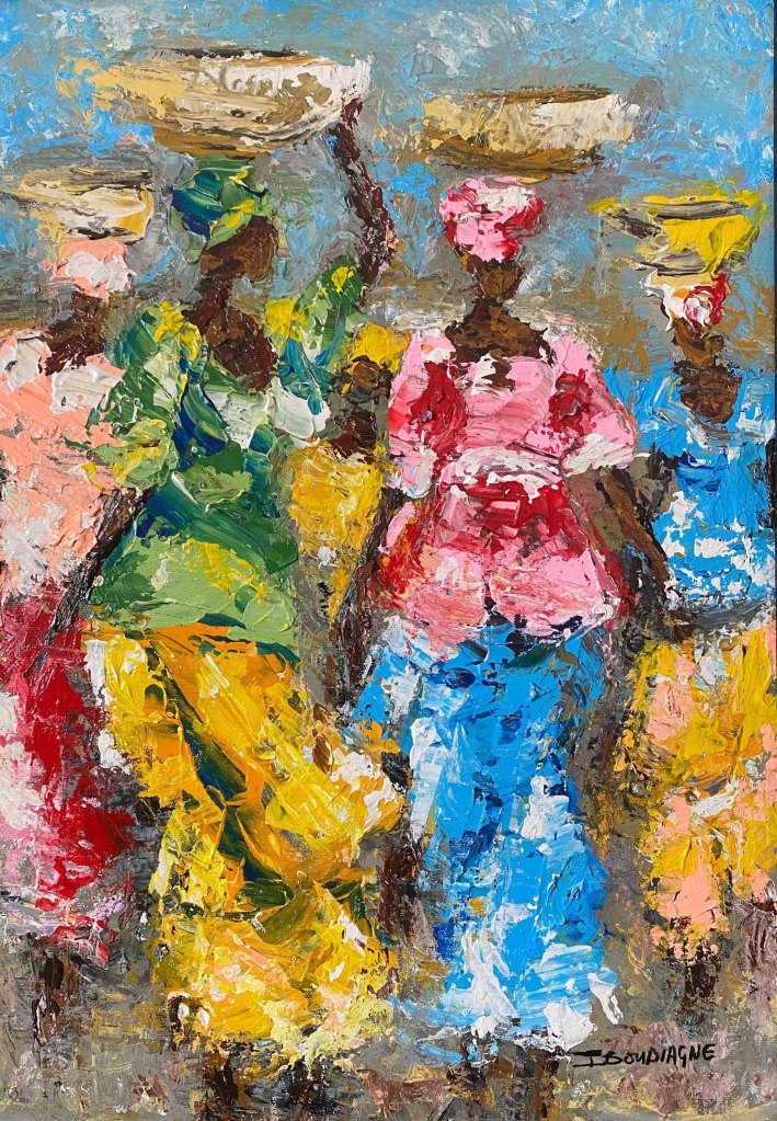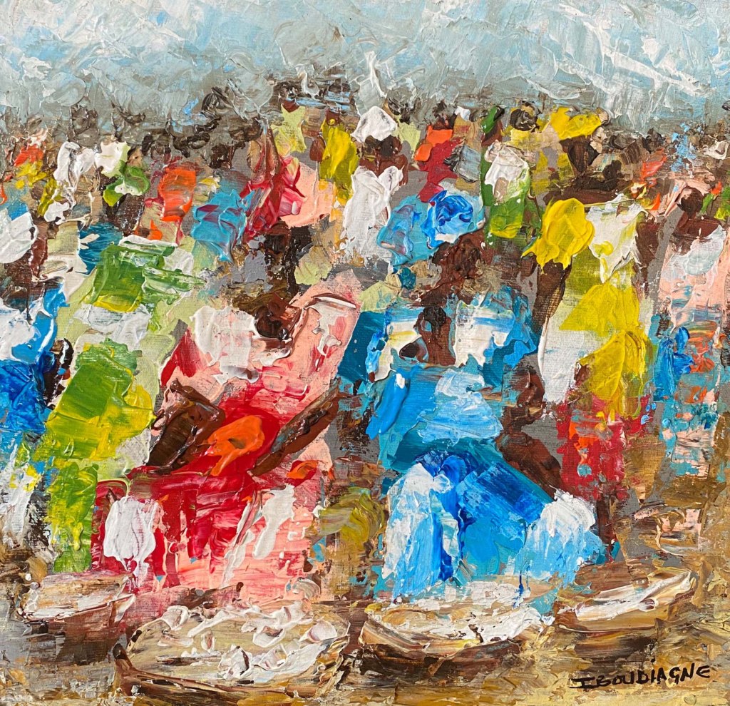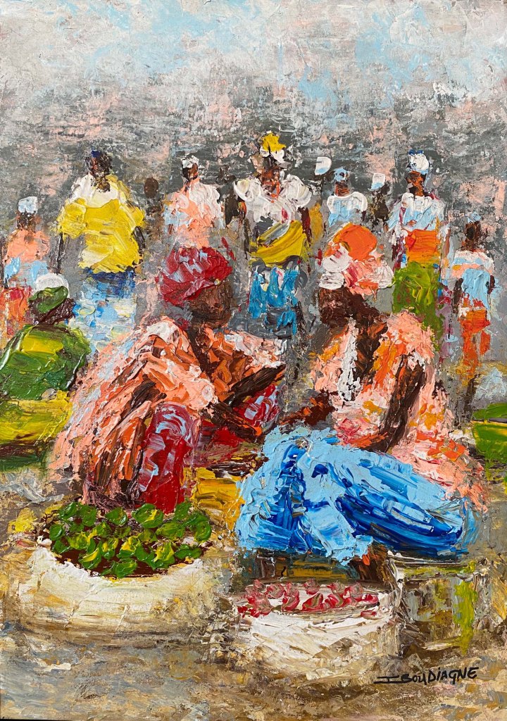 A travers sa démarche artistique, il porte un regard toujours bienveillant sur la société. De ses touches de couleurs chatoyantes inspirées par les grands maîtres de l’impressionnisme, il représente la foule et magnifie le travail des femmes au marché, aux champs. La préoccupation d’Ibou Diagne est de fixer une vision fugitive de la réalité changeante qui se traduit par sa technique picturale : la juxtaposition des couleurs complémentaires et les couches épaisses de peintures. Ce n’est plus le dessin et le contour qui donnent forme et volume aux choses mais la juxtaposition de touches de couleur.
