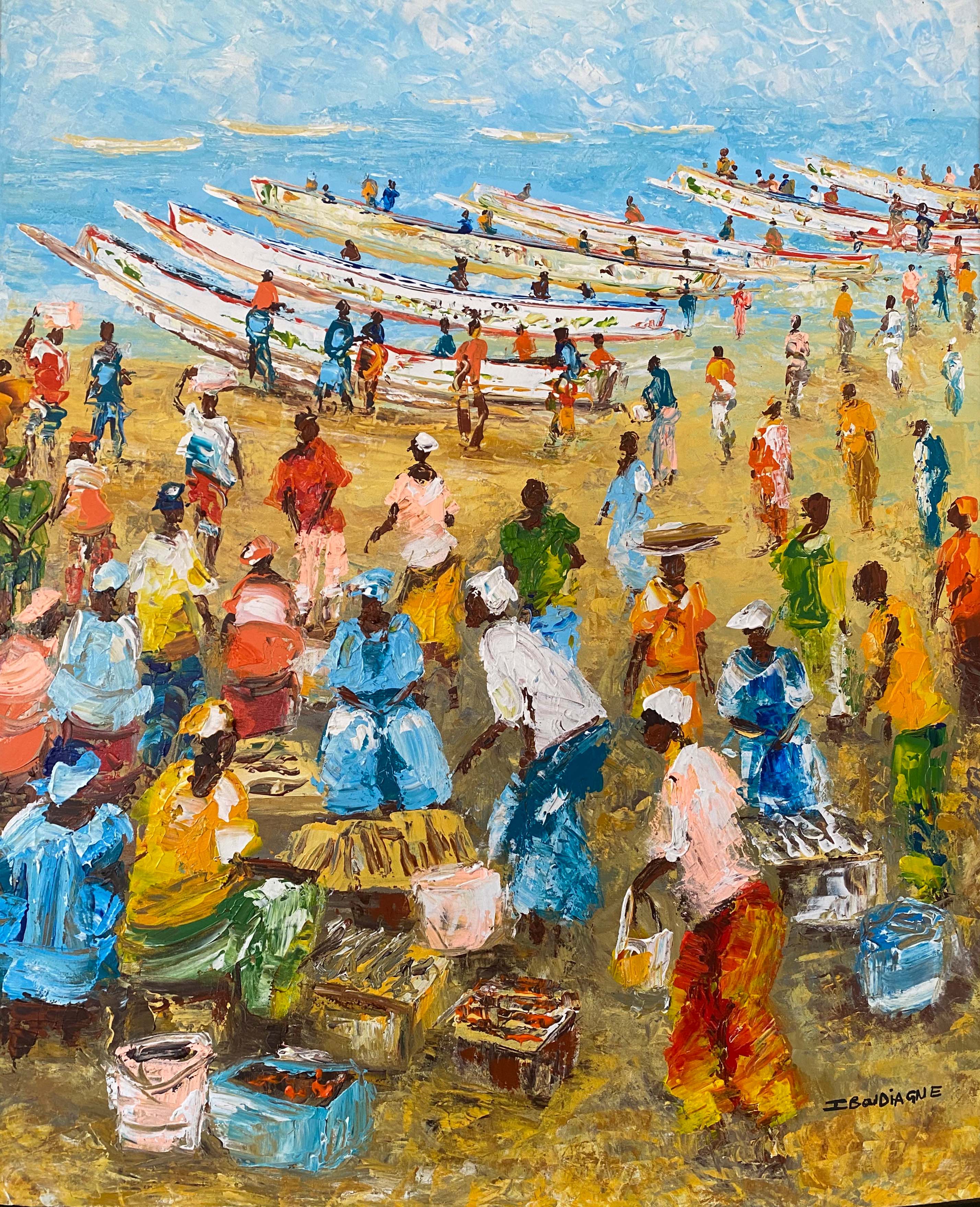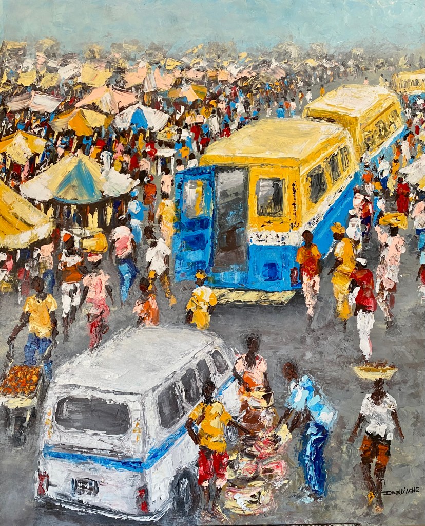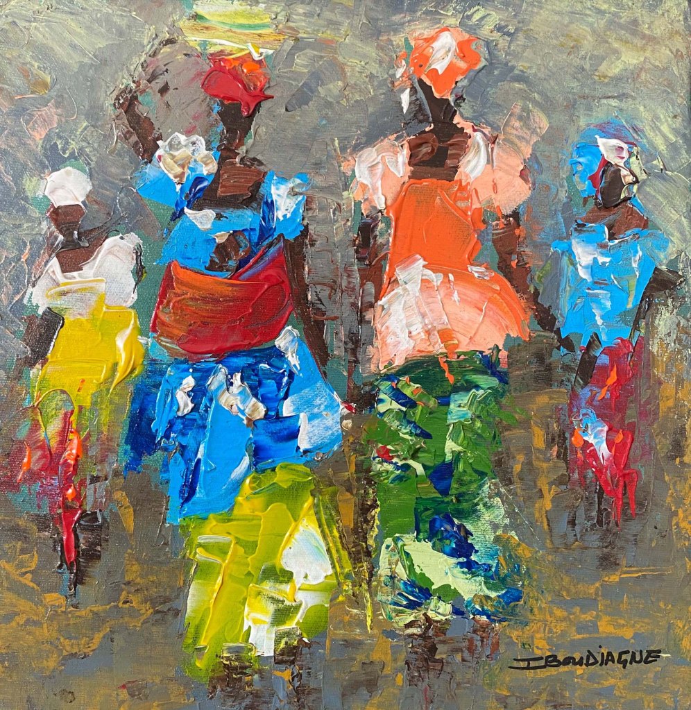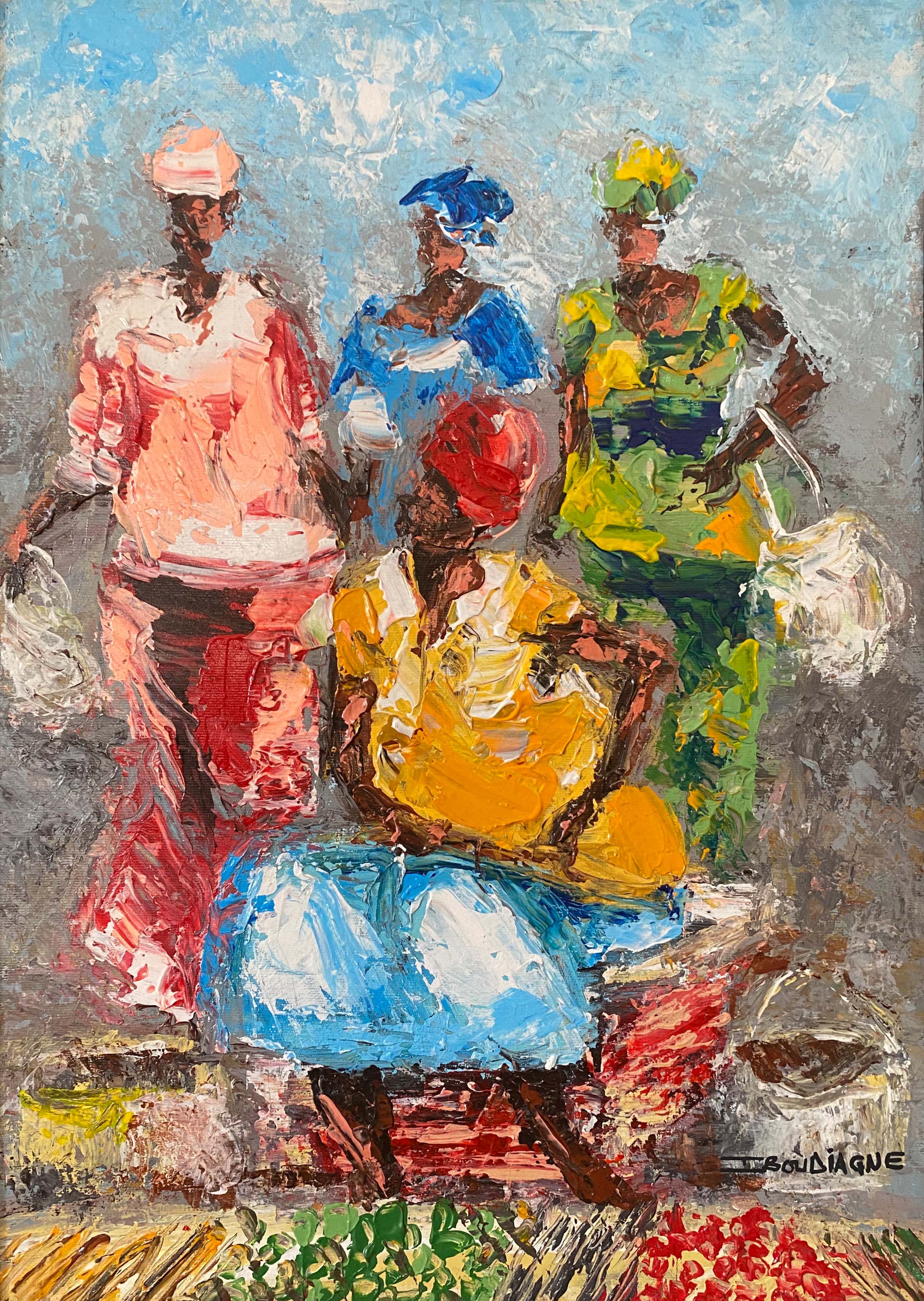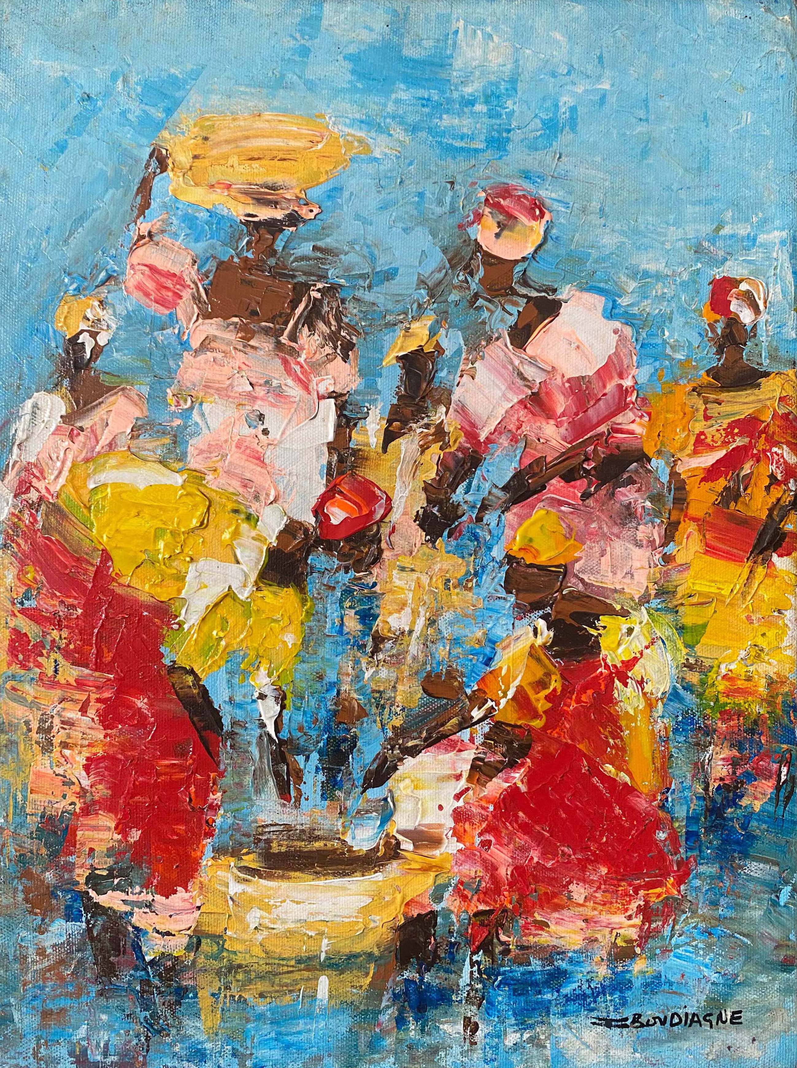 A travers sa démarche artistique, il porte un regard toujours bienveillant sur la société. De ses touches de couleurs chatoyantes inspirées par les grands maîtres de l’impressionnisme, il représente la foule et magnifie le travail des femmes au marché, aux champs. La préoccupation d’Ibou Diagne est de fixer une vision fugitive de la réalité changeante qui se traduit par sa technique picturale : la juxtaposition des couleurs complémentaires et les couches épaisses de peintures. Ce n’est plus le dessin et le contour qui donnent forme et volume aux choses mais la juxtaposition de touches de couleur.
