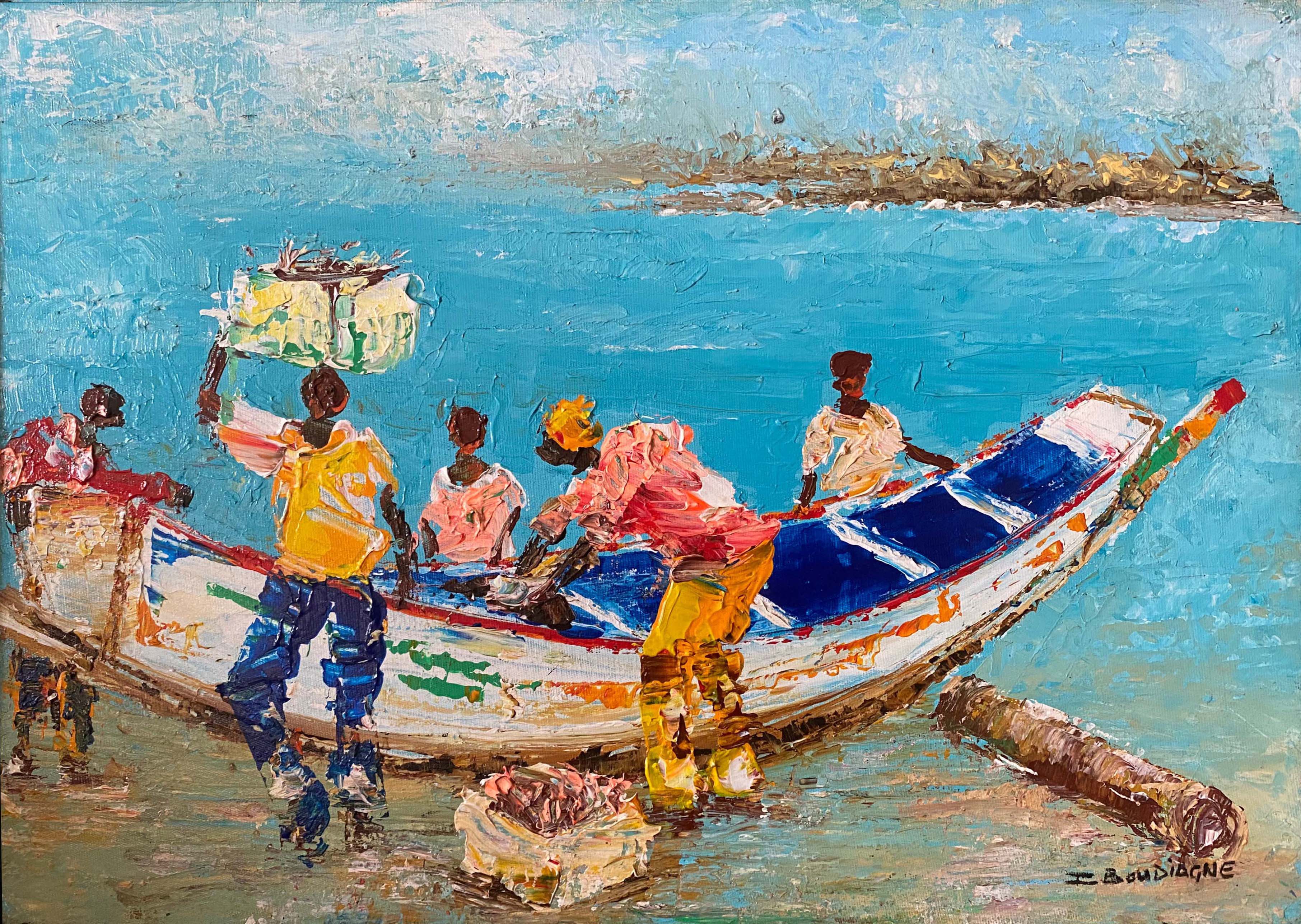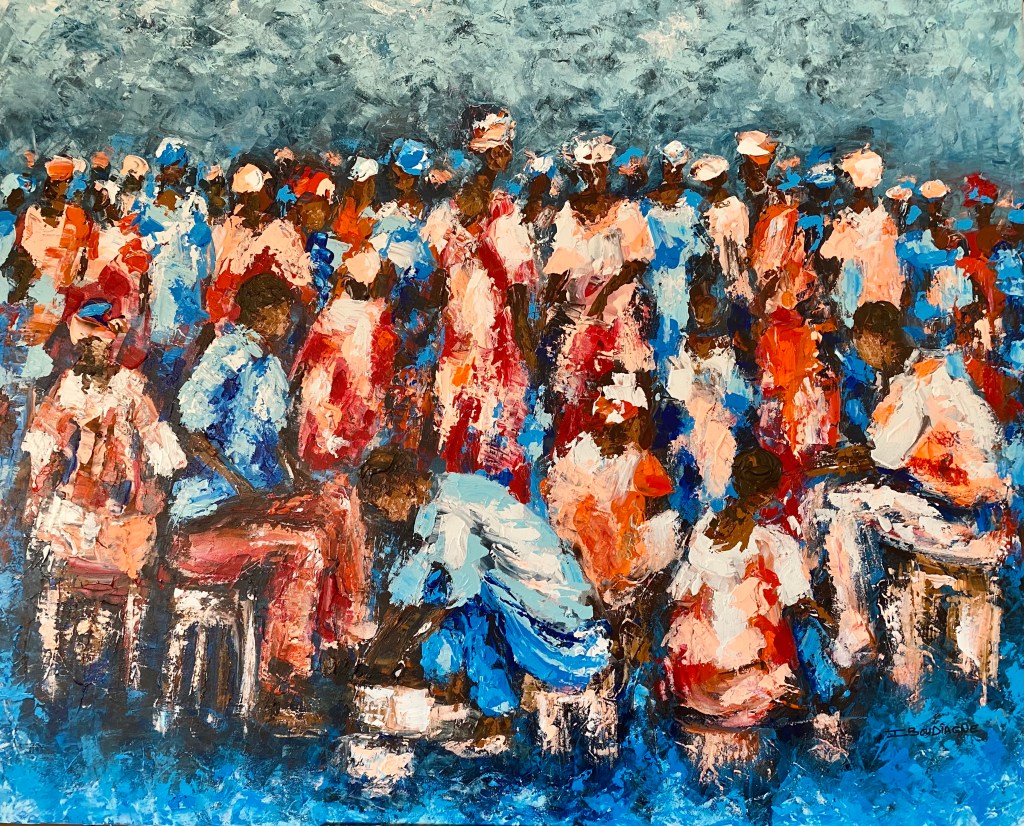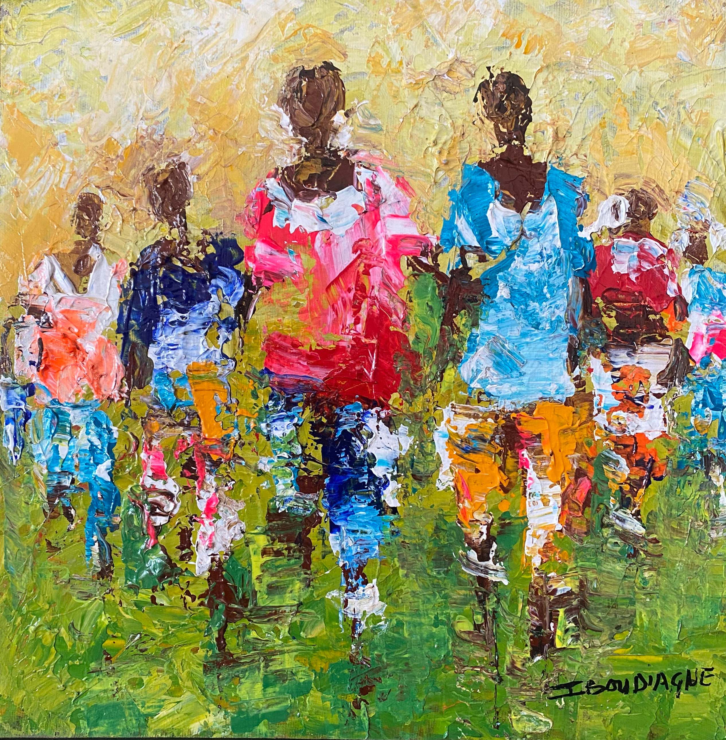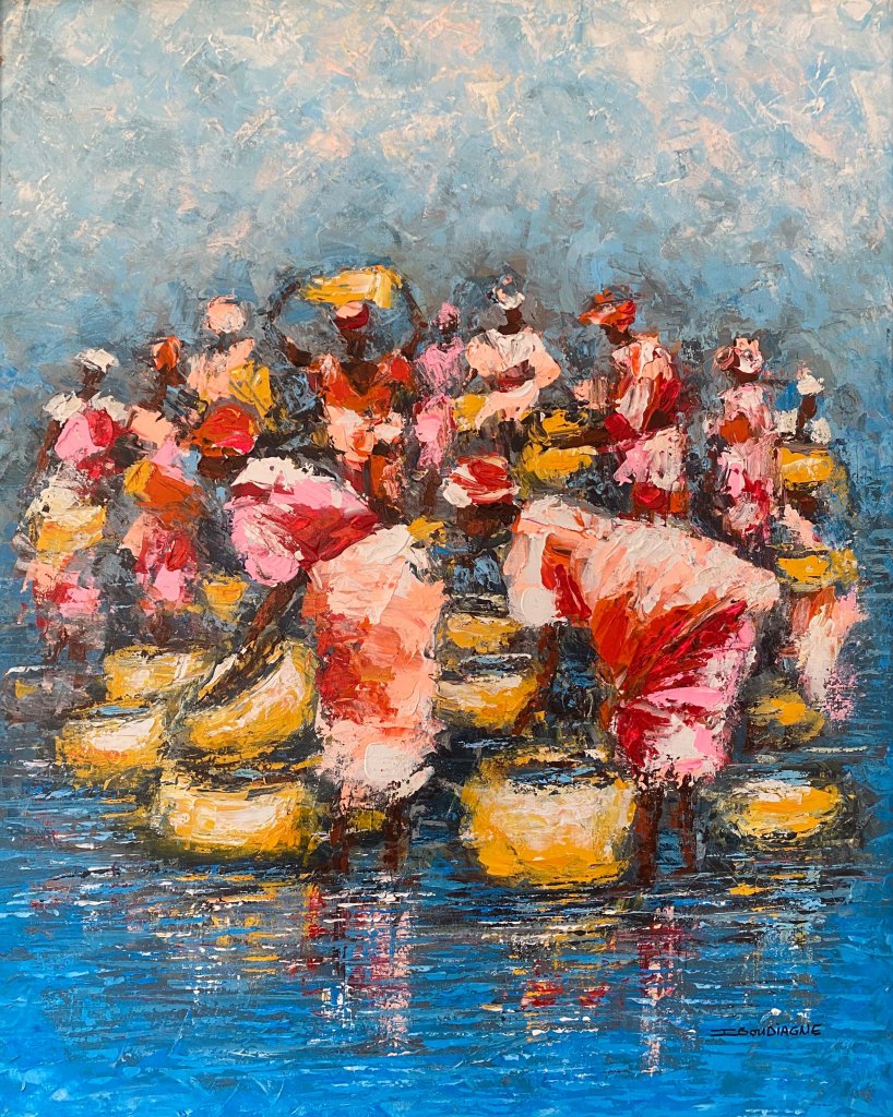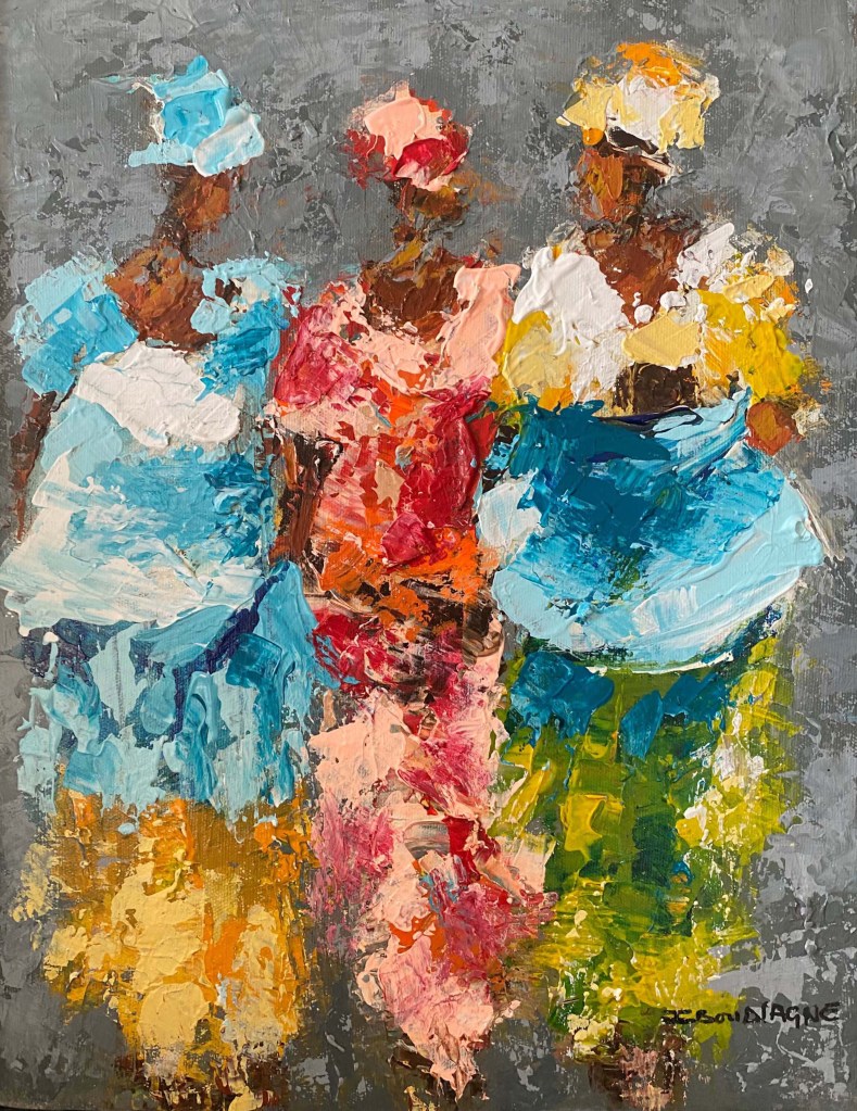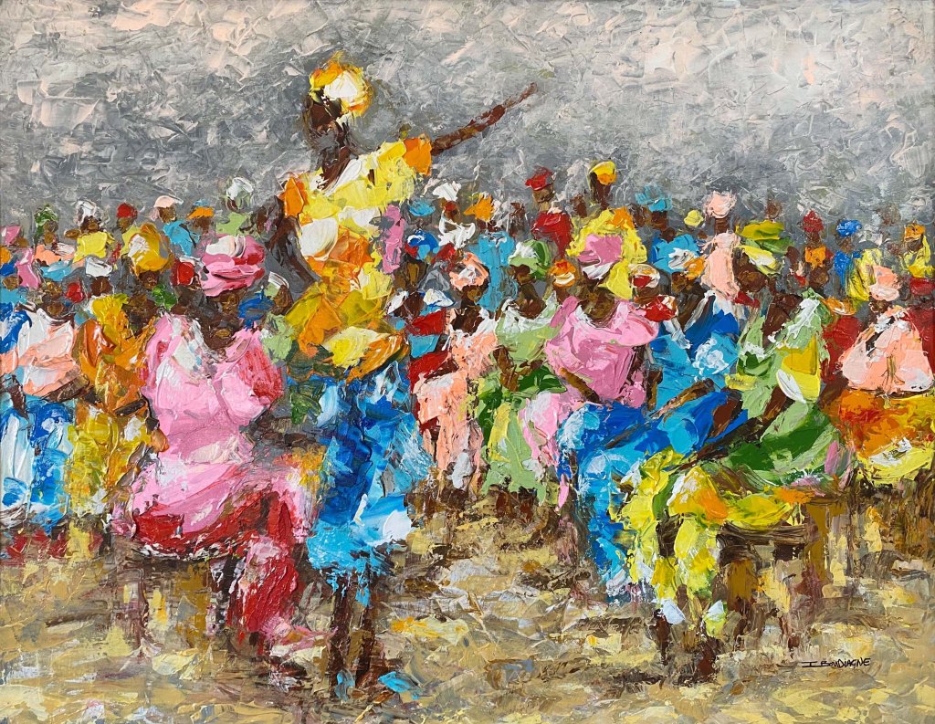 A travers sa démarche artistique, il porte un regard toujours bienveillant sur la société. De ses touches de couleurs chatoyantes inspirées par les grands maîtres de l’impressionnisme, il représente la foule et magnifie le travail des femmes au marché, aux champs. La préoccupation d’Ibou Diagne est de fixer une vision fugitive de la réalité changeante qui se traduit par sa technique picturale : la juxtaposition des couleurs complémentaires et les couches épaisses de peintures. Ce n’est plus le dessin et le contour qui donnent forme et volume aux choses mais la juxtaposition de touches de couleur.