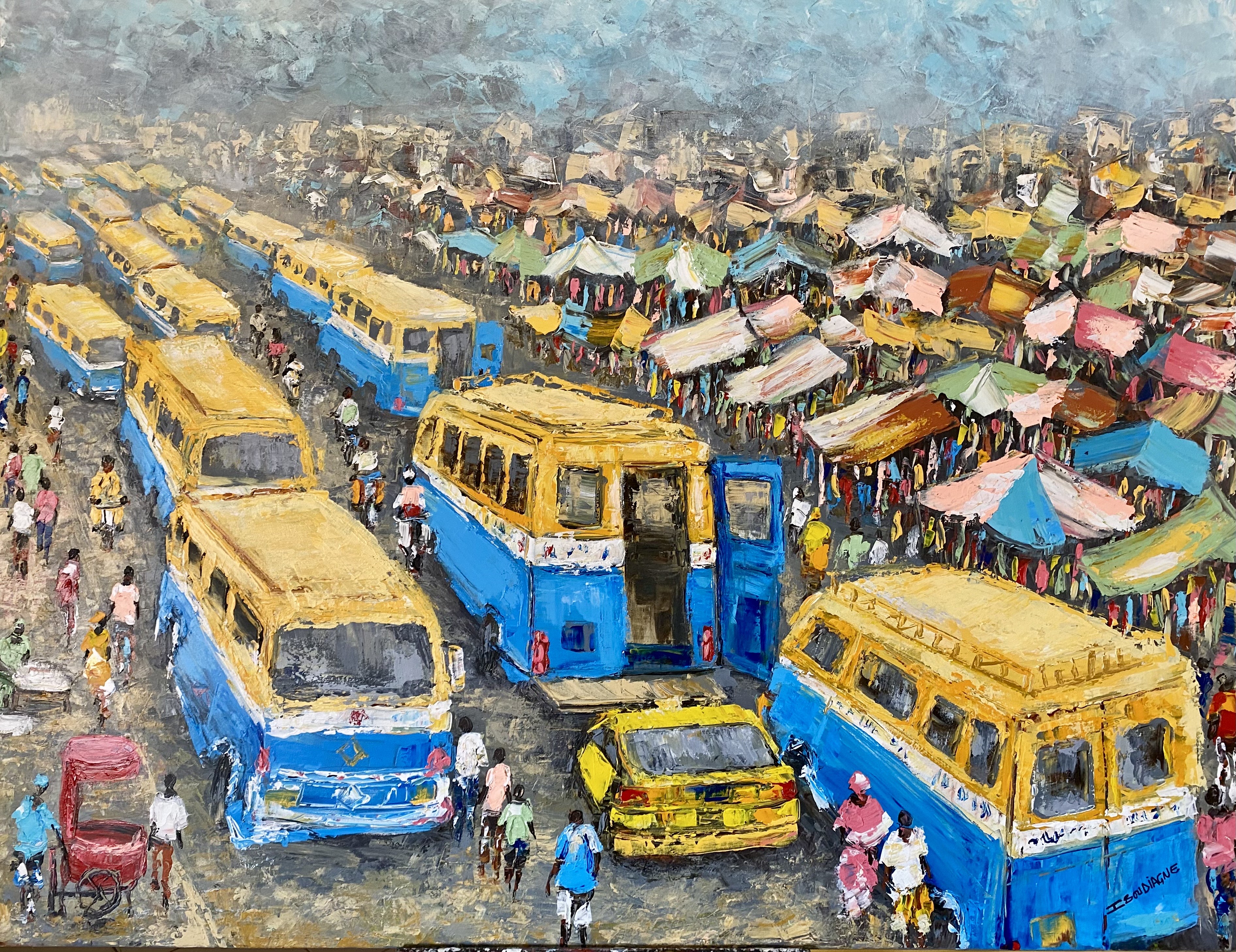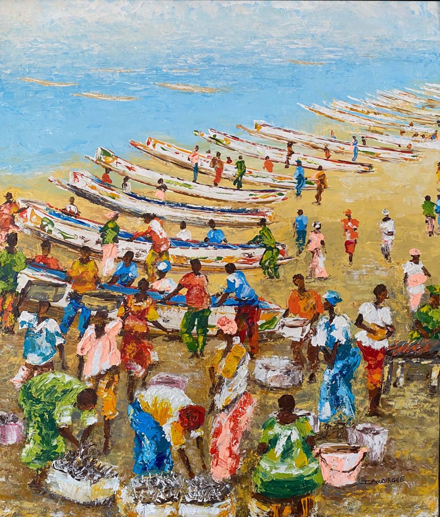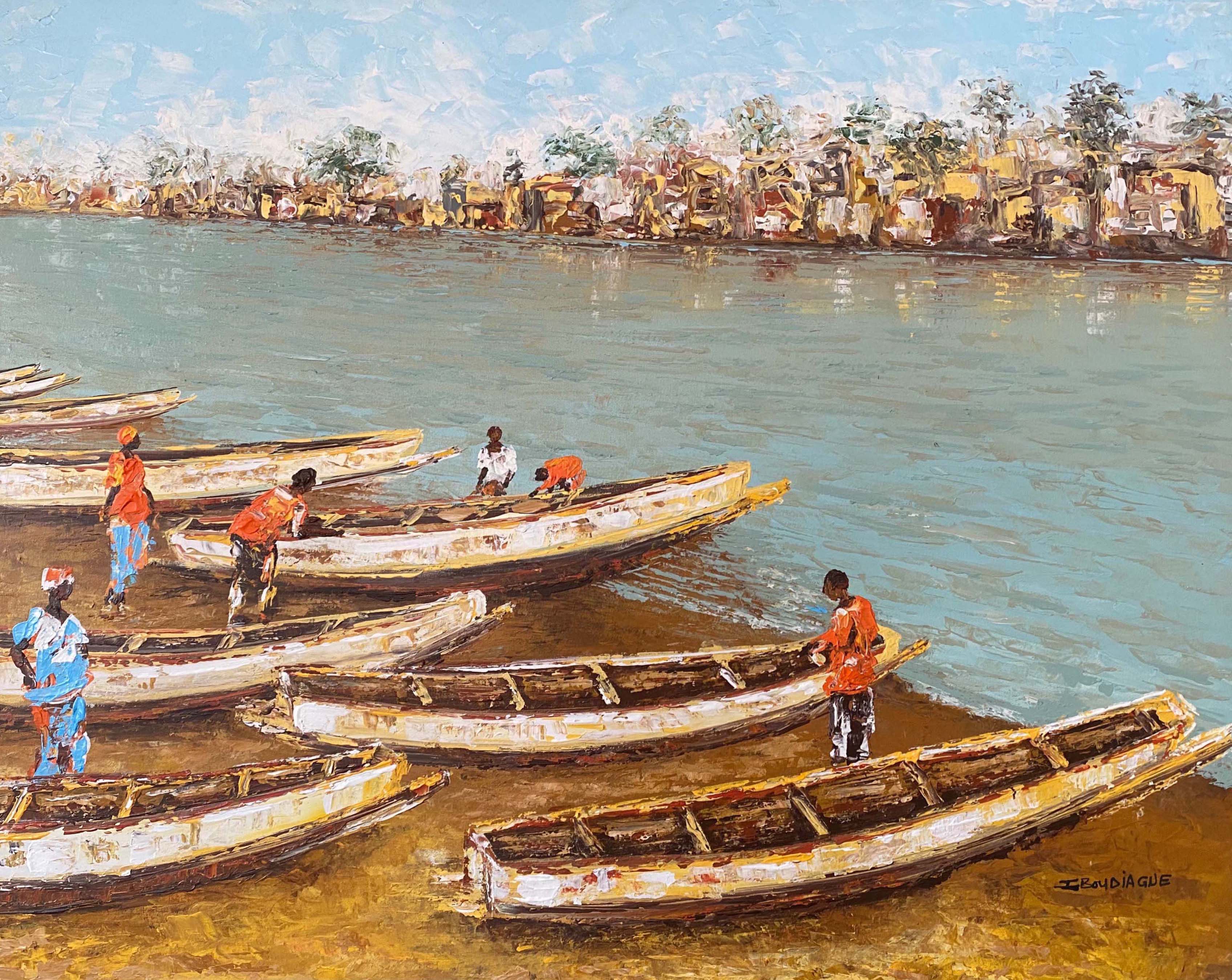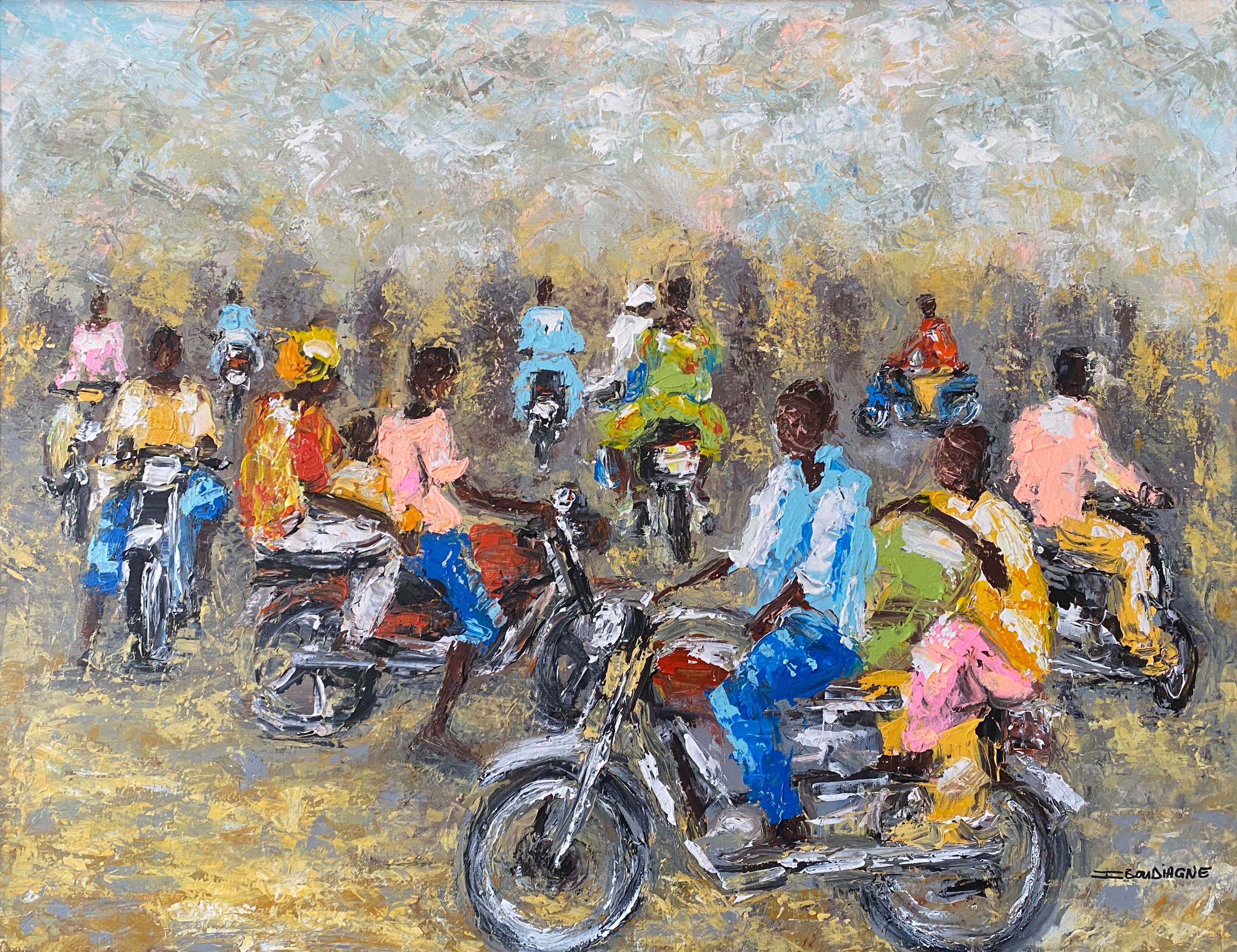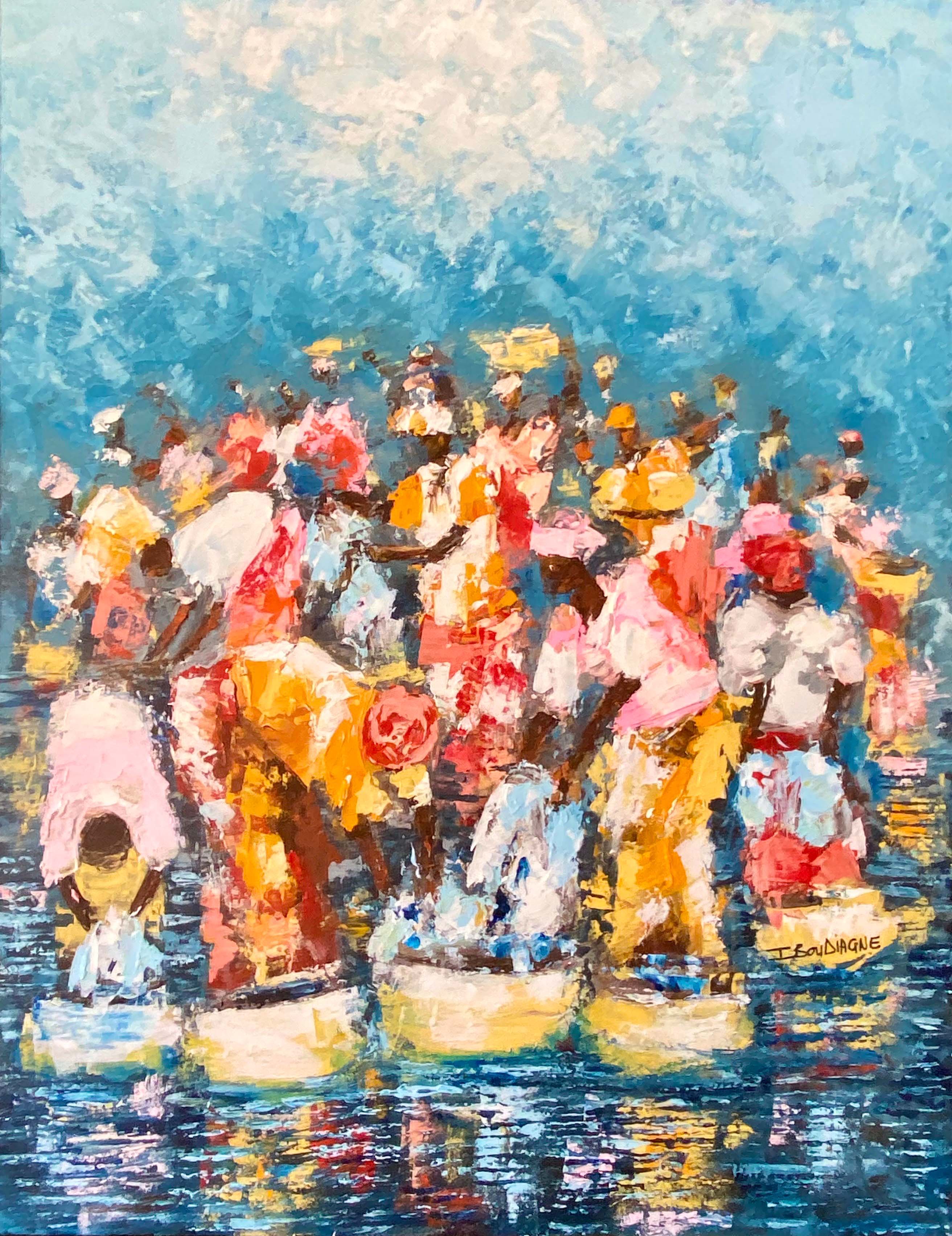 A travers sa démarche artistique, il porte un regard toujours bienveillant sur la société. De ses touches de couleurs chatoyantes inspirées par les grands maîtres de l’impressionnisme, il représente la foule et magnifie le travail des femmes au marché, aux champs. La préoccupation d’Ibou Diagne est de fixer une vision fugitive de la réalité changeante qui se traduit par sa technique picturale : la juxtaposition des couleurs complémentaires et les couches épaisses de peintures. Ce n’est plus le dessin et le contour qui donnent forme et volume aux choses mais la juxtaposition de touches de couleur.
