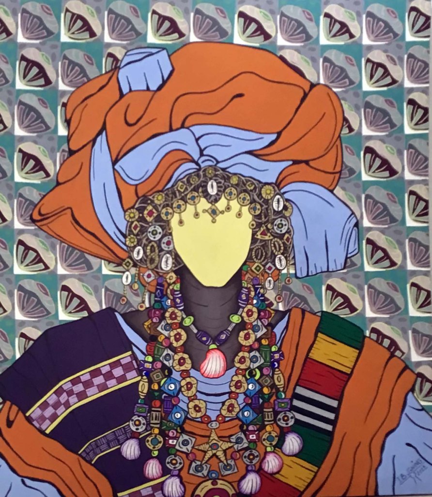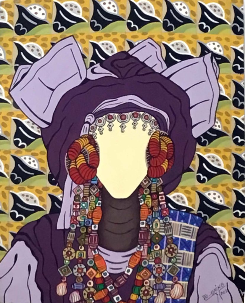 Les visages de ses personnages sont blancs car ils passent au second plan, mettant d’avantage l’accent sur les costumes et les sublimes parures composées de perles anciennes en terre cuite ou verre de venise et de libidors (Louis d’or).