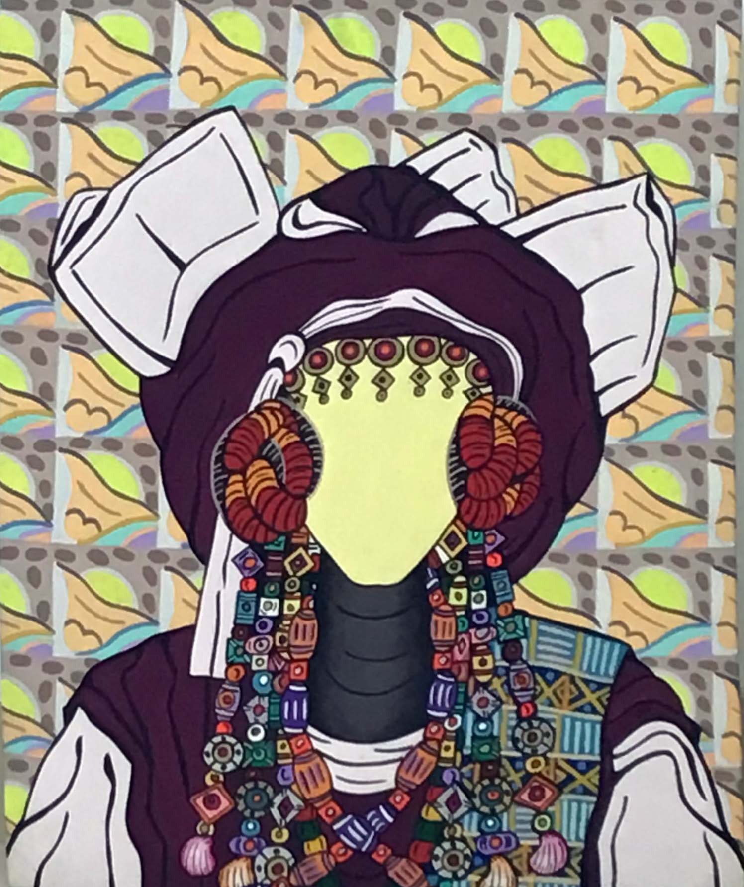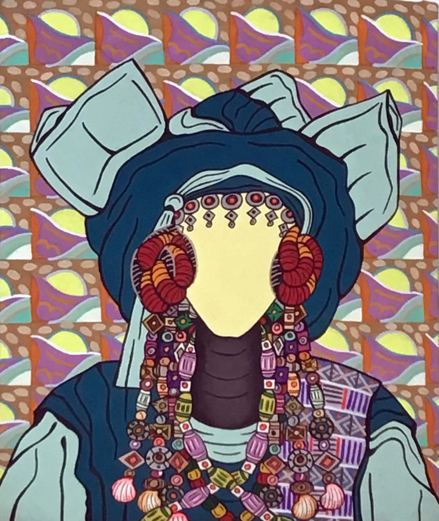 Les visages de ses personnages sont blancs car ils passent au second plan, mettant d’avantage l’accent sur les costumes et les sublimes parures composées de perles anciennes en terre cuite ou verre de venise et de libidors (Louis d’or).