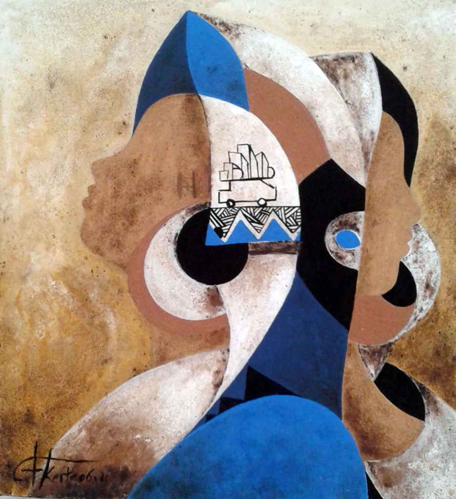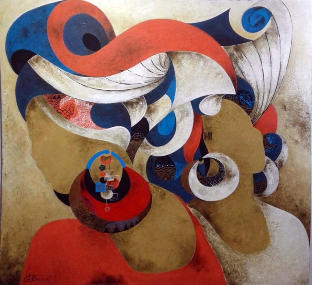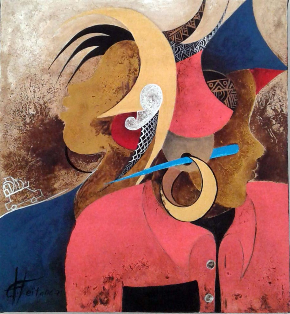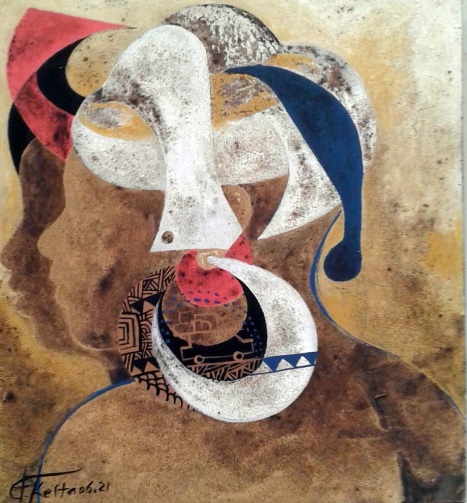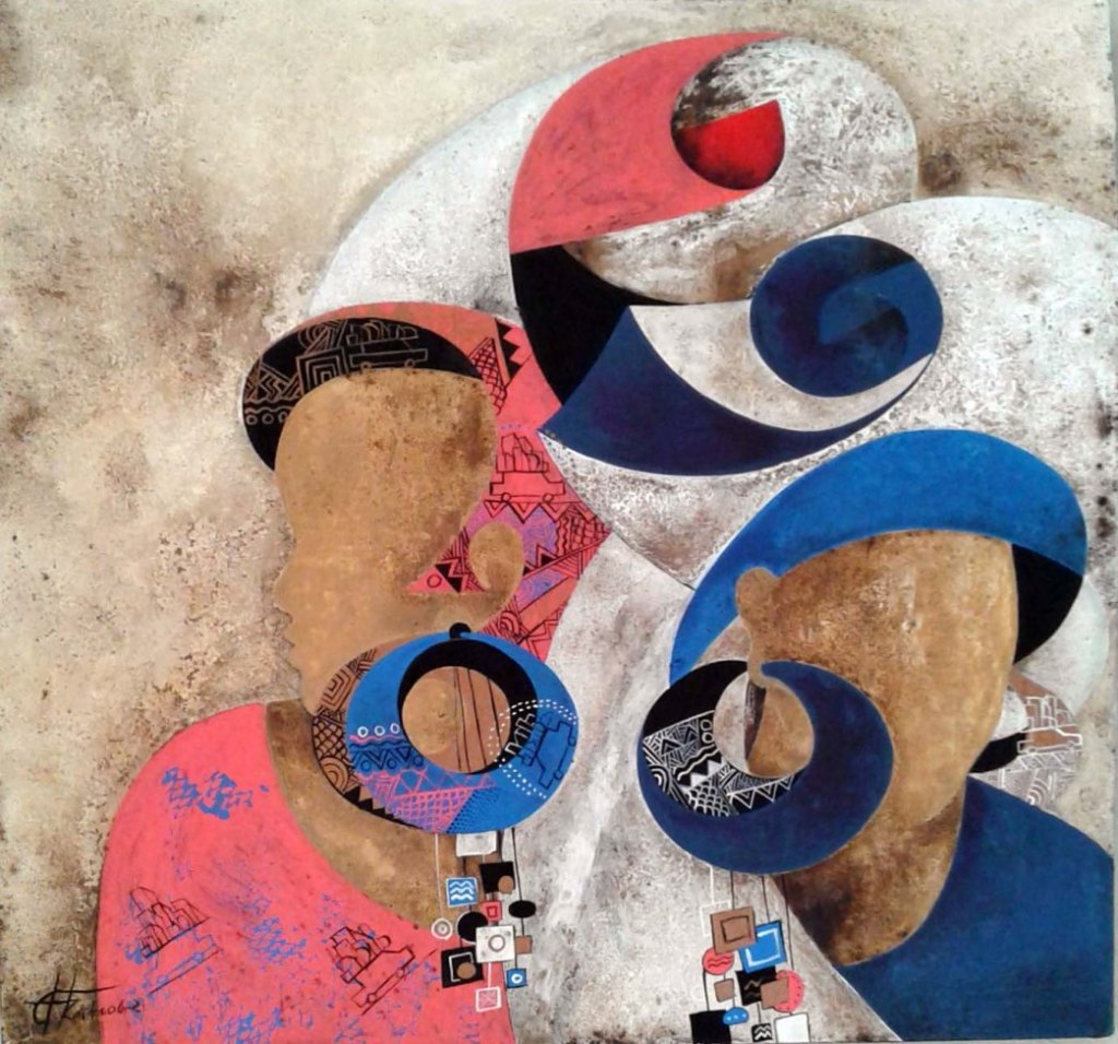 Comme il ne se fixe aucune limite dans son processus de création et se réinvente chaque fois, la dernière série présentée à la Galerie Arte porte sur une inspiration stylisée des Coiffes et Parures qui ornent les visages de l’Afrique traditionnelle.