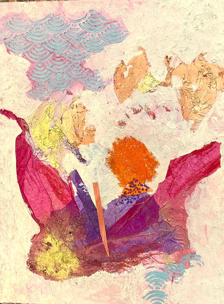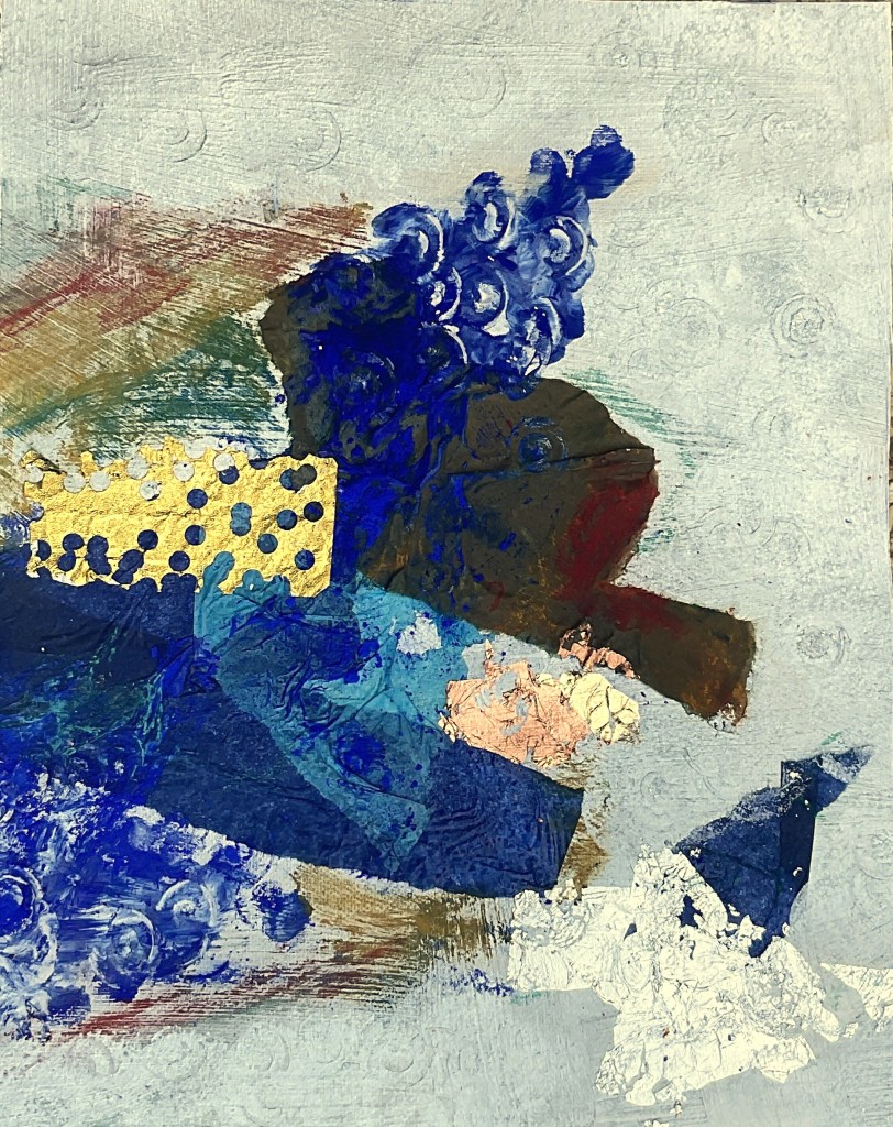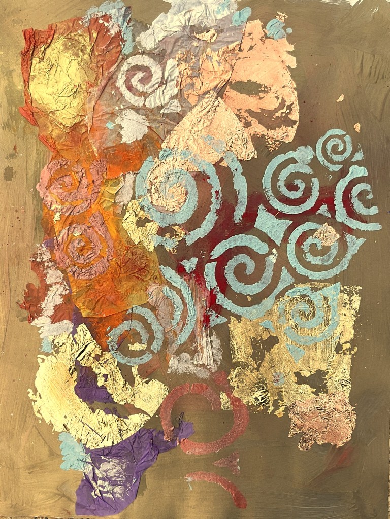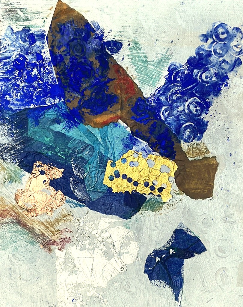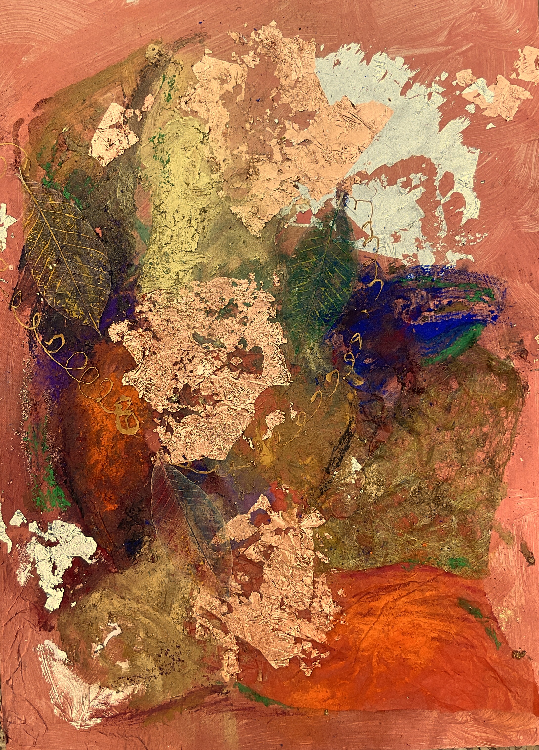 Her artworks—collages, pigments and acrylic on canvas paper—reveal a universe where African earth tones meet the gilded luminosity of the Orient. Pigments, some of them natural, are central to her creative process. Joelle conducts personal research into pigment composition, sometimes using materials gathered from the Senegalese landscape. When she cannot obtain the exact shade she seeks, she blends these natural pigments with purchased ones, crafting a unique palette that balances organic authenticity and contemporary precision.