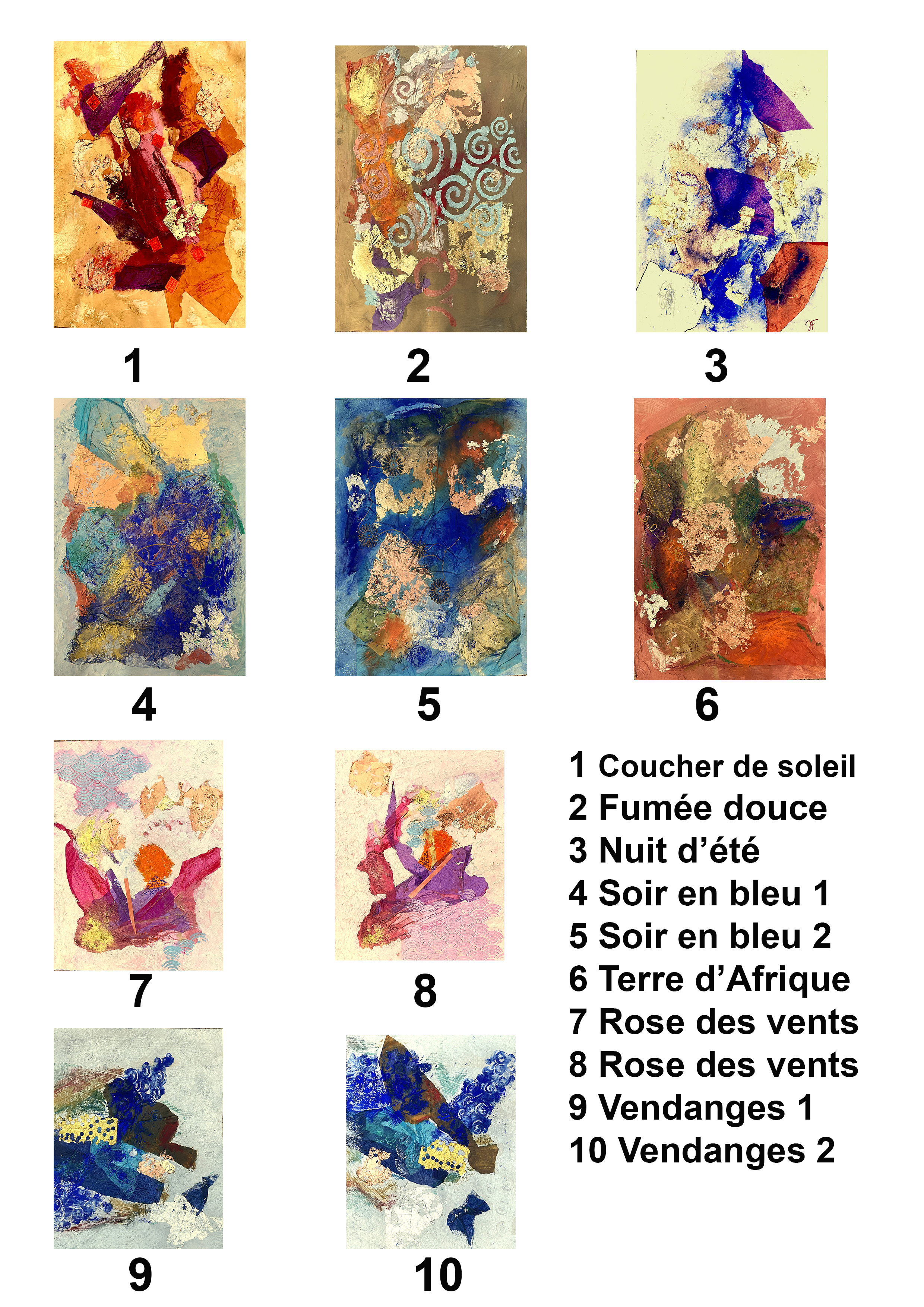 Ayant vécu en Turquie, elle y a développé un goût marqué pour les tons dorés et argentés, inspirés des broderies et étoffes des sultans. Installée au Sénégal depuis plus de quatre décennies, elle s’imprègne des ocres, rouges ferrugineux et terres chaudes africaines, qu’elle transpose dans des compositions vibrantes, texturées, presque telluriques.