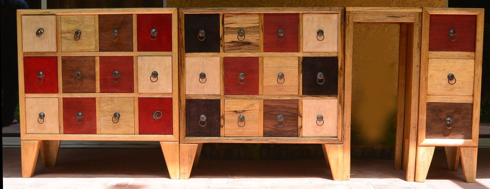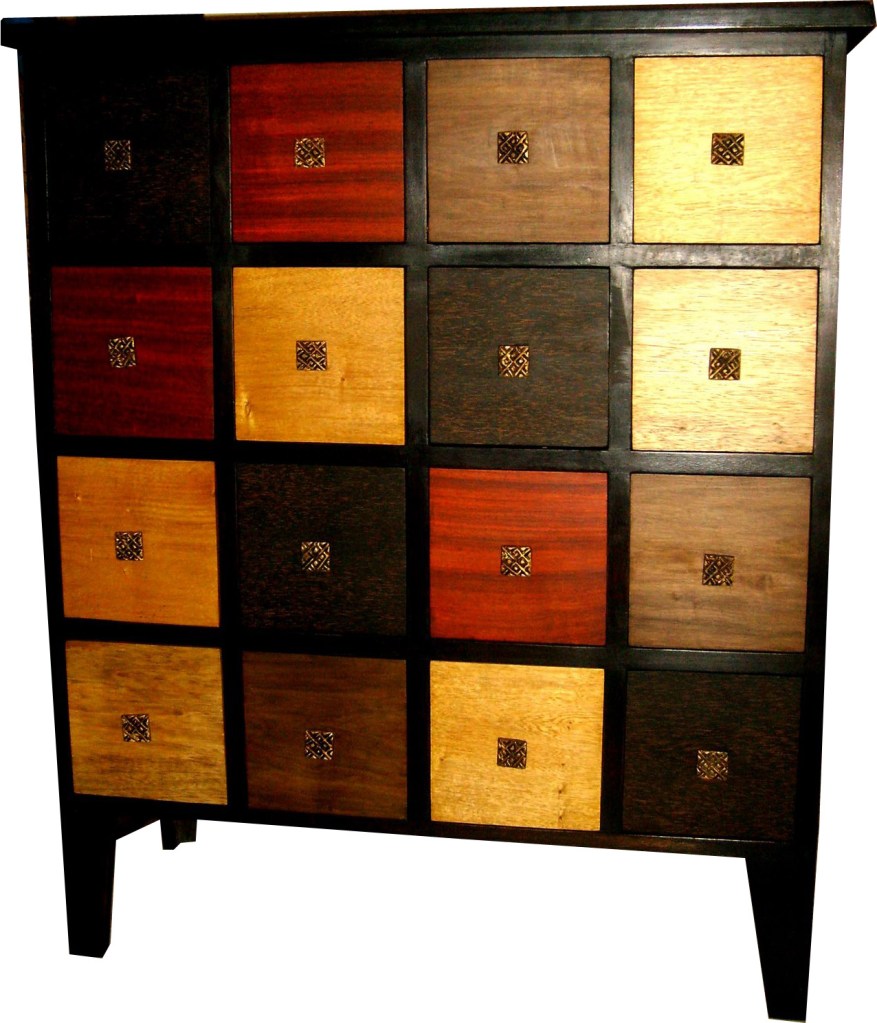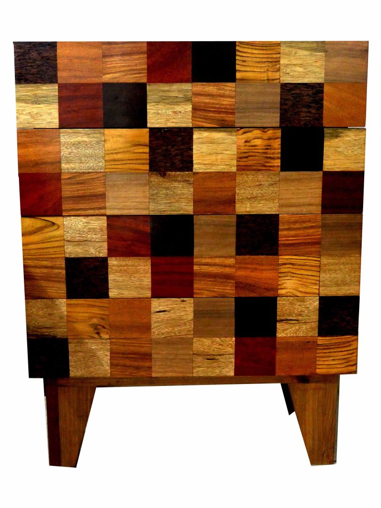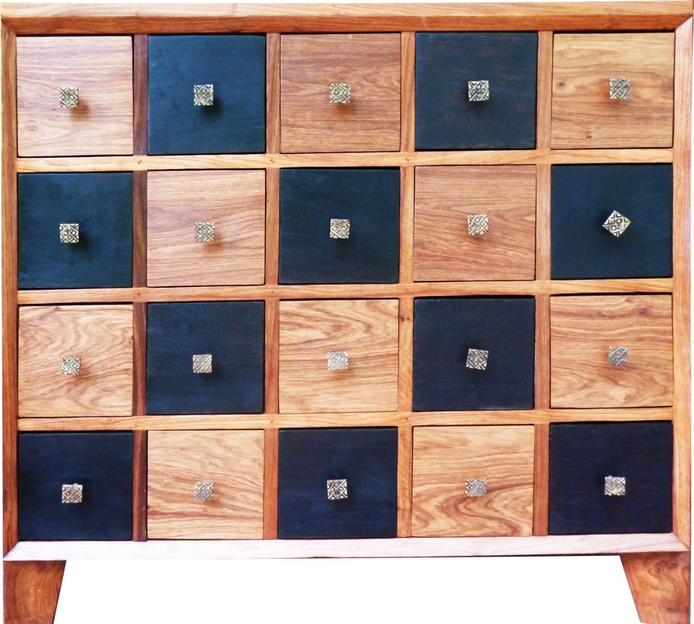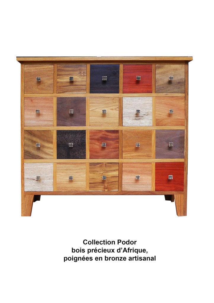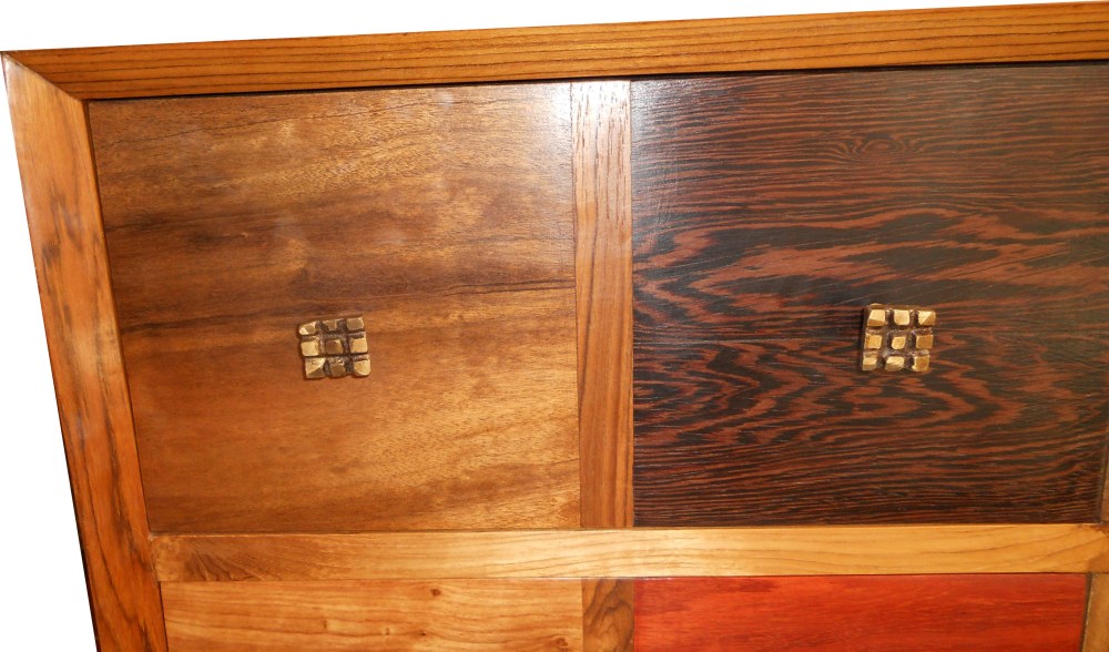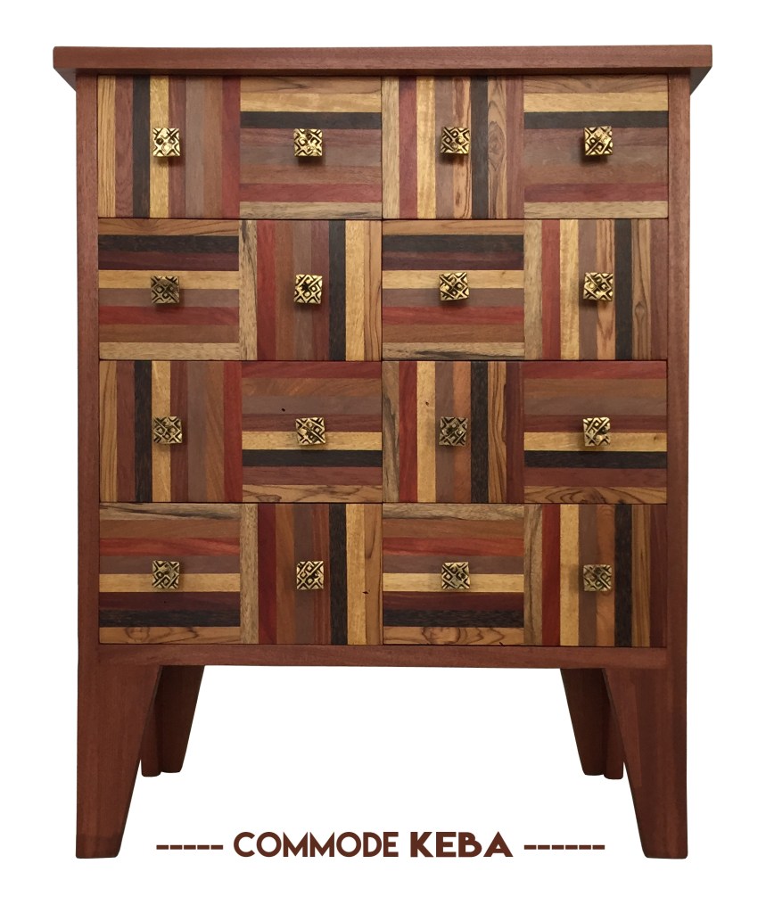 es commodes en patchwork se déclinent de plusieurs façons aux choix : carrés de bois précieux, carrés recouverts de cuir artisanal touareg, carrés de métal laqué, carrés de bois teintés.