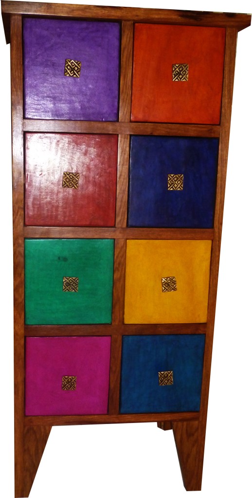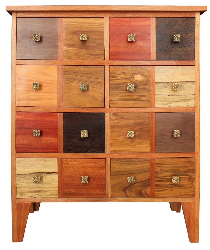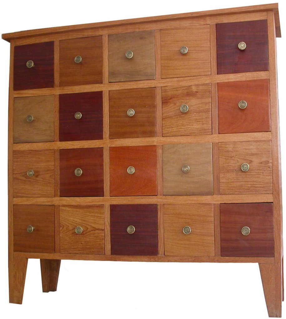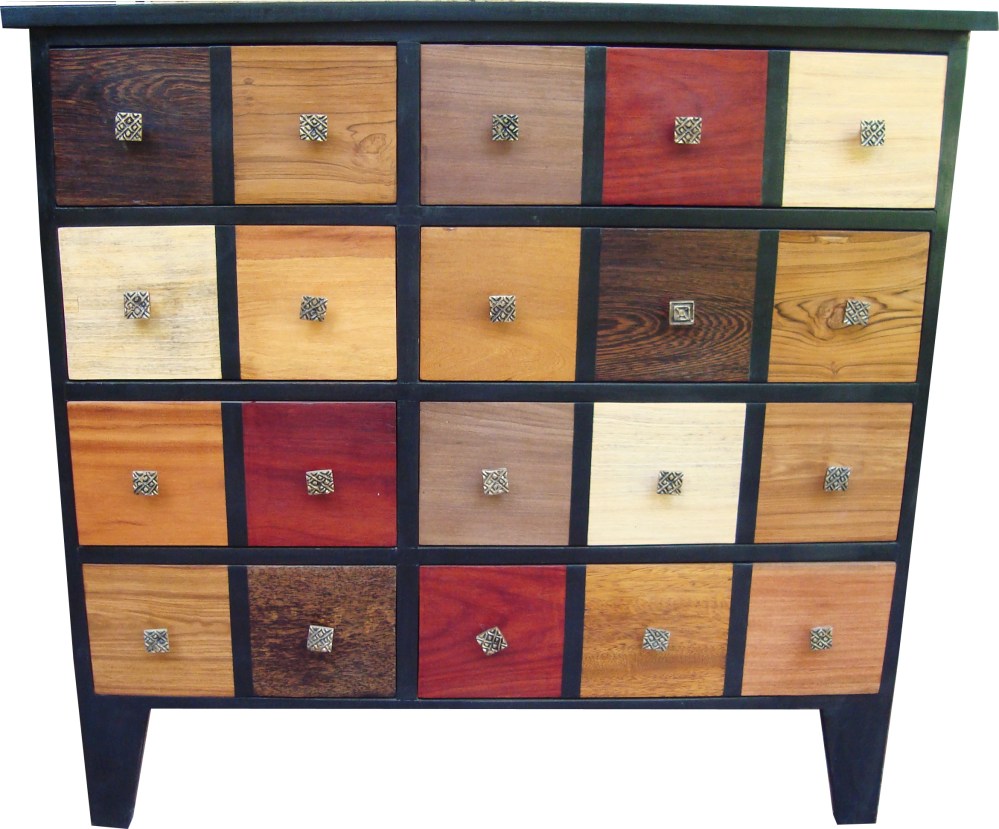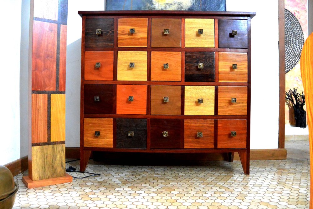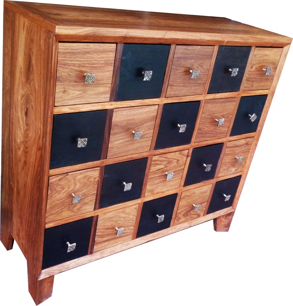 es commodes en patchwork se déclinent de plusieurs façons aux choix : carrés de bois précieux, carrés recouverts de cuir artisanal touareg, carrés de métal laqué, carrés de bois teintés.