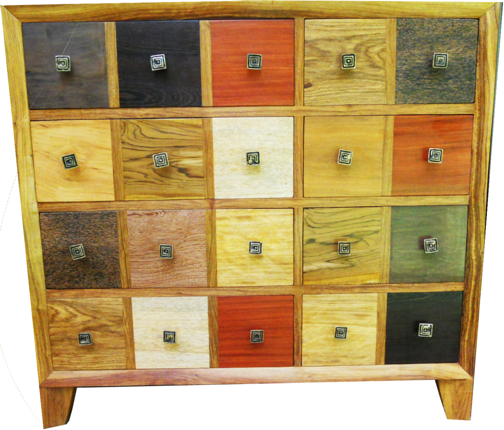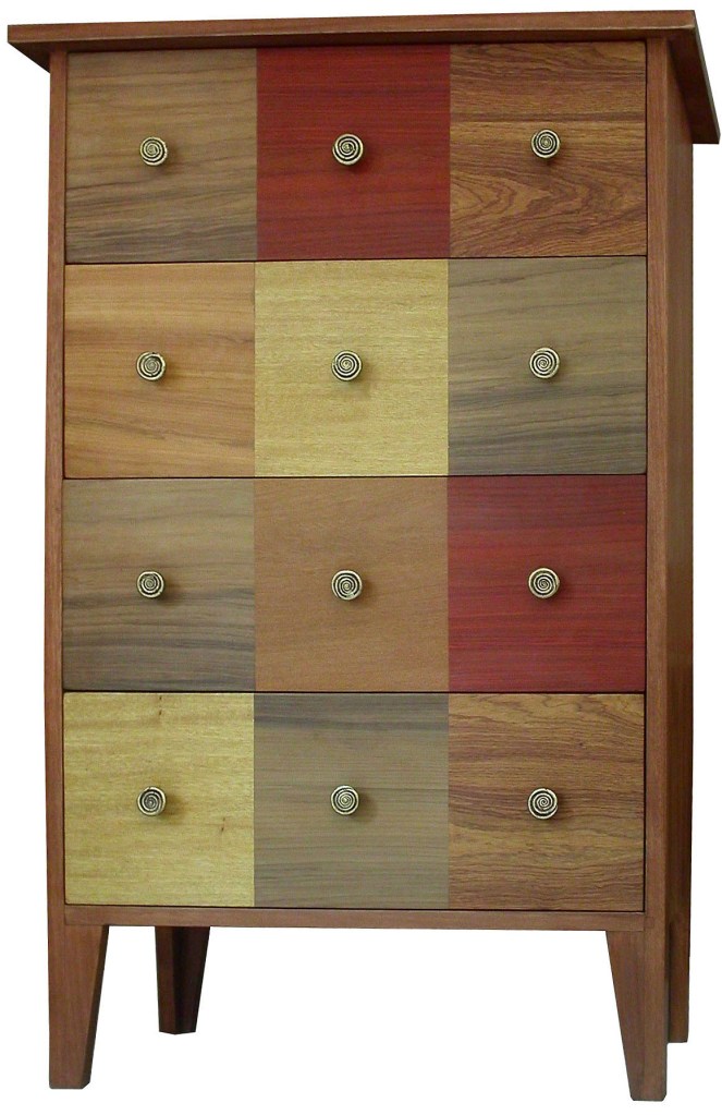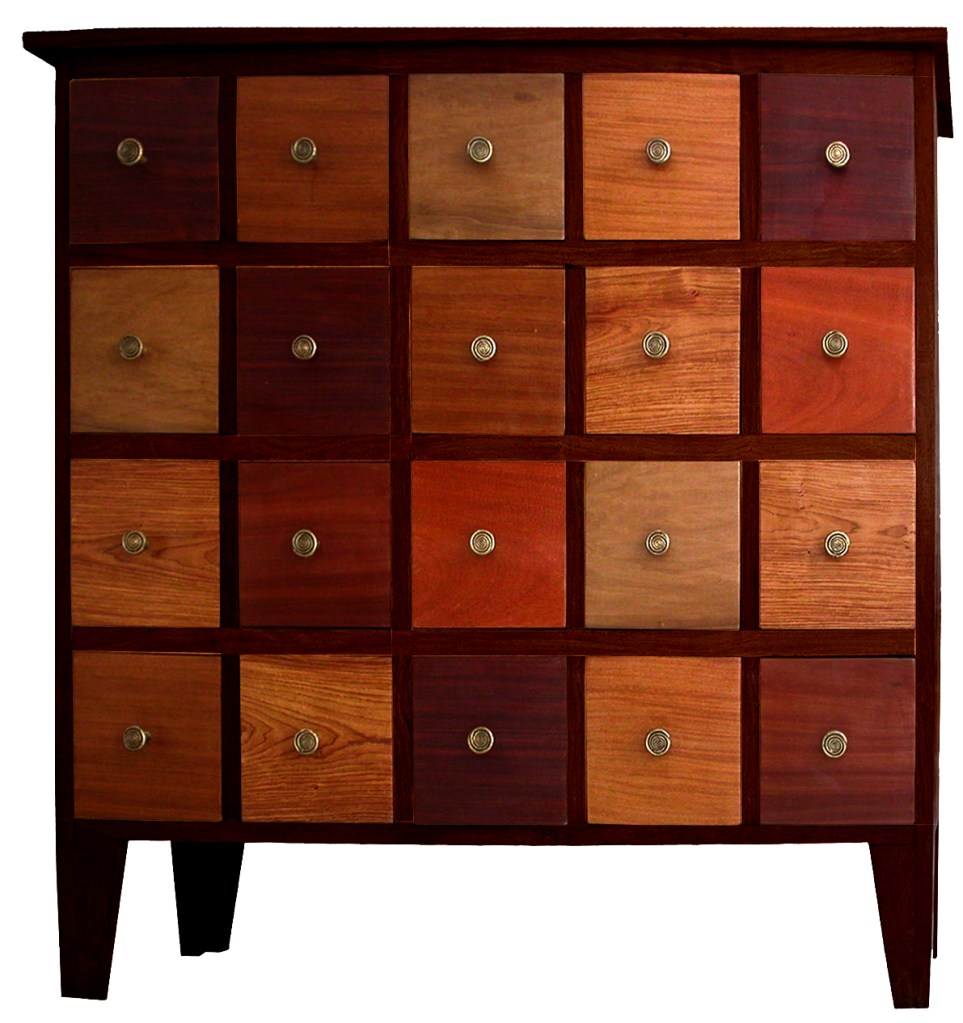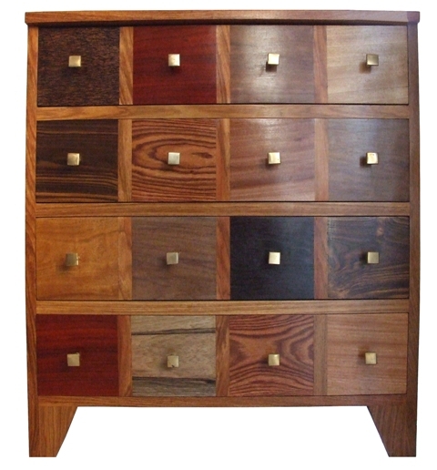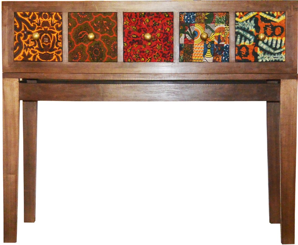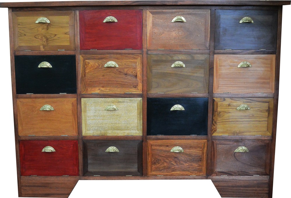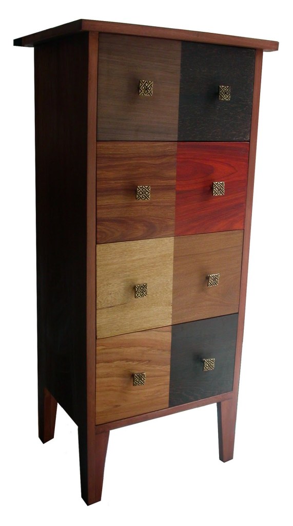 es commodes en patchwork se déclinent de plusieurs façons aux choix : carrés de bois précieux, carrés recouverts de cuir artisanal touareg, carrés de métal laqué, carrés de bois teintés.