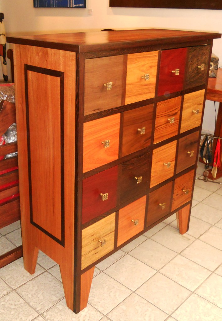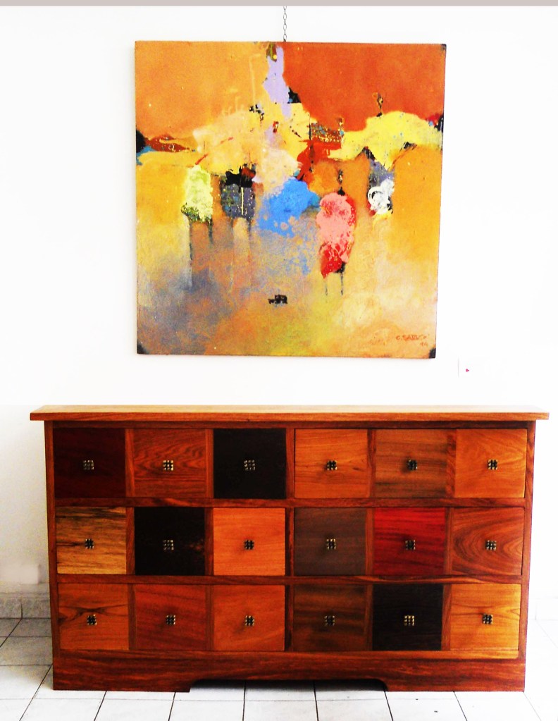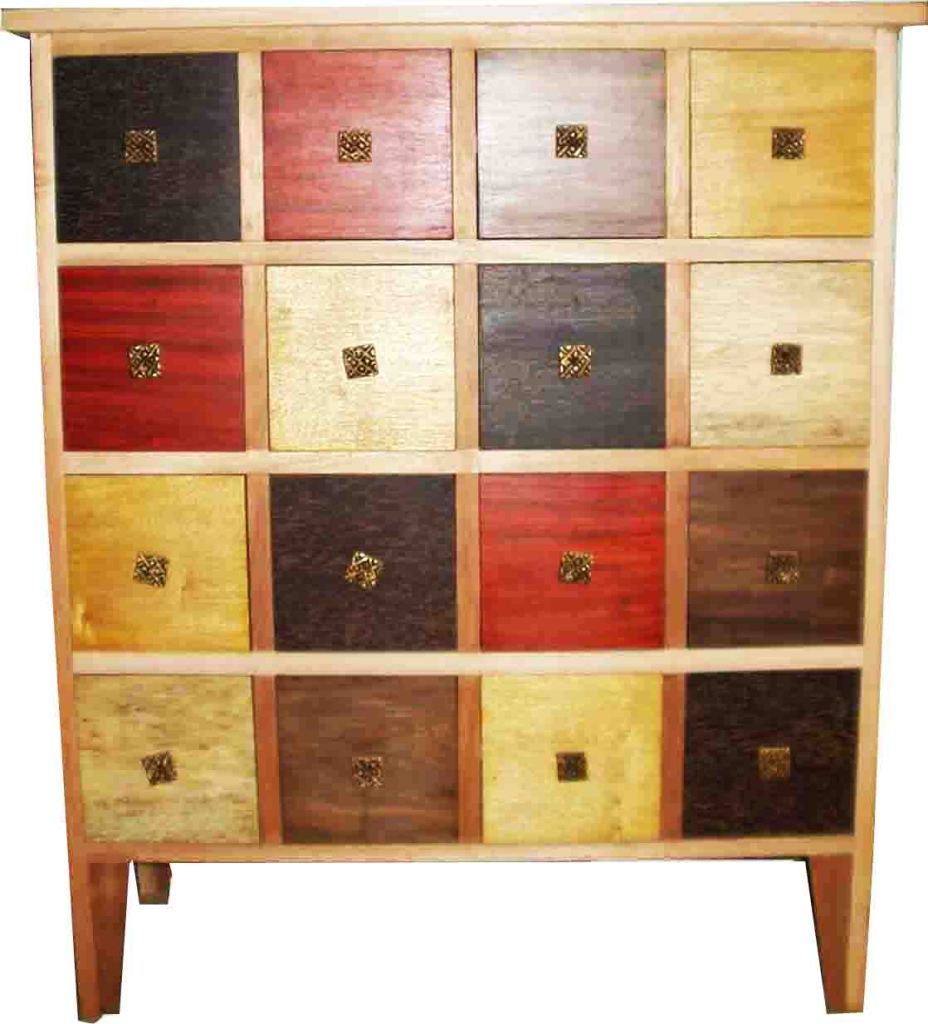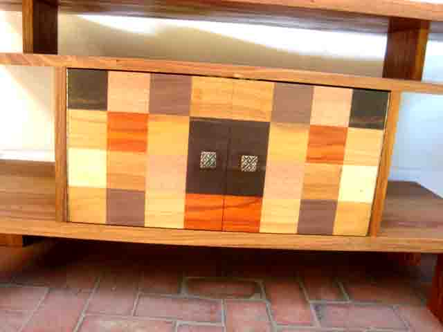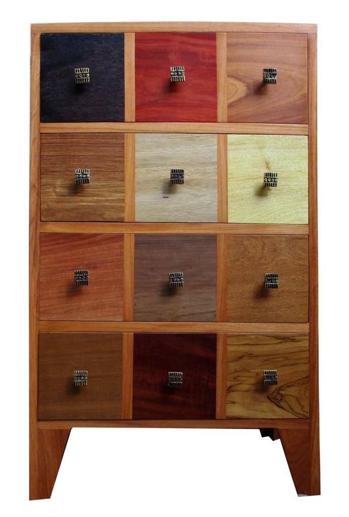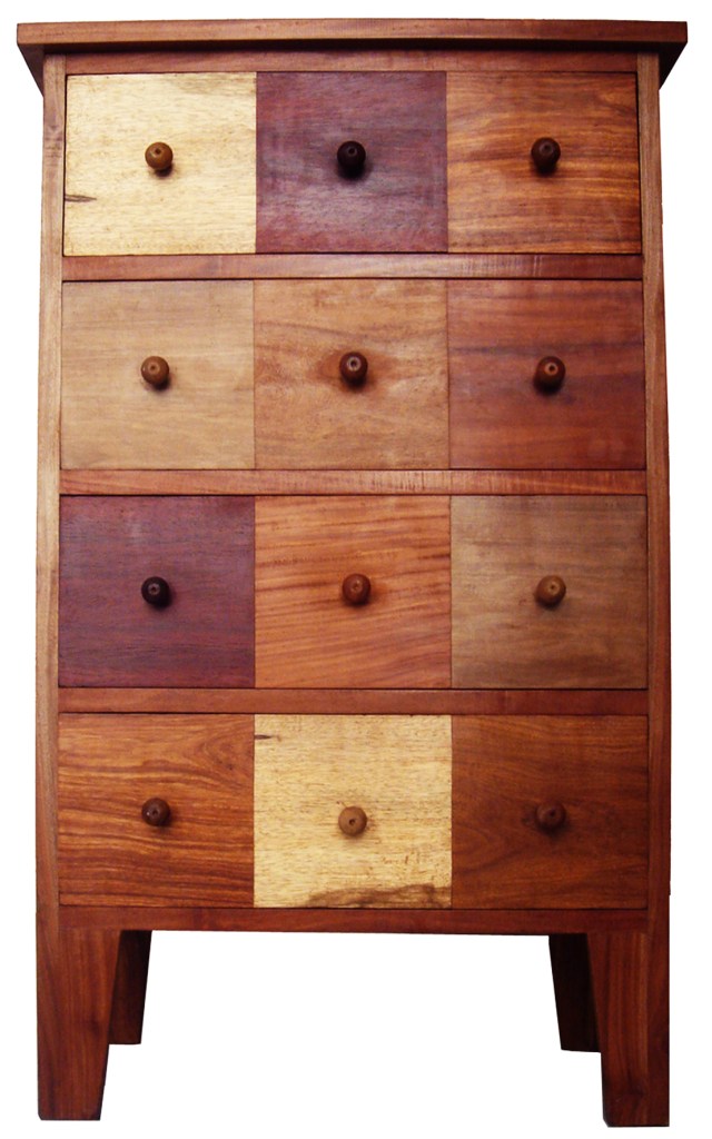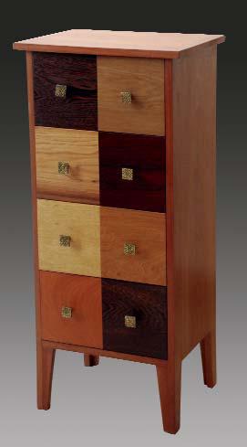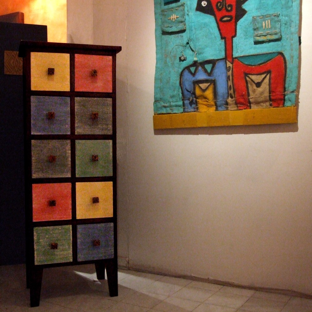 es commodes en patchwork se déclinent de plusieurs façons aux choix : carrés de bois précieux, carrés recouverts de cuir artisanal touareg, carrés de métal laqué, carrés de bois teintés.