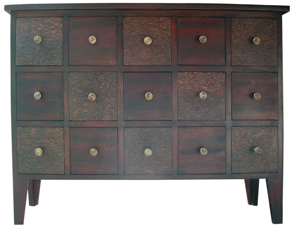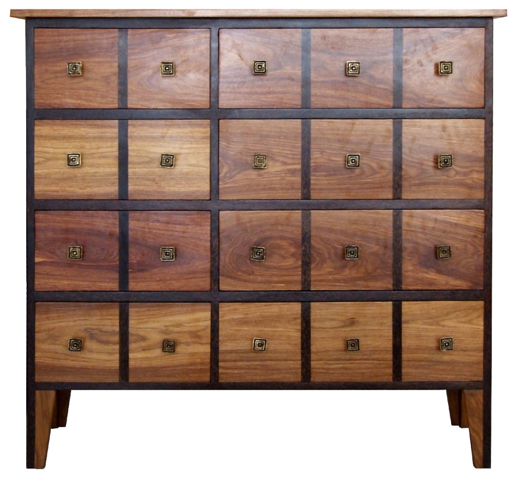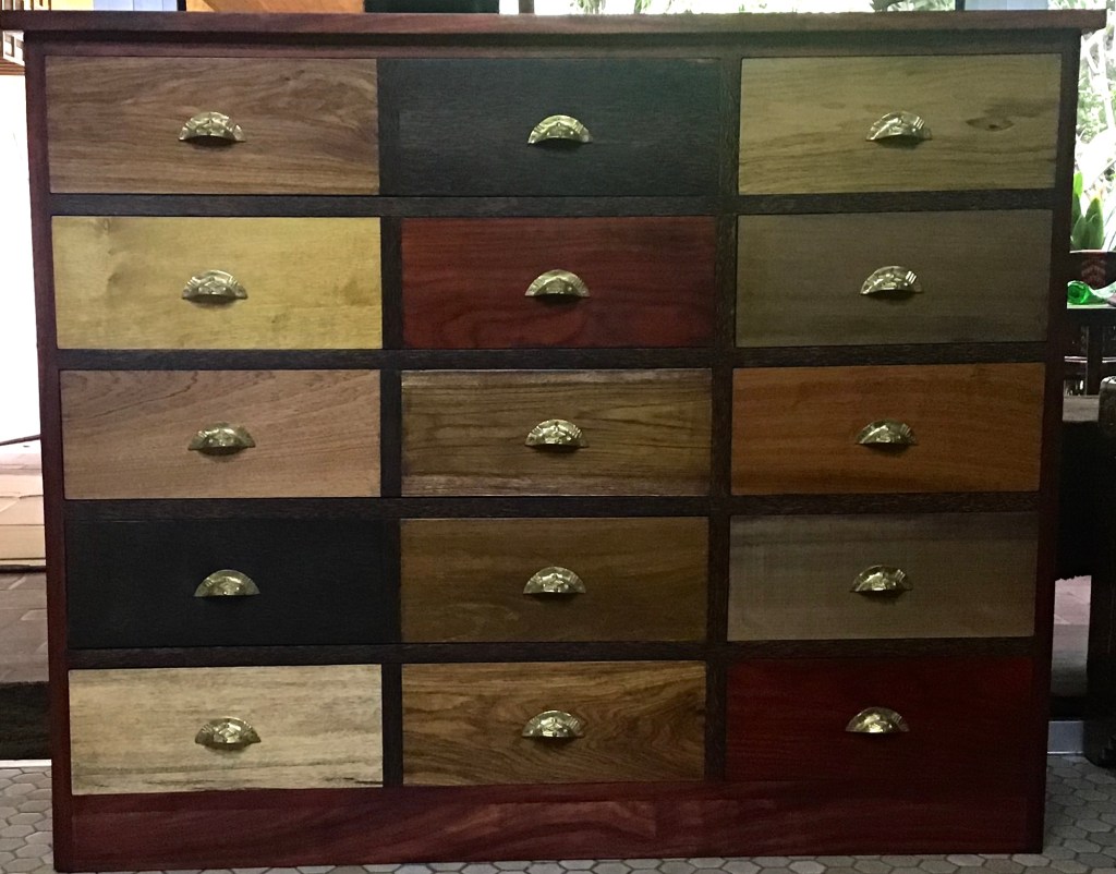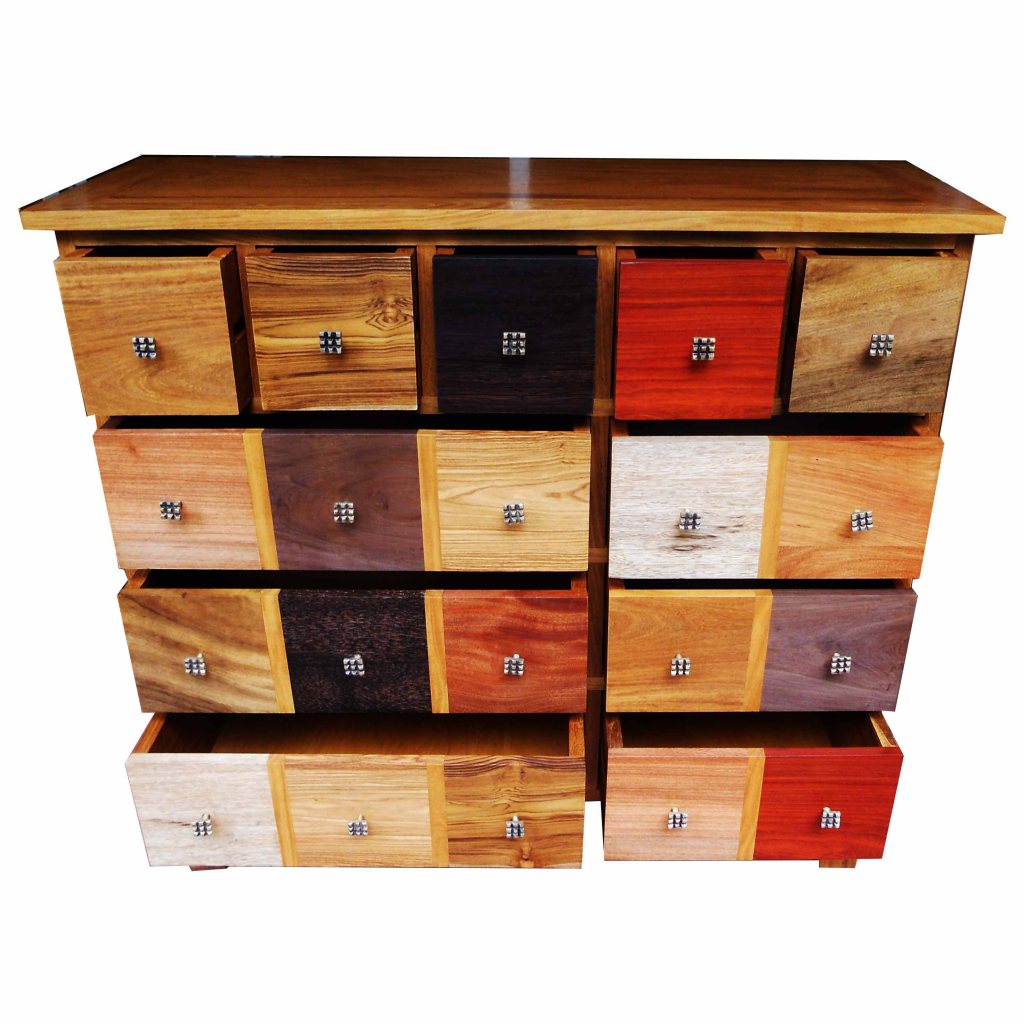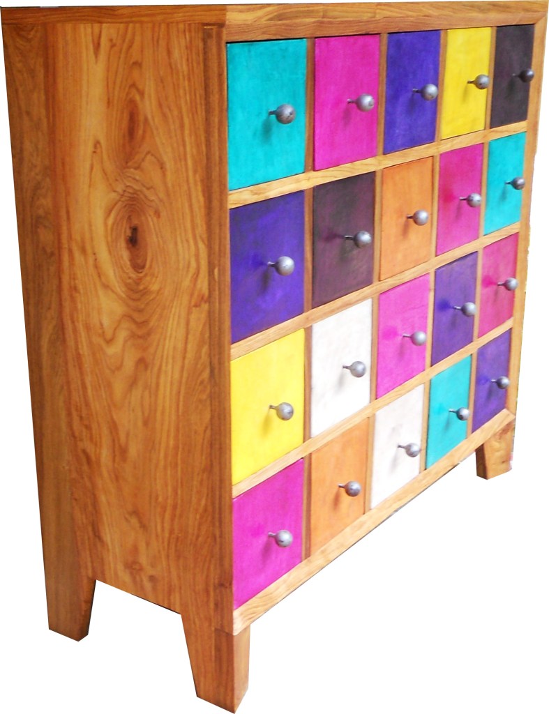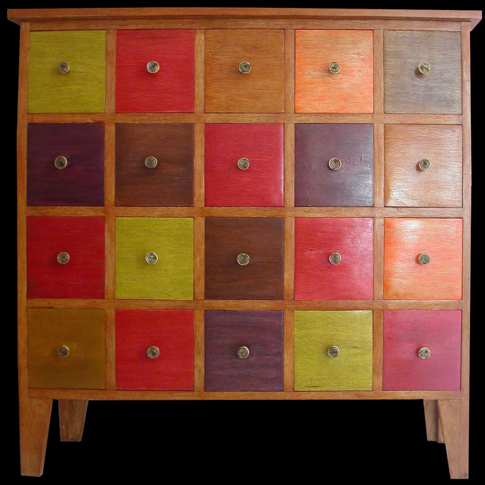es commodes en patchwork se déclinent de plusieurs façons aux choix : carrés de bois précieux, carrés recouverts de cuir artisanal touareg, carrés de métal laqué, carrés de bois teintés.