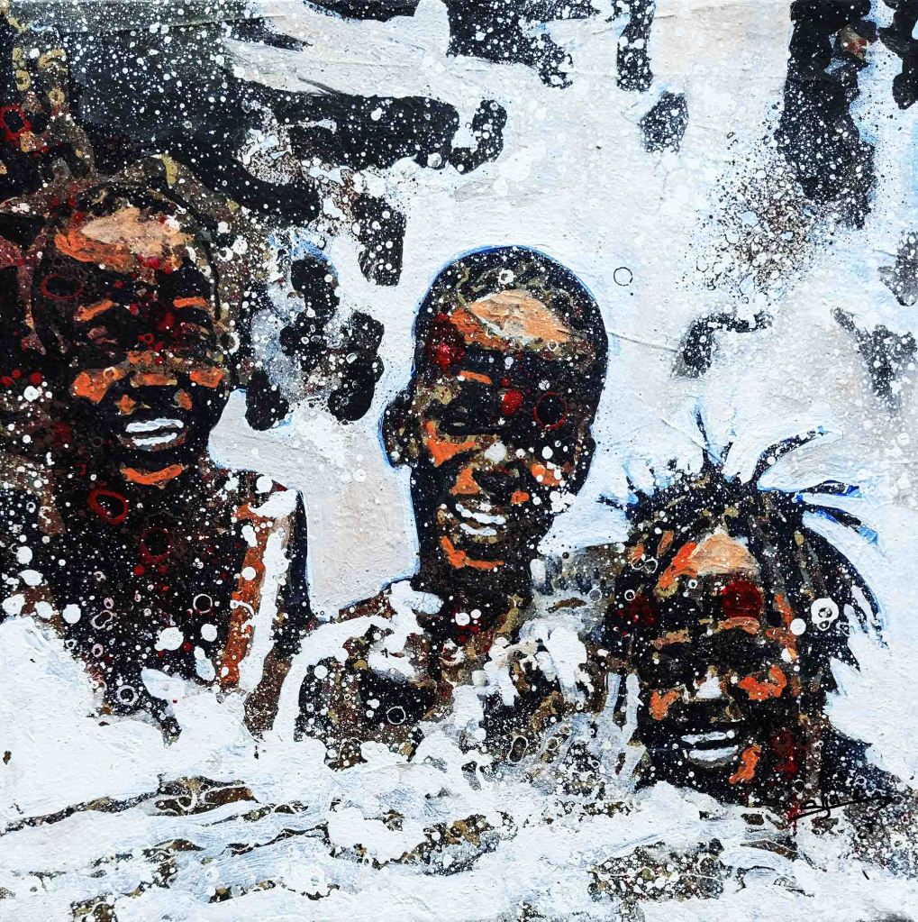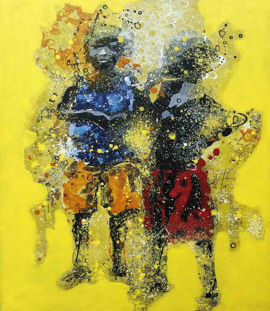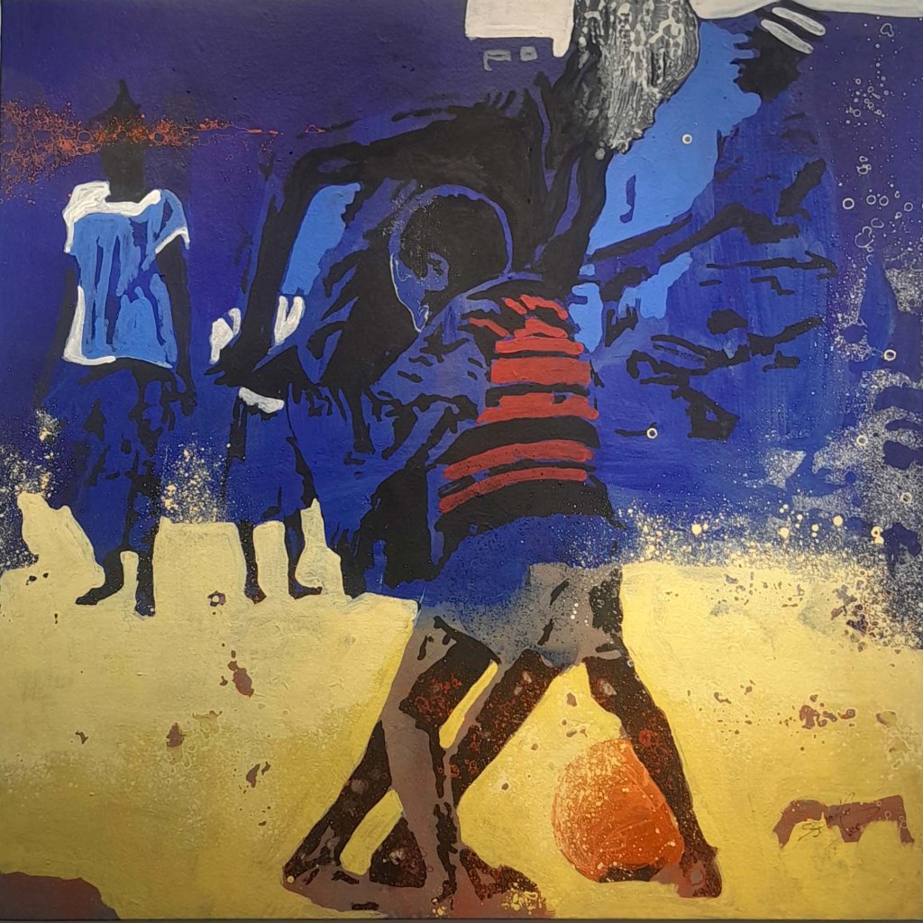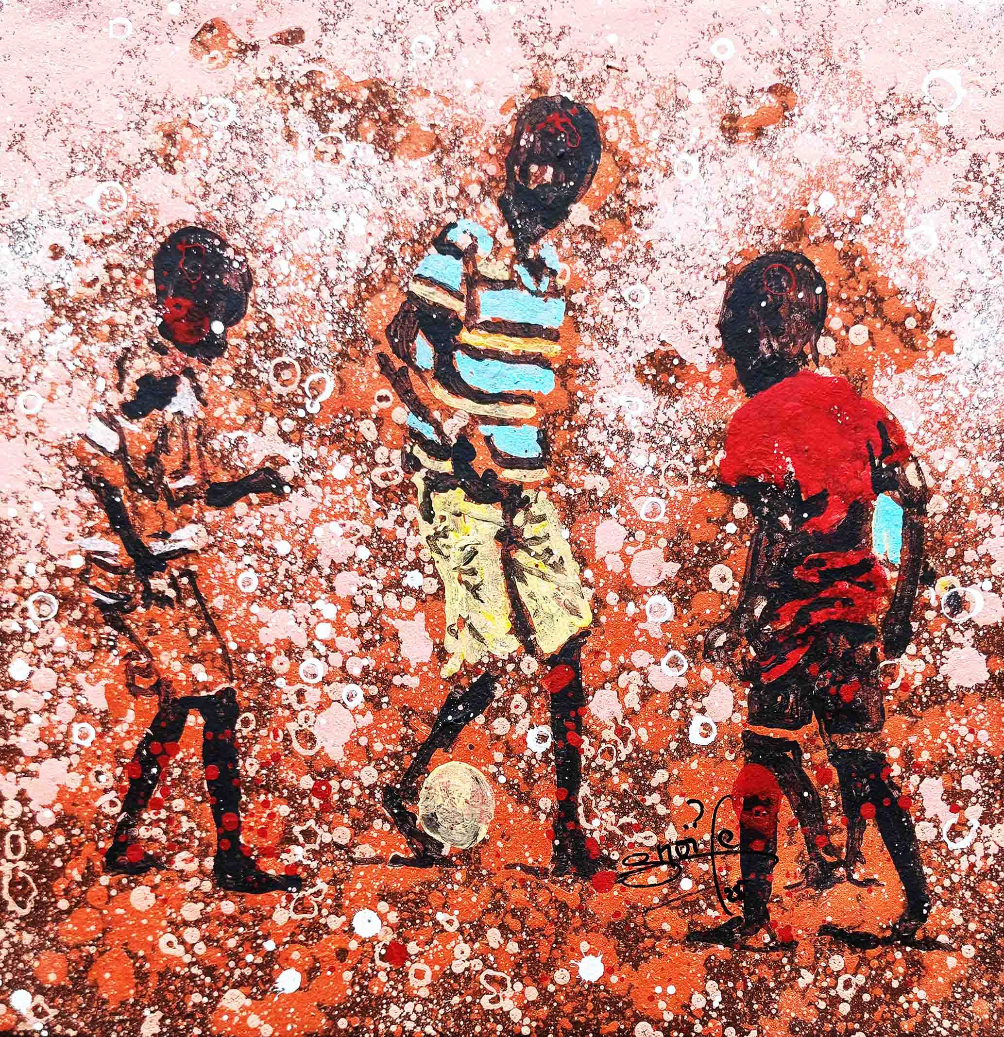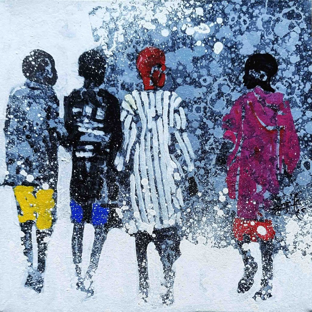 La technique de l’artiste contribue à cette impression et renforce le caractère ludique. Les personnages sont esquissés, flous, devinés comme une photo prise sur des sujets en mouvements et qui inspirent ainsi la turbulence des enfants qui jouent. Sur les tourbillons d’aplats de peinture primaire et saturée, Gnohité projette une myriade de petites taches de couleurs qui renvoient un ressenti de naïveté. il utilise également la technique de grattage du support ou de la peinture projetée qui nous fait penser au soleil et à la poussière des vents de sables d’Afrique.