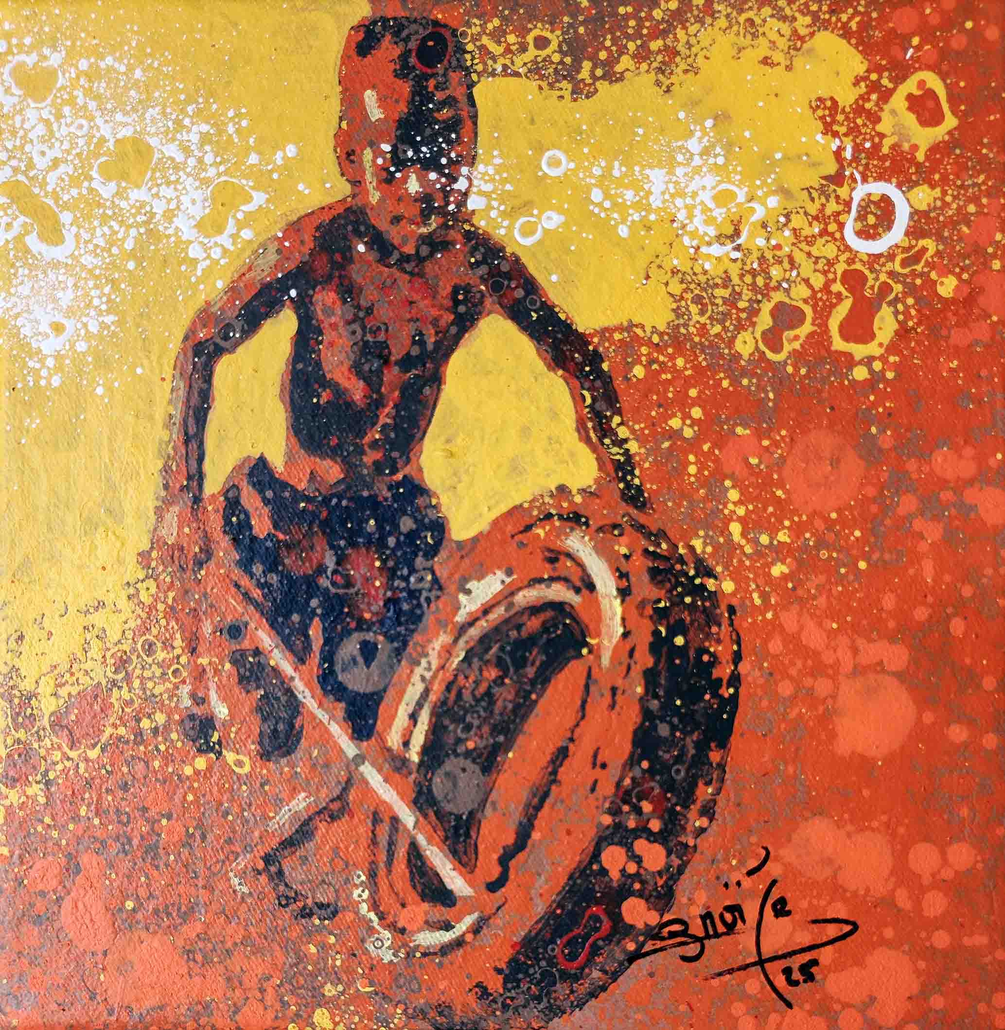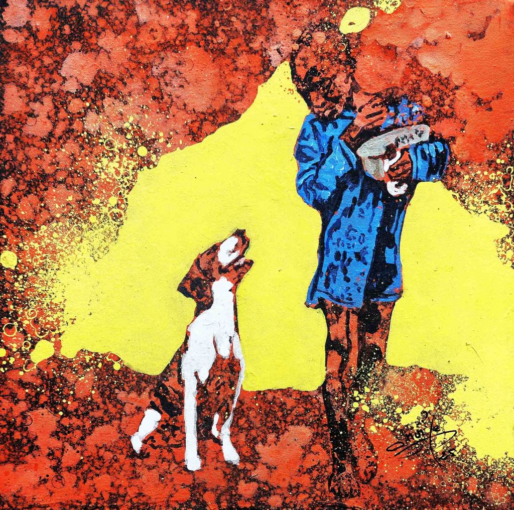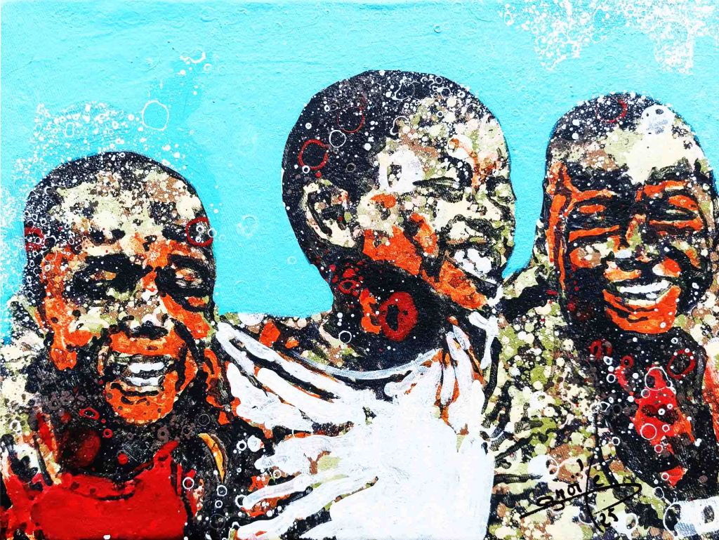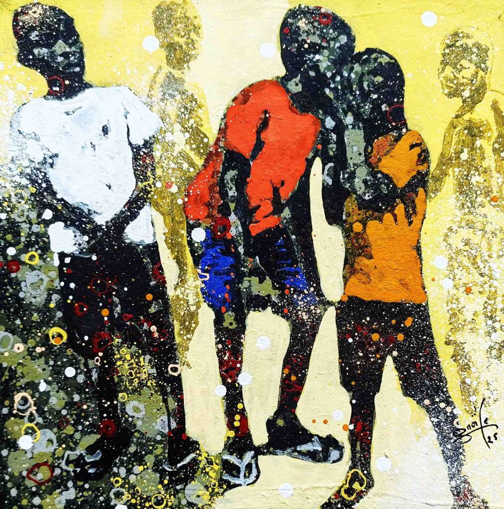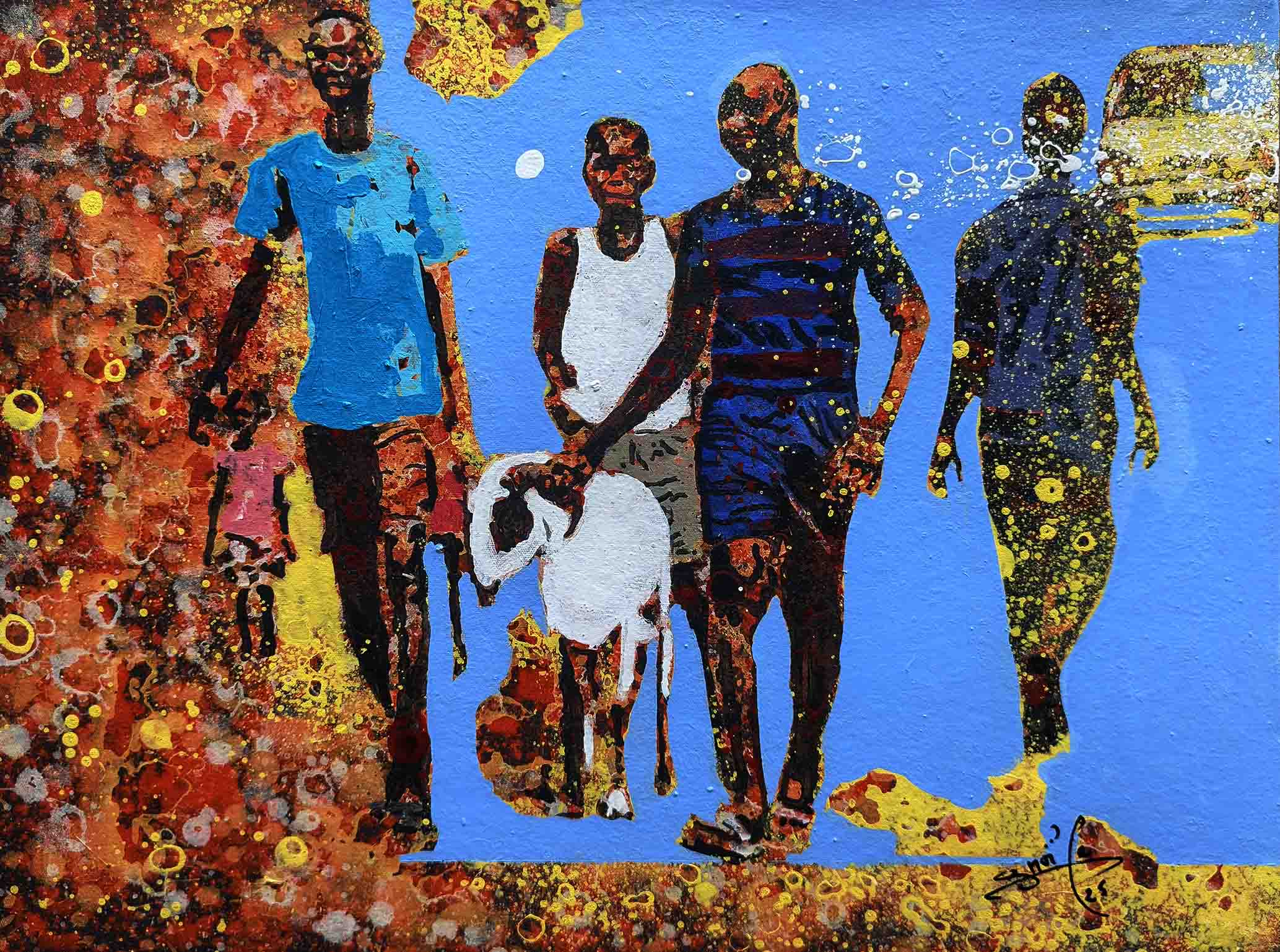 La technique de l’artiste contribue à cette impression et renforce le caractère ludique. Les personnages sont esquissés, flous, devinés comme une photo prise sur des sujets en mouvements et qui inspirent ainsi la turbulence des enfants qui jouent. Sur les tourbillons d’aplats de peinture primaire et saturée, Gnohité projette une myriade de petites taches de couleurs qui renvoient un ressenti de naïveté. il utilise également la technique de grattage du support ou de la peinture projetée qui nous fait penser au soleil et à la poussière des vents de sables d’Afrique.