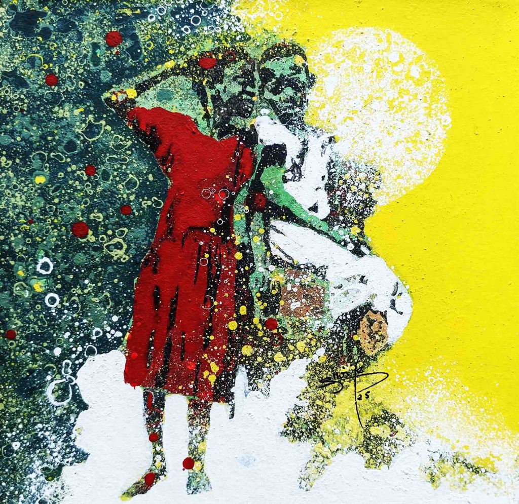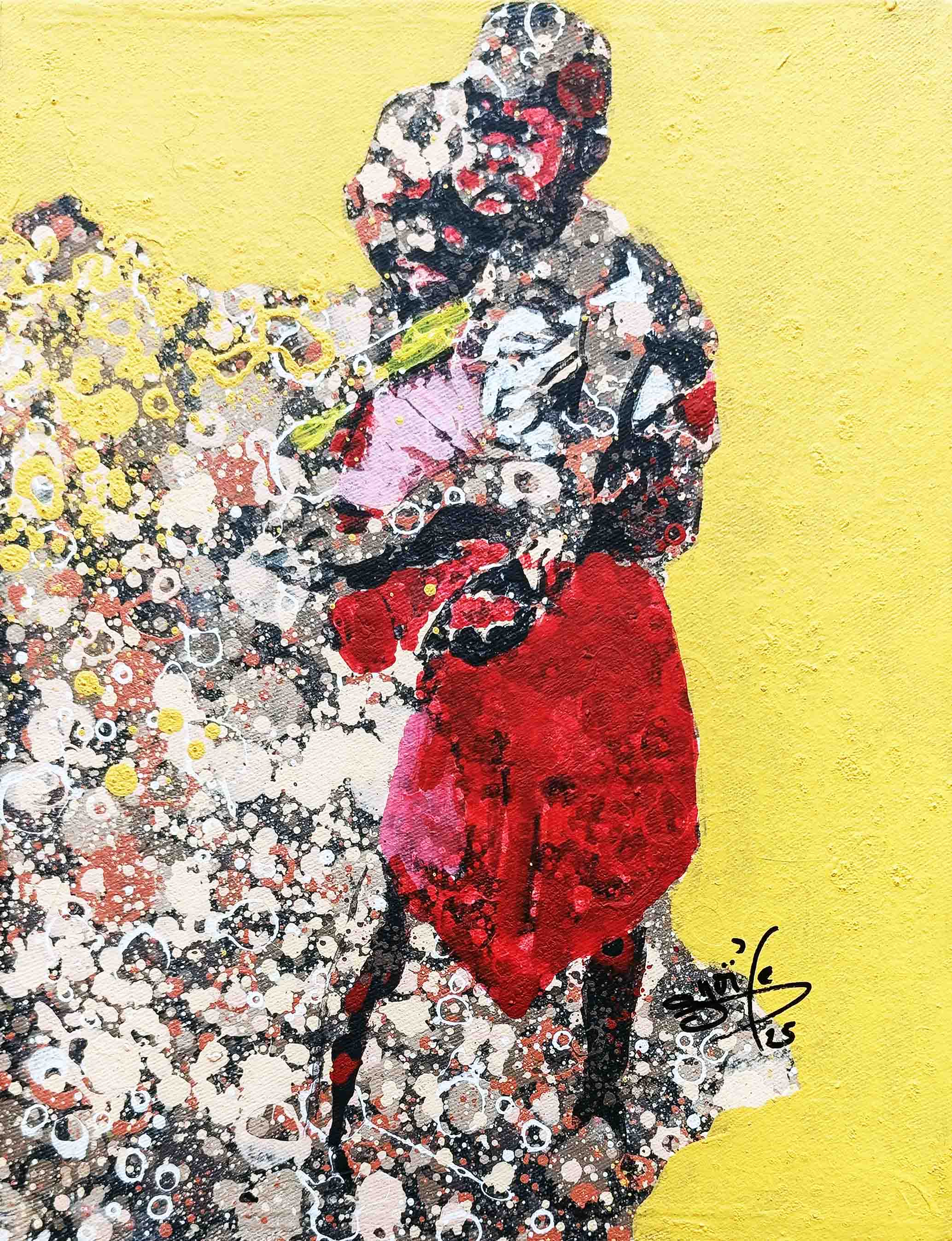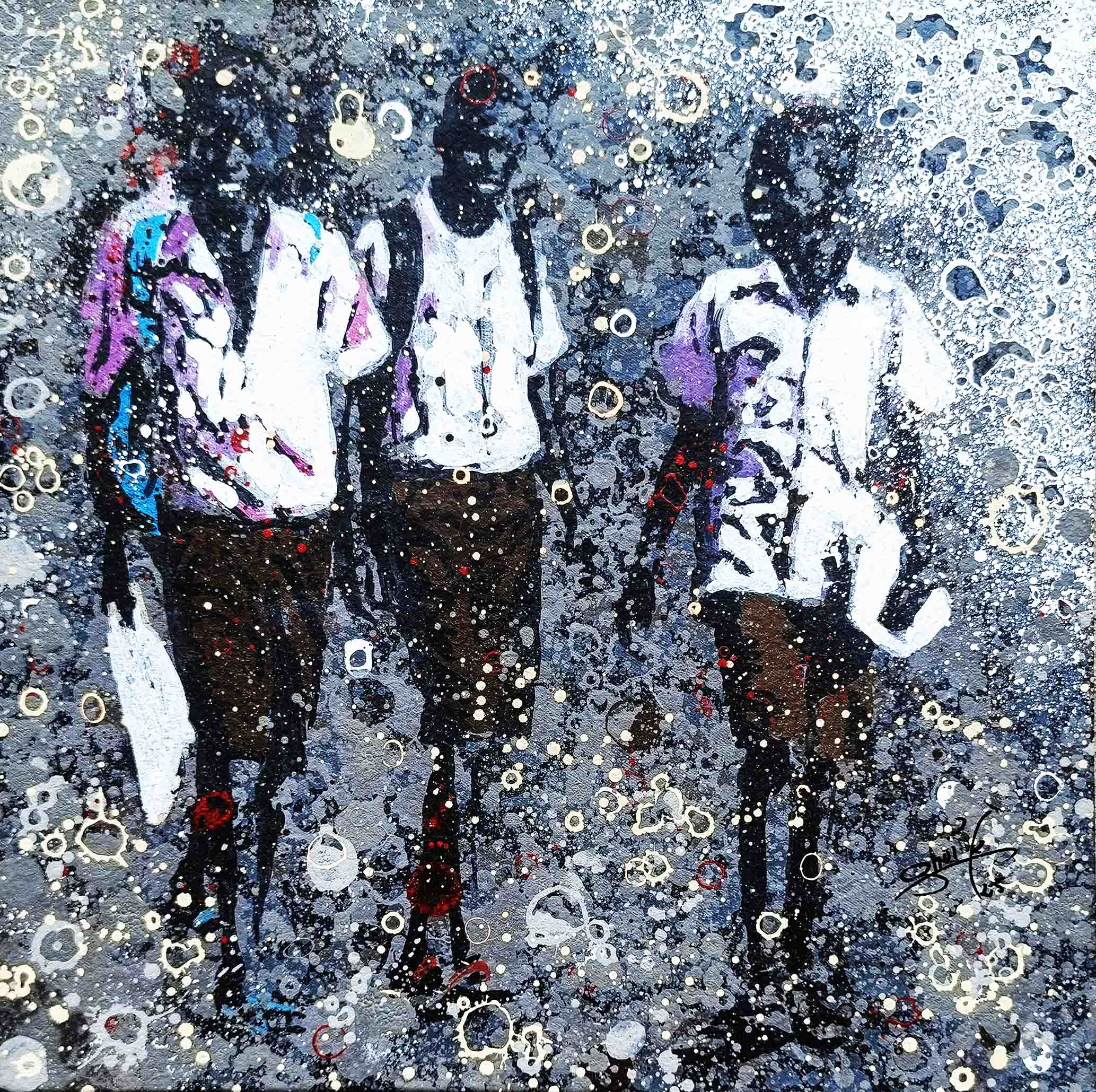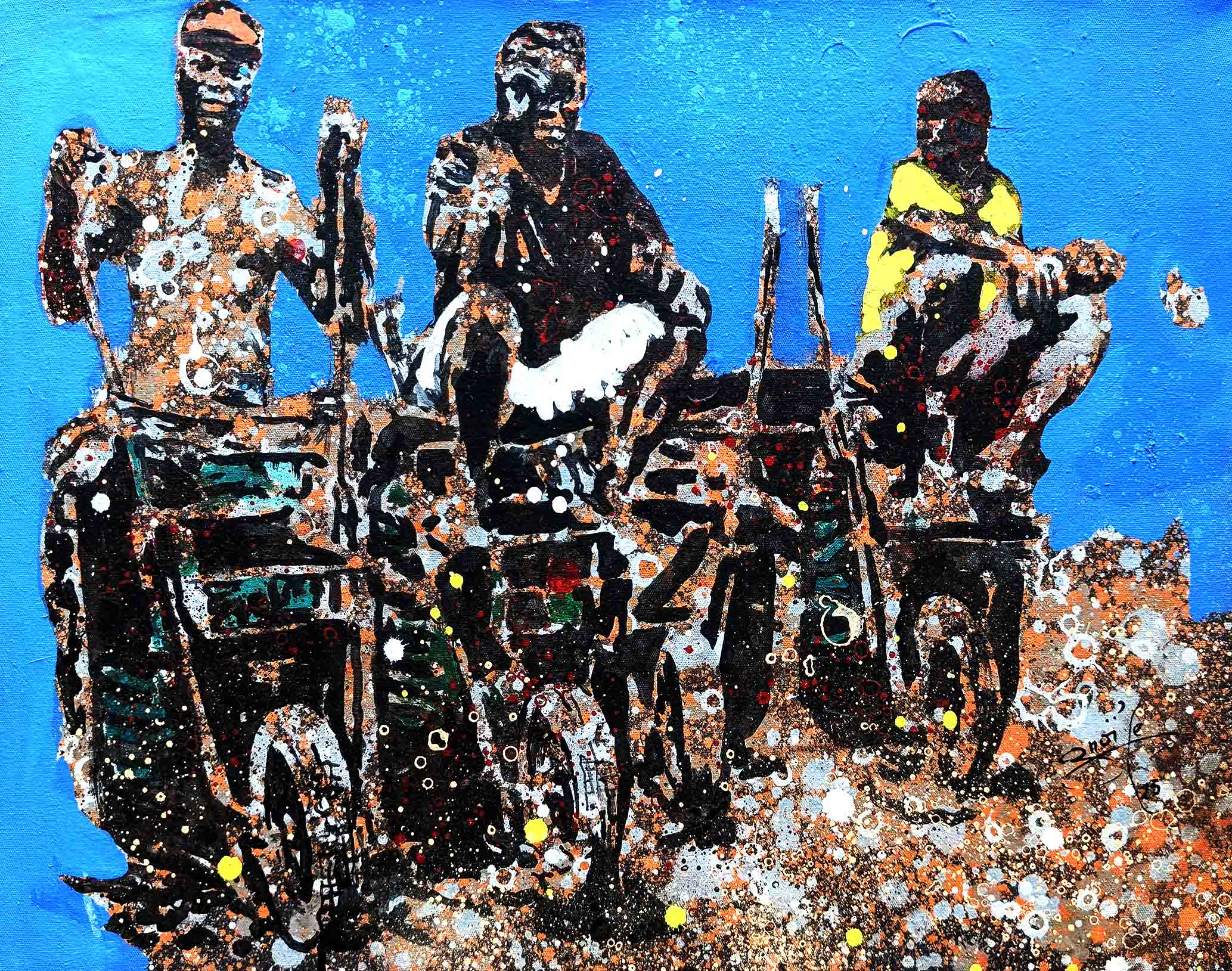 La technique de l’artiste contribue à cette impression et renforce le caractère ludique. Les personnages sont esquissés, flous, devinés comme une photo prise sur des sujets en mouvements et qui inspirent ainsi la turbulence des enfants qui jouent. Sur les tourbillons d’aplats de peinture primaire et saturée, Gnohité projette une myriade de petites taches de couleurs qui renvoient un ressenti de naïveté. il utilise également la technique de grattage du support ou de la peinture projetée qui nous fait penser au soleil et à la poussière des vents de sables d’Afrique.