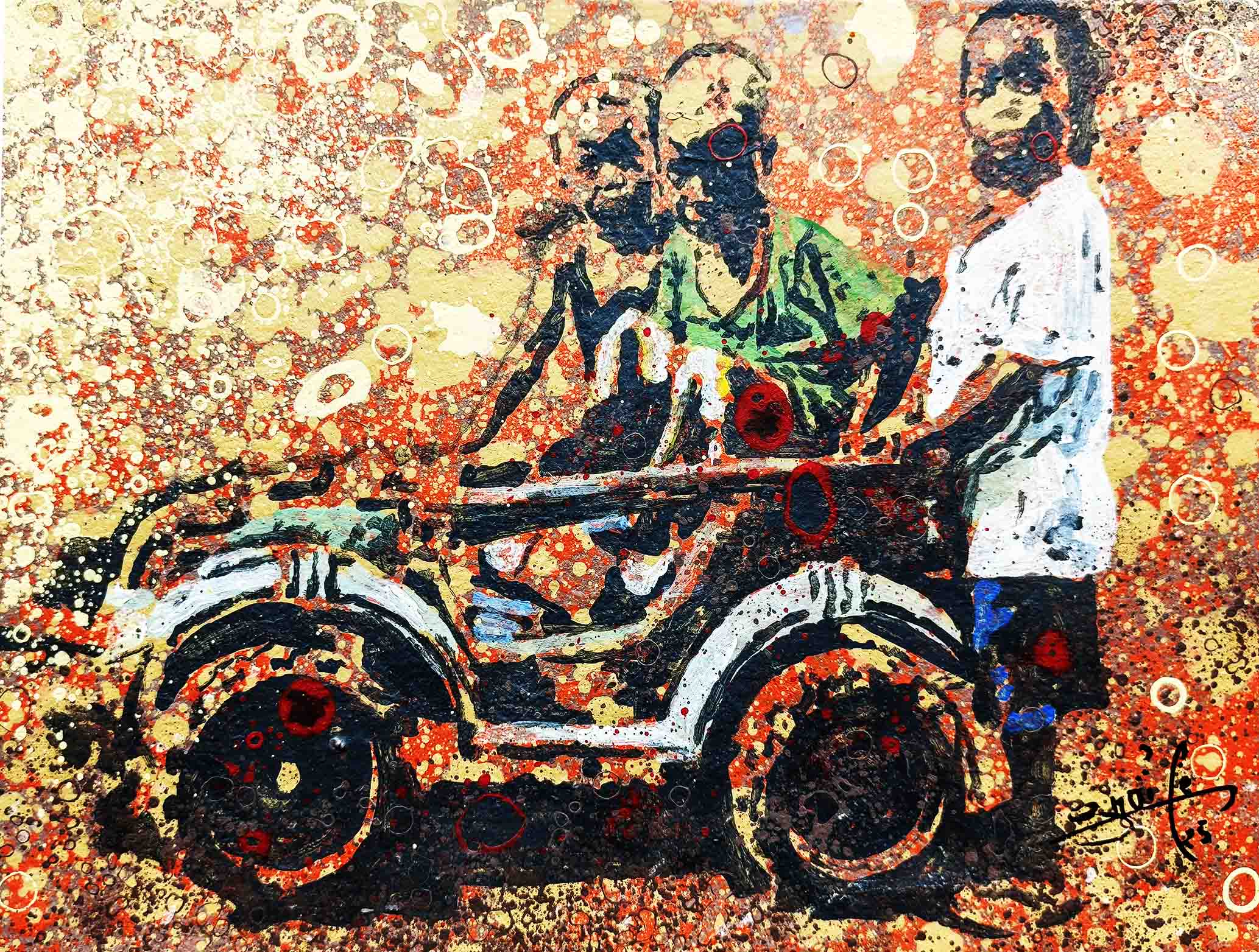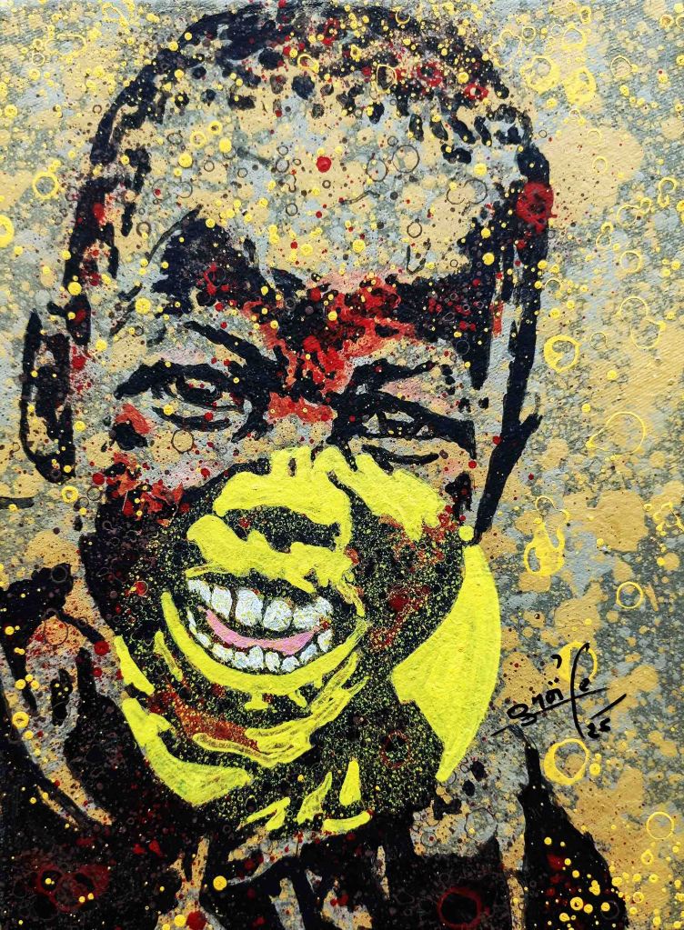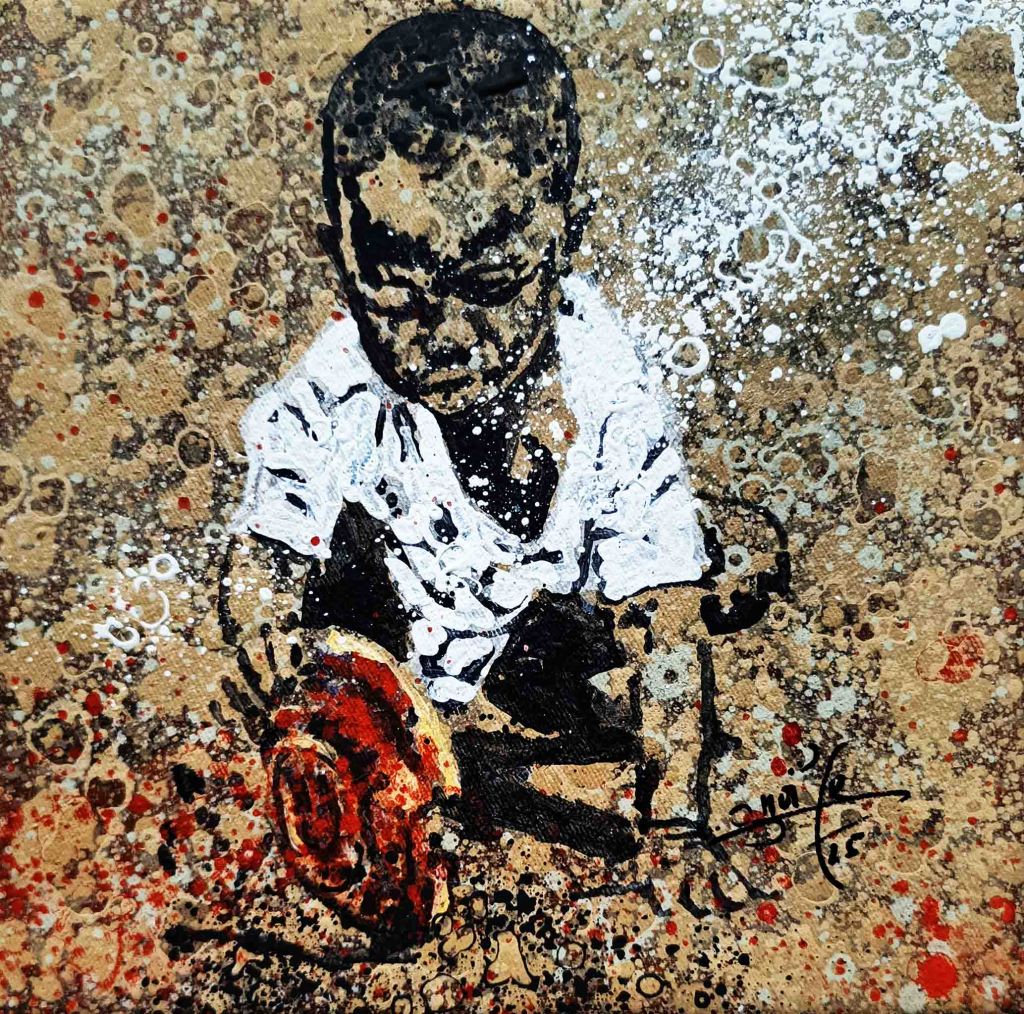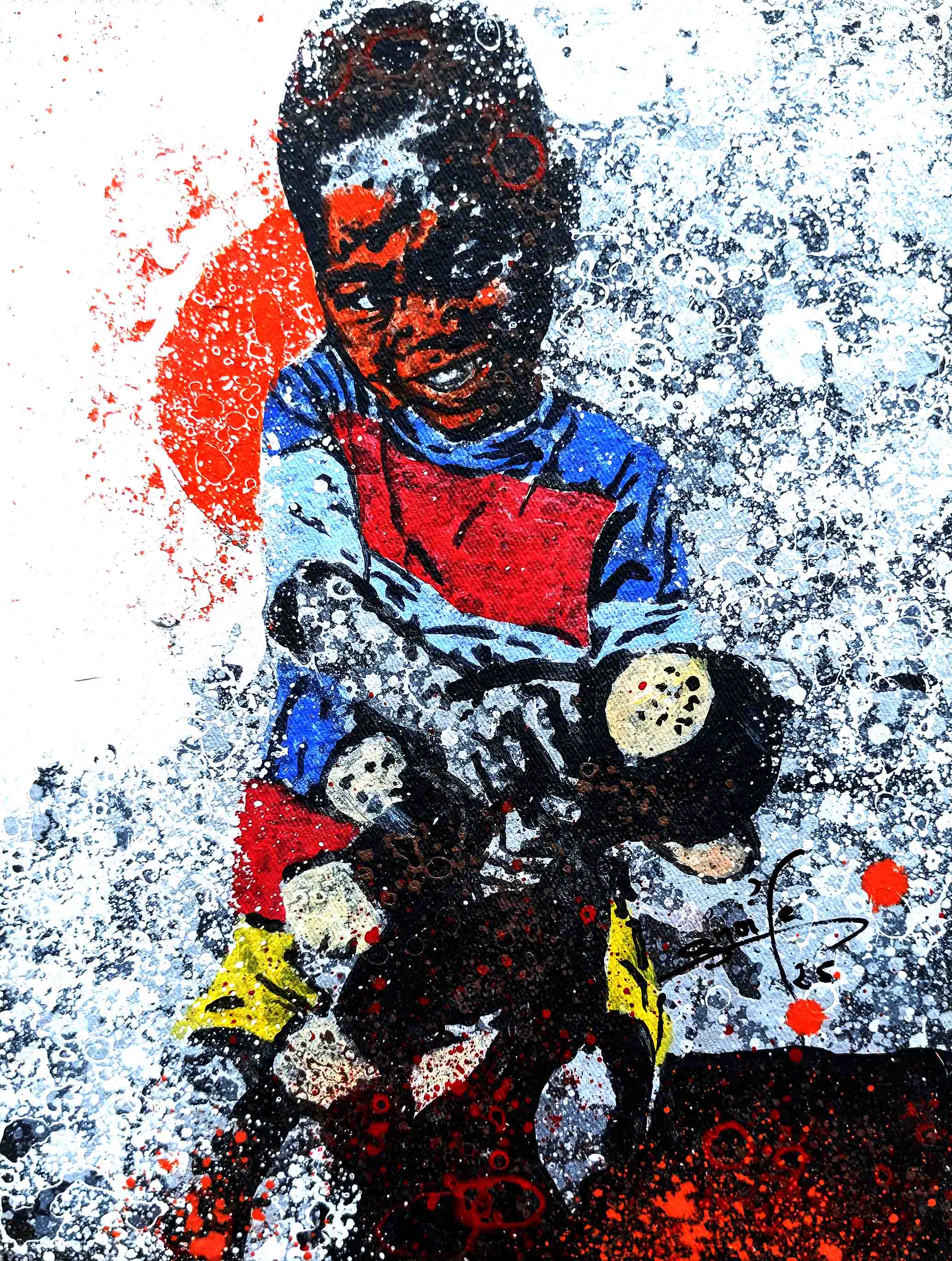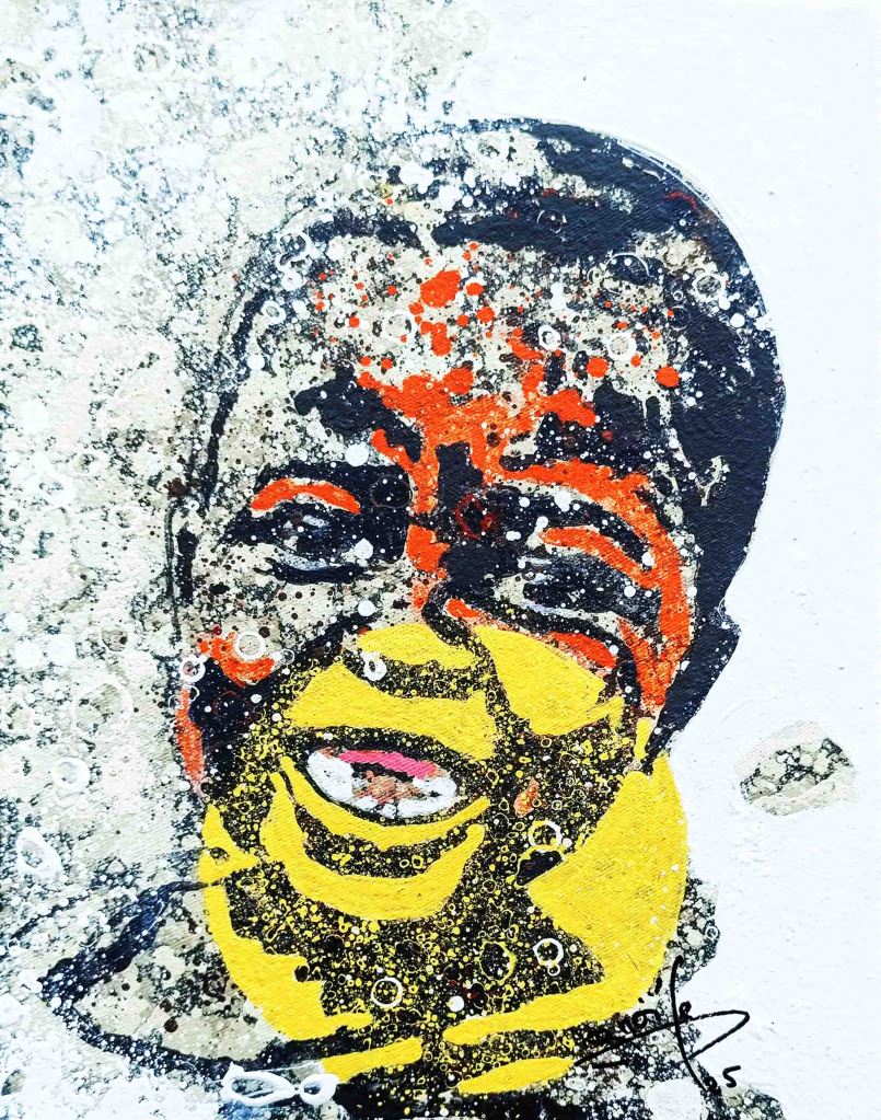La technique de l’artiste contribue à cette impression et renforce le caractère ludique. Les personnages sont esquissés, flous, devinés comme une photo prise sur des sujets en mouvements et qui inspirent ainsi la turbulence des enfants qui jouent. Sur les tourbillons d’aplats de peinture primaire et saturée, Gnohité projette une myriade de petites taches de couleurs qui renvoient un ressenti de naïveté. il utilise également la technique de grattage du support ou de la peinture projetée qui nous fait penser au soleil et à la poussière des vents de sables d’Afrique.