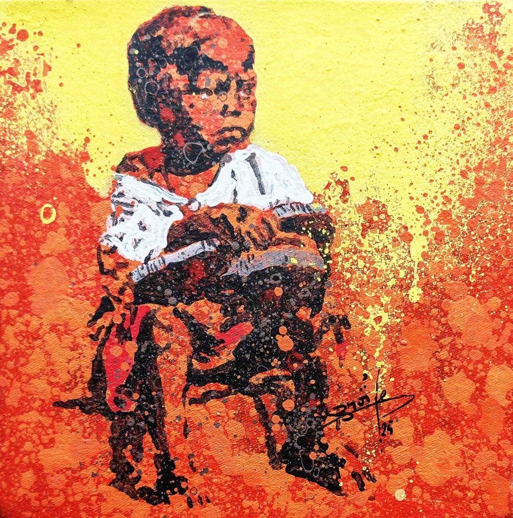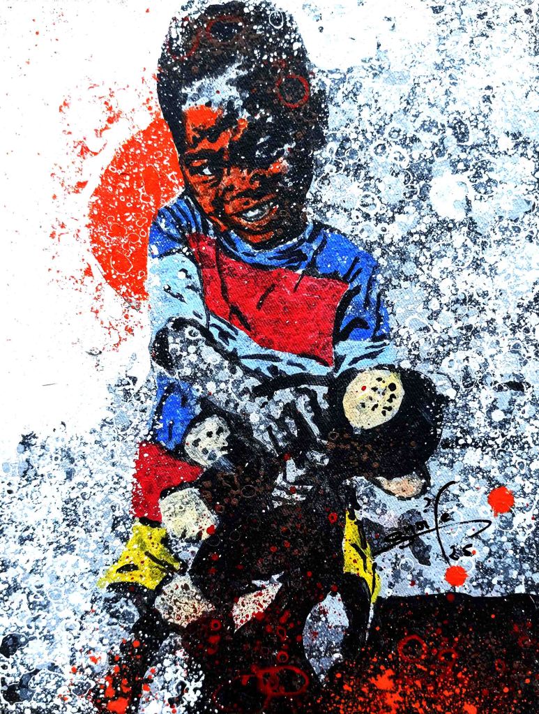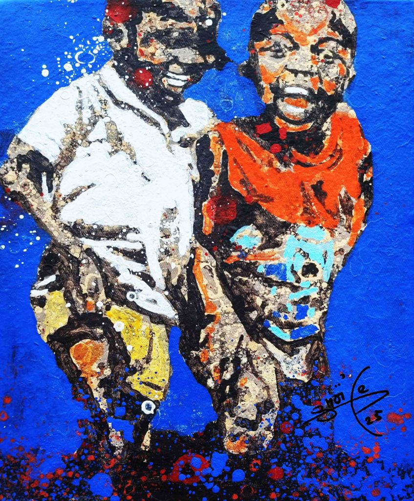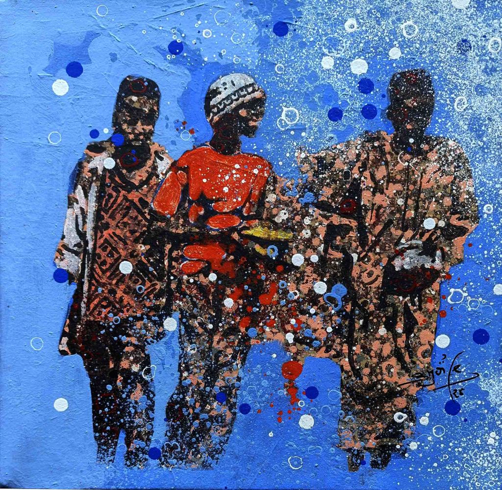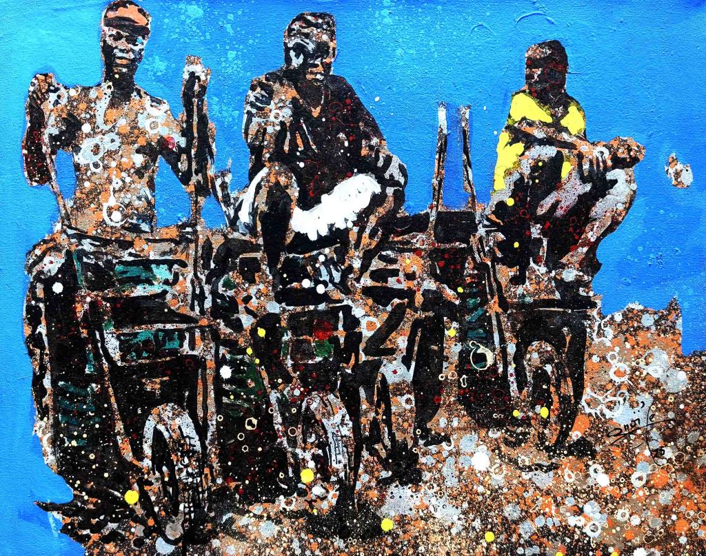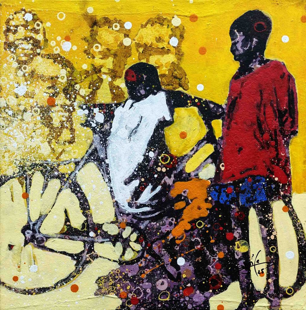 Son thème favori est l’univers des enfants de la rue. Pendant que certains s’adonnent à des jeux spontanés avec des objets de récupération qui leur sert de jouets et traduisent toute leur créativité, d’autres semblent préparer quelques espiègleries avec une complicité fraternelle. Le point commun de tous ces enfants est que, malgré leur condition de survie difficile, ils ont l’air libre et heureux. Ils esquissent des sourires francs et insouciants, faisant fi des lendemains. Comme ont dit en nounchi (argot ivoirien) « ils s’enjaillent ! ». L’impression qui nous reste en regardant les tableaux de l’artiste est un sentiment de tendresse et de gaité et d’innocence.