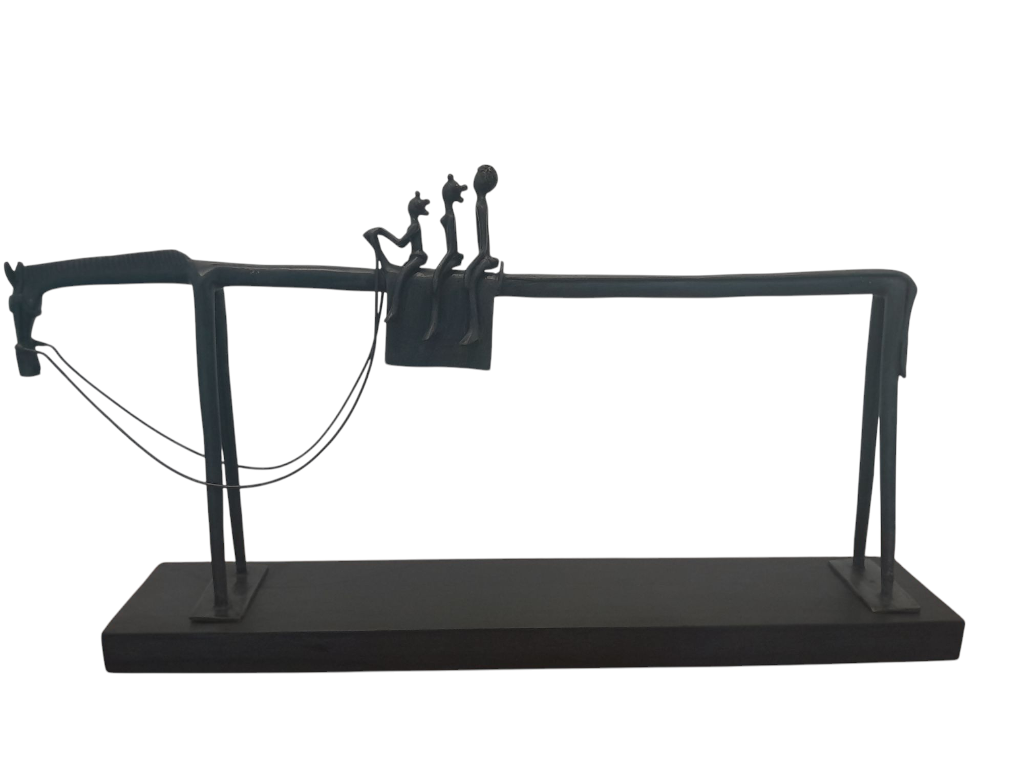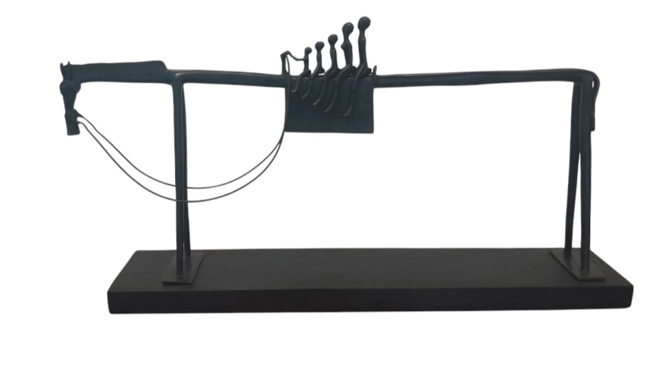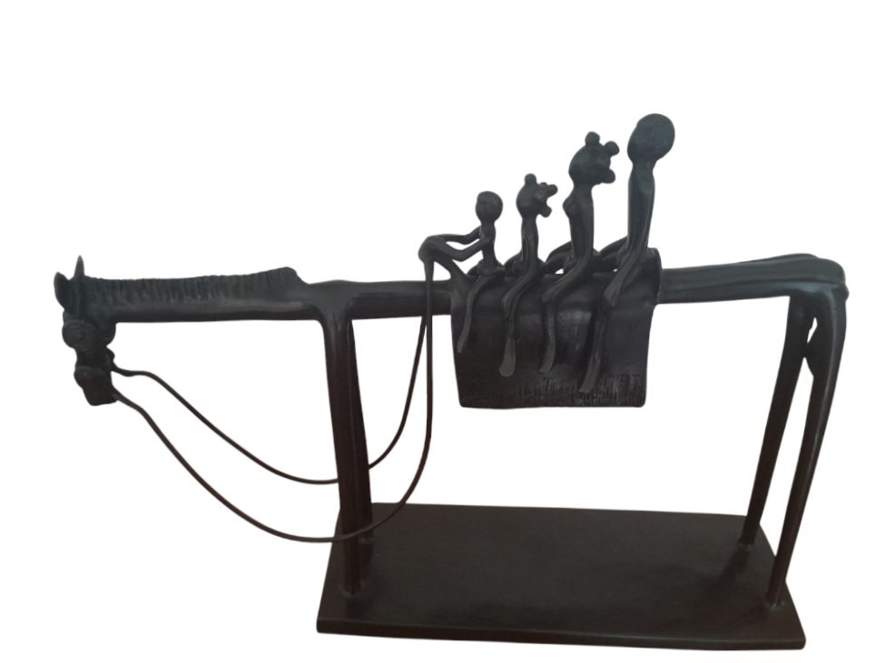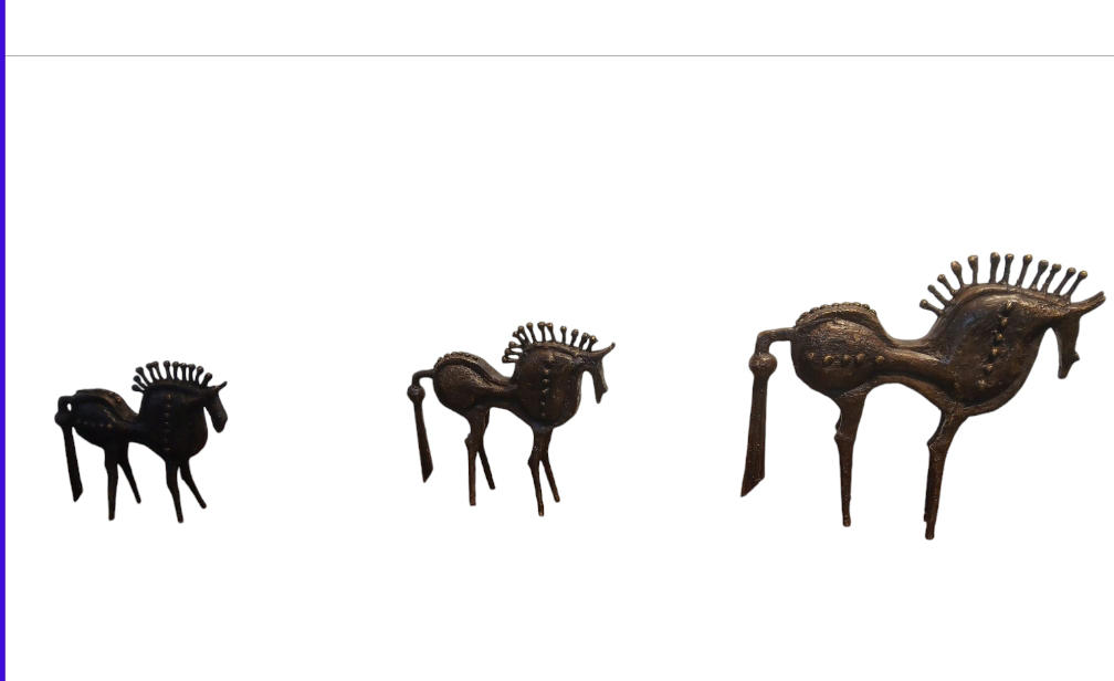 Ibrahima Guiré a hérité de son père de ce style de sculpture, épurée et stylisée. Le cheval au Burkina Faso répond à une tradition remontant à l’époque médiévale, forte chez les Mossis qui furent des utilisateurs de la cavalerie,