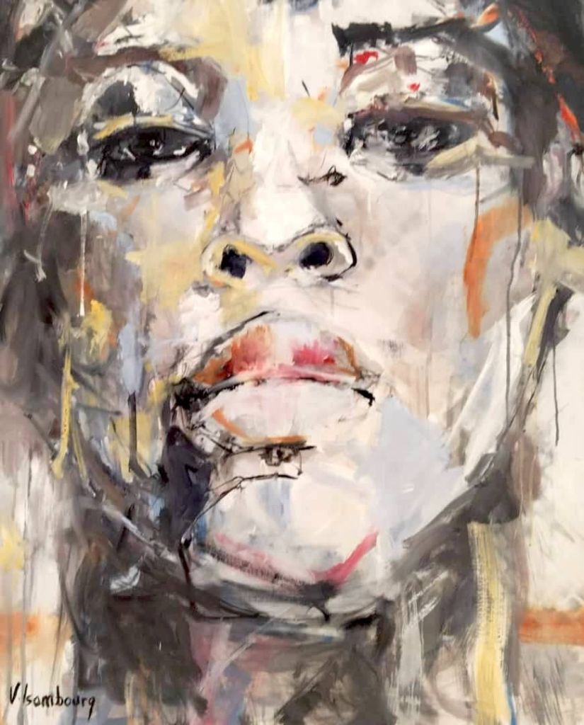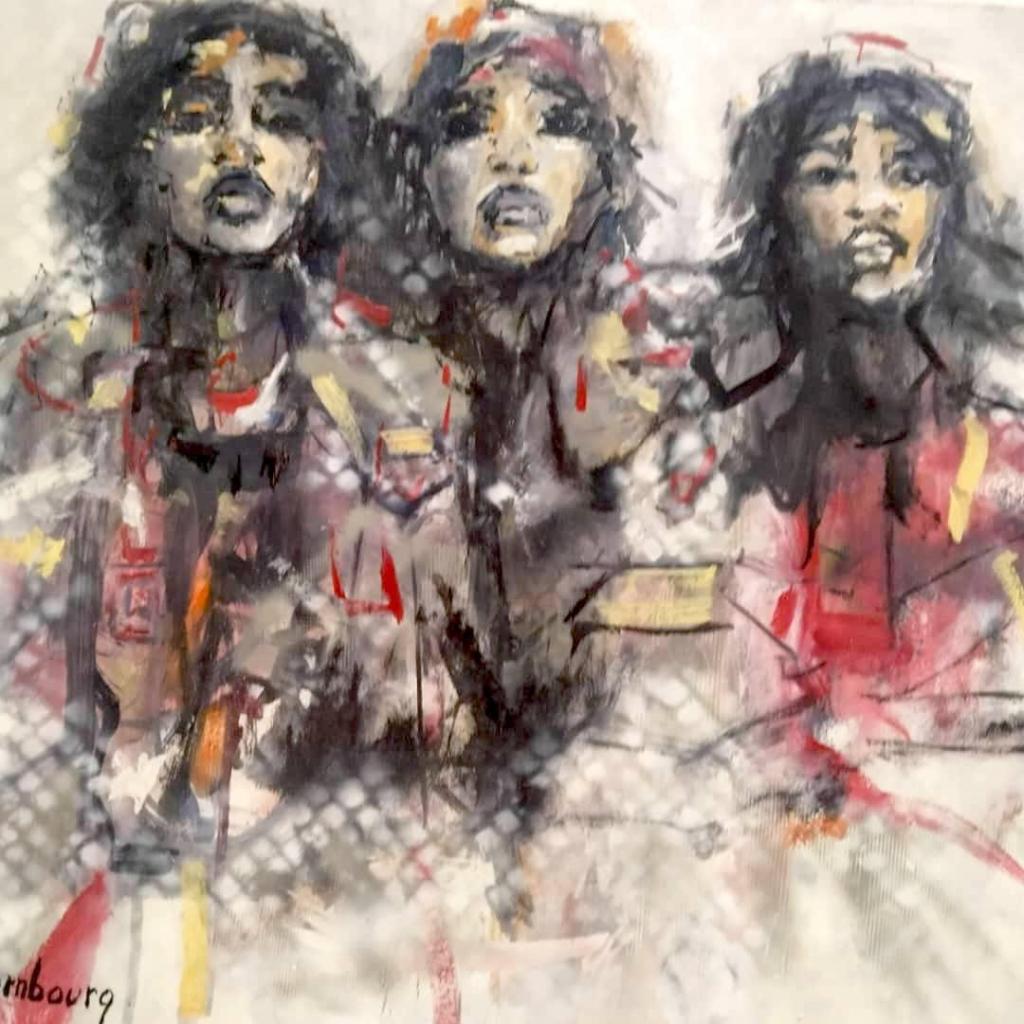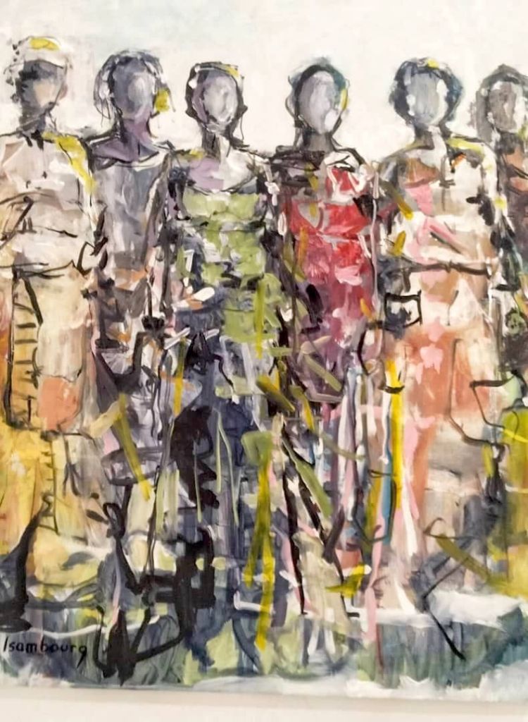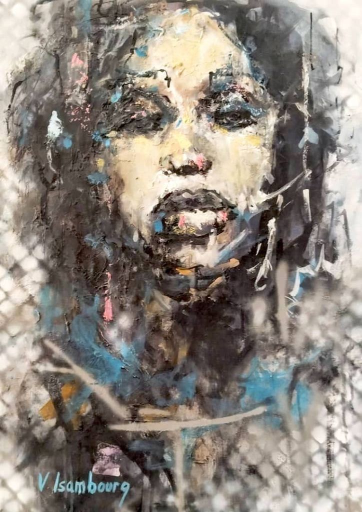 Souvent exposée en Europe et en Afrique, sa peinture est semi figurative. Il utilise pour cette exposition différents médiums pour rendre ses toiles éclatantes.