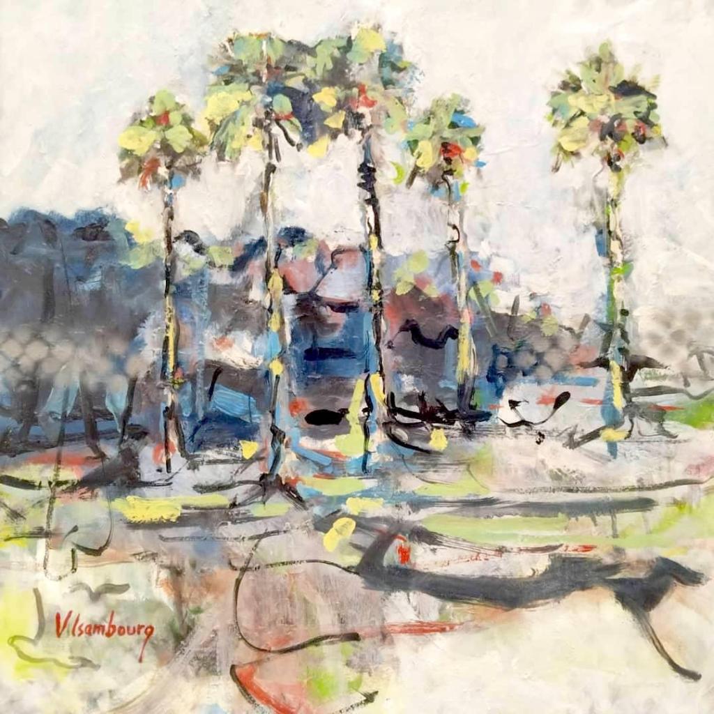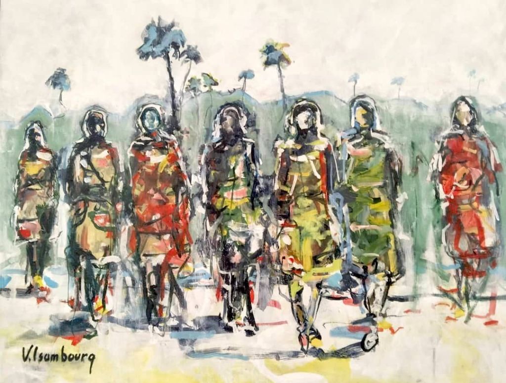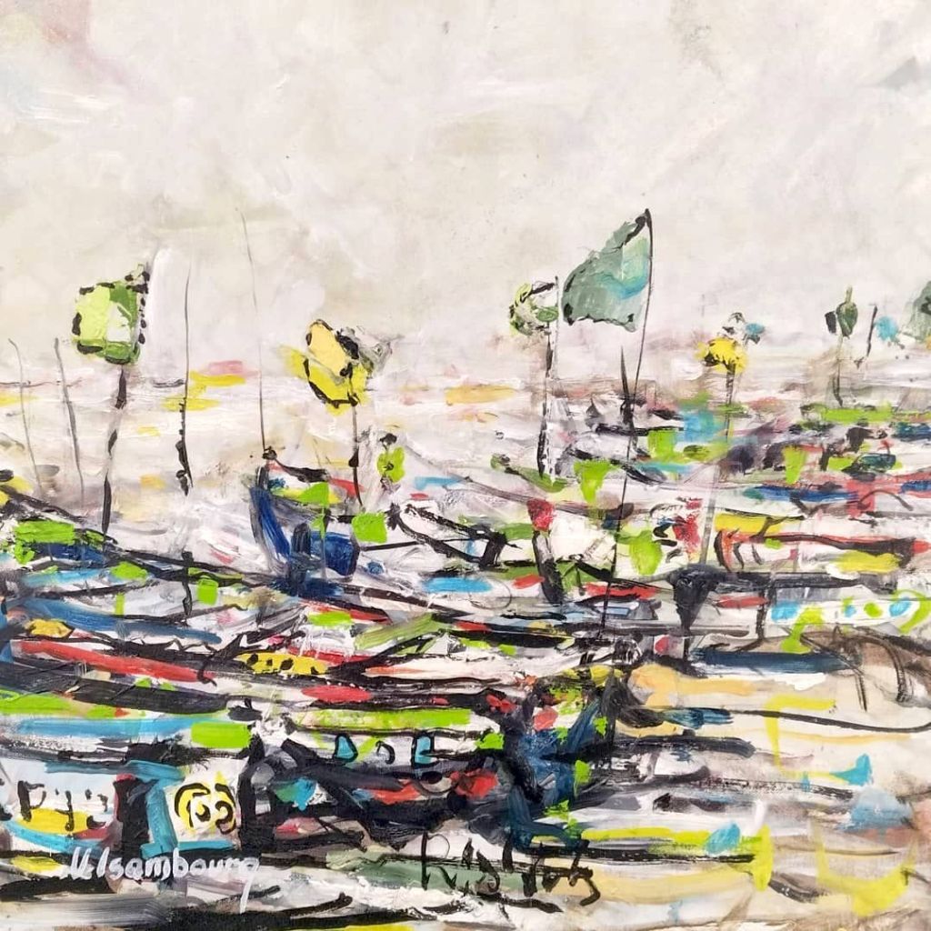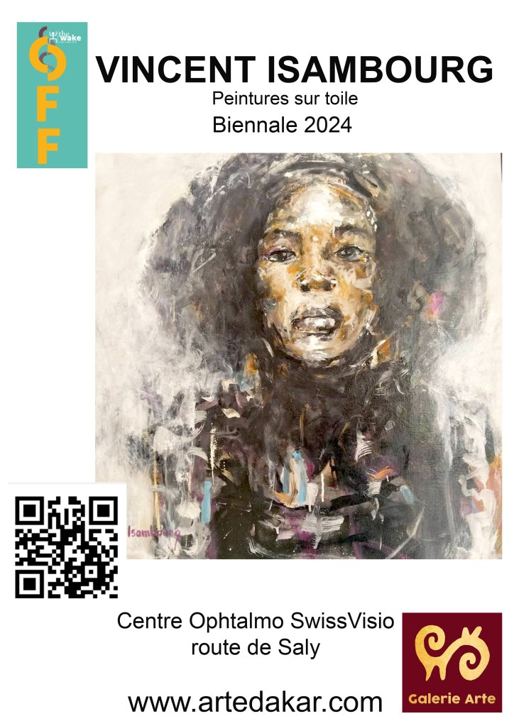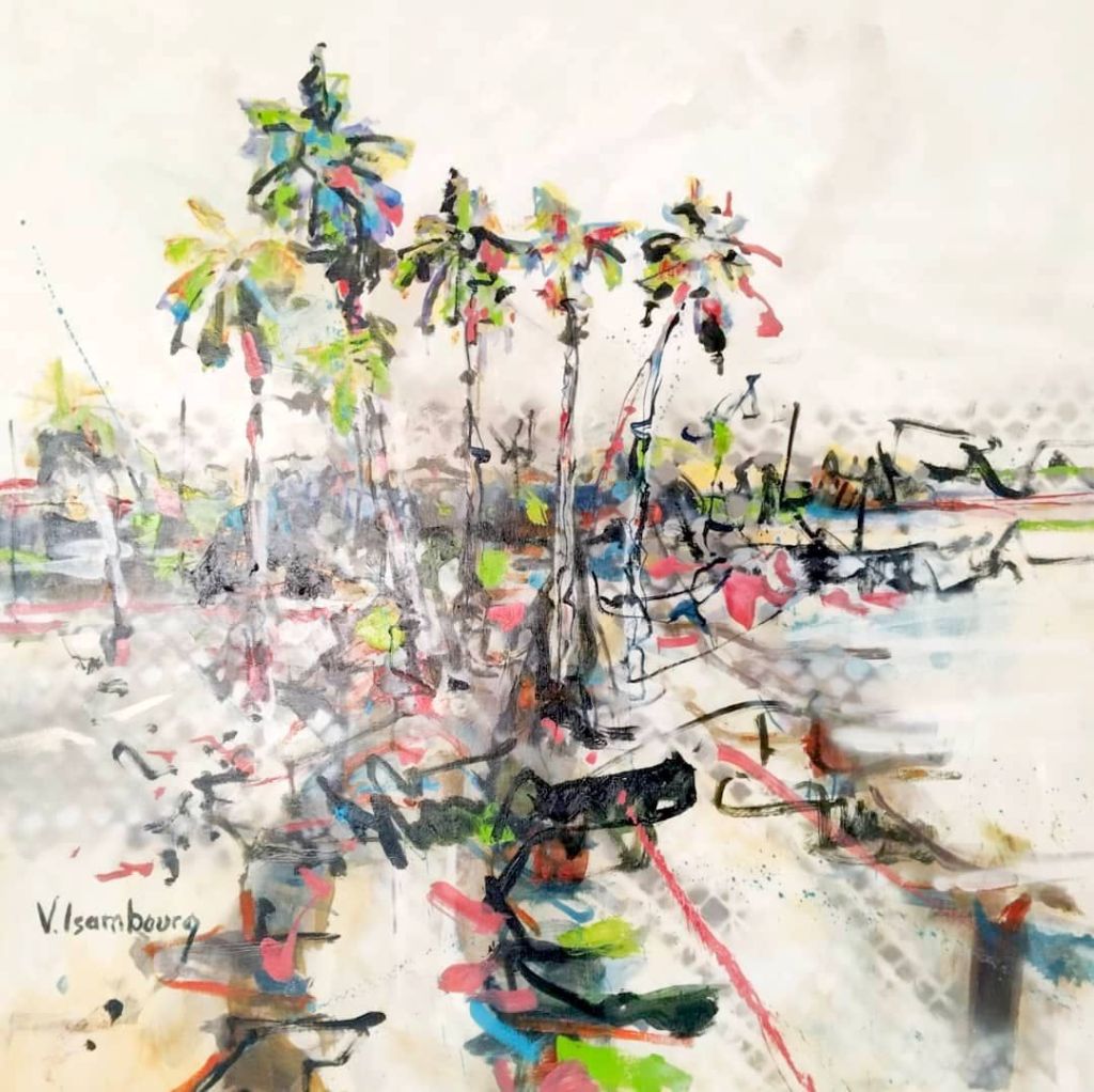 Vincent est surtout connu pour la représentation de visages féminins mais il excelle également dans la peinture de paysages bucoliques. Il vient d’achever une retraite artistique, de plusieurs mois, au coeur du Sine Saloum, à Mar Lodj, où il a pu puiser toute l’inspiration nécessaire pour cette exposition. Le style pictural ressemble à des croquis d’un carnet de voyage. Il croque ainsi le moment présent tel un voyageur qui veut fixer sur un papier, (sur une toile, précisement, pour l’exposition) ses impressions du moment : la lumière du soleil suivant l’heure de la journée, les palmiers aux feuilles délicatement bercées par le vent. Quelquefois, au hasard de ses promenades matinales dans le delta, il croise un groupe de femmes ou des pirogues de pêcheur, au large de la mangrove, qu’il dépeint avec subtilité.