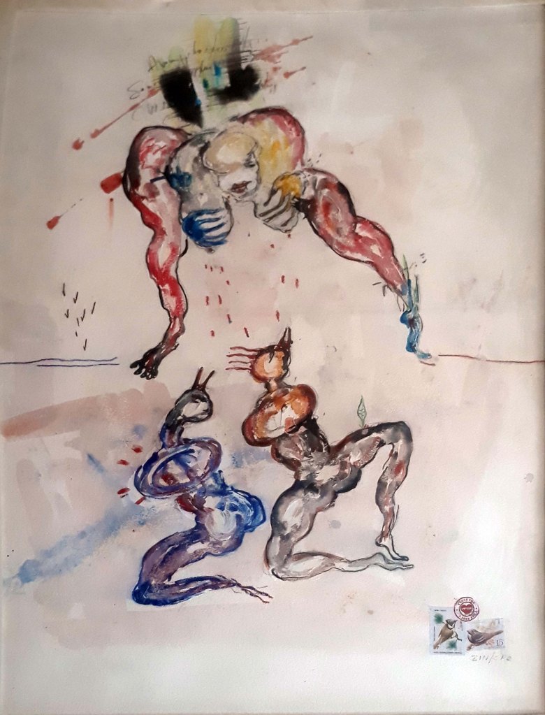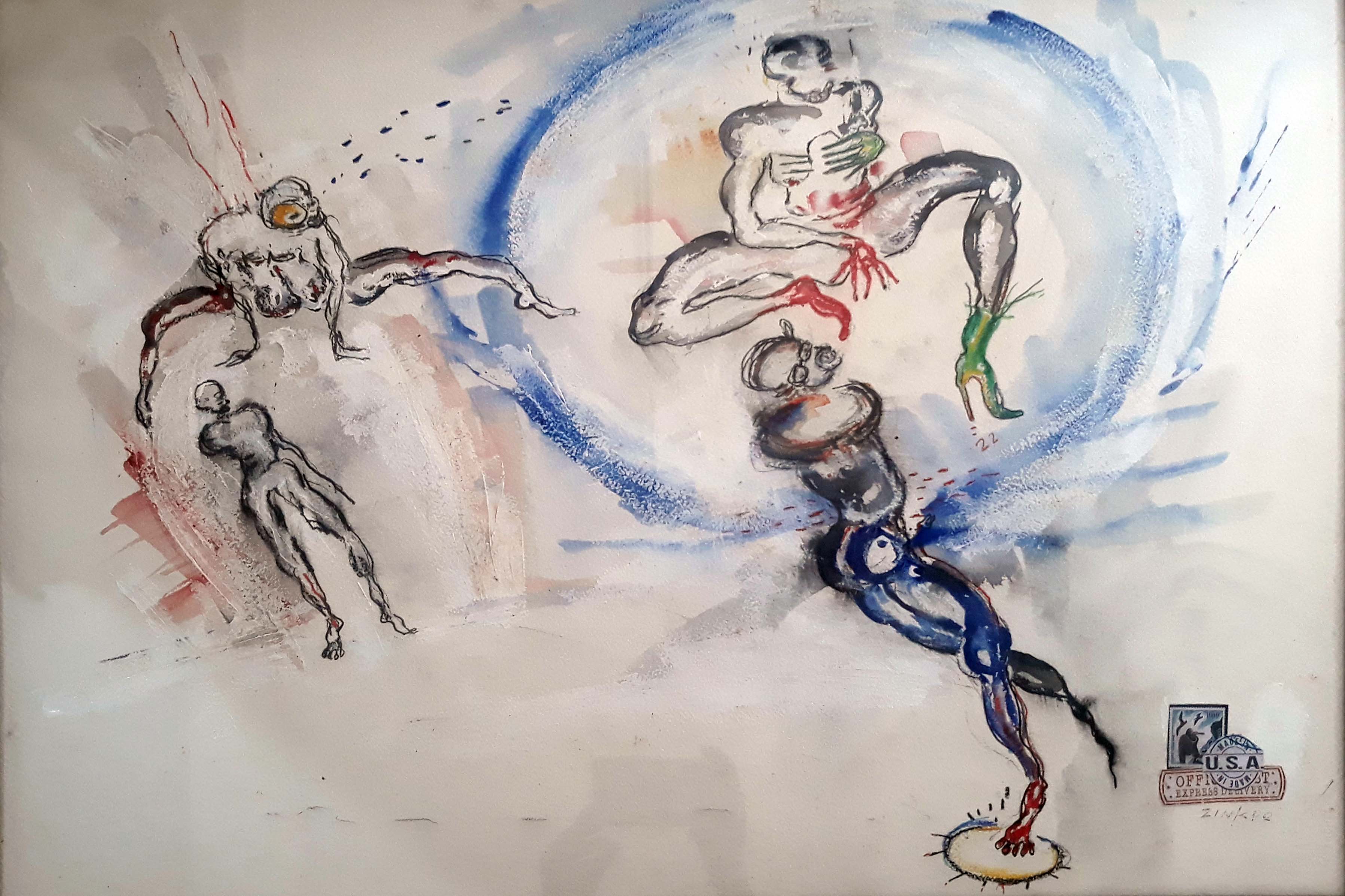 Dominique Zinkpè, né en 1969 à Cotonou au Bénin, est un artiste plasticien béninois contemporain qui réalise peintures, sculptures et installations. Parfois surnommé le « Basquiat africain», il puise son inspiration à la fois dans la culture de son pays – les cérémonies vaudous – et dans l’environnement quotidien africain, notamment avec les taxis brousse qui ont contribué à sa notoriété au début des années 20003. Il vit et travaille à Cotonou.