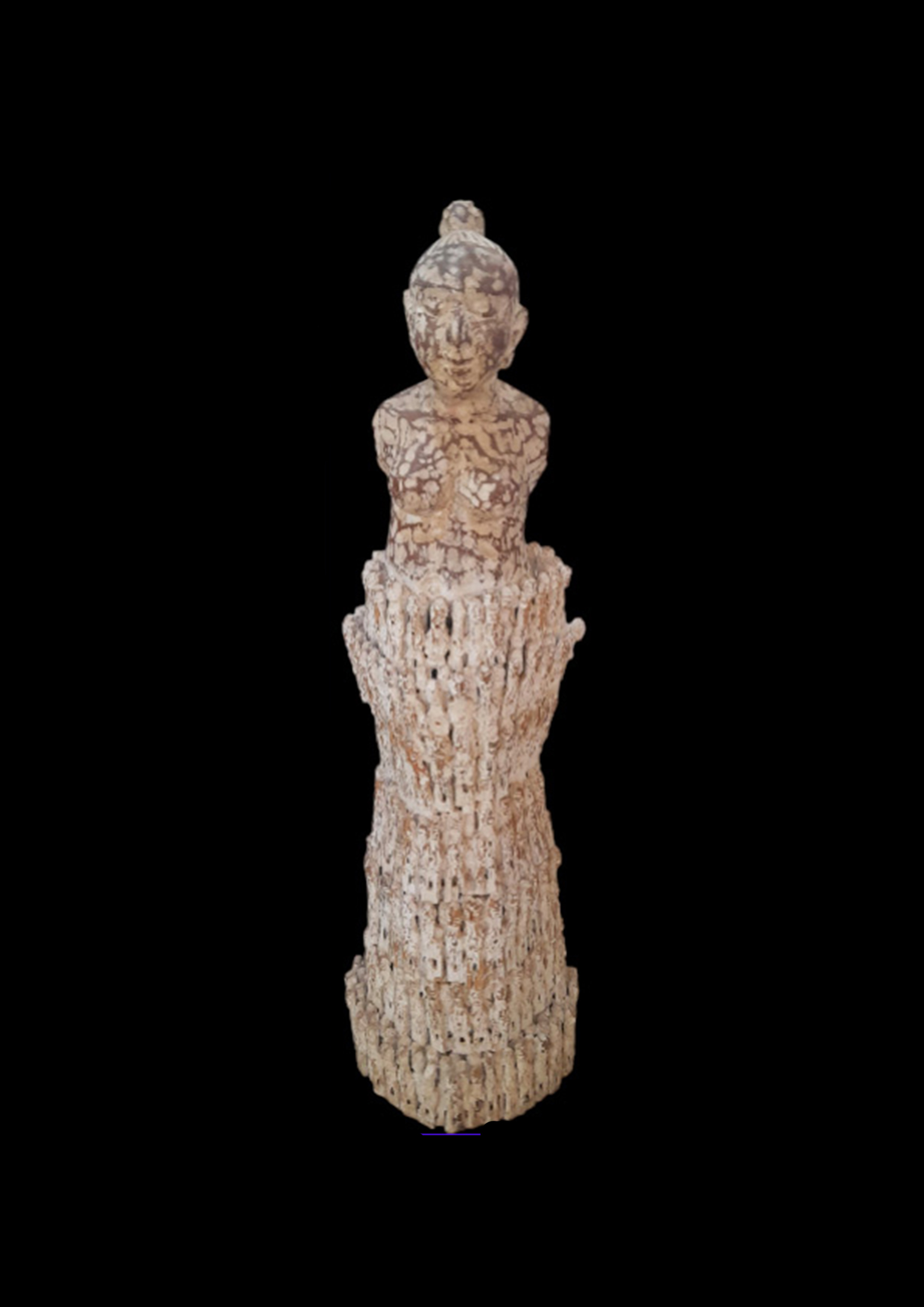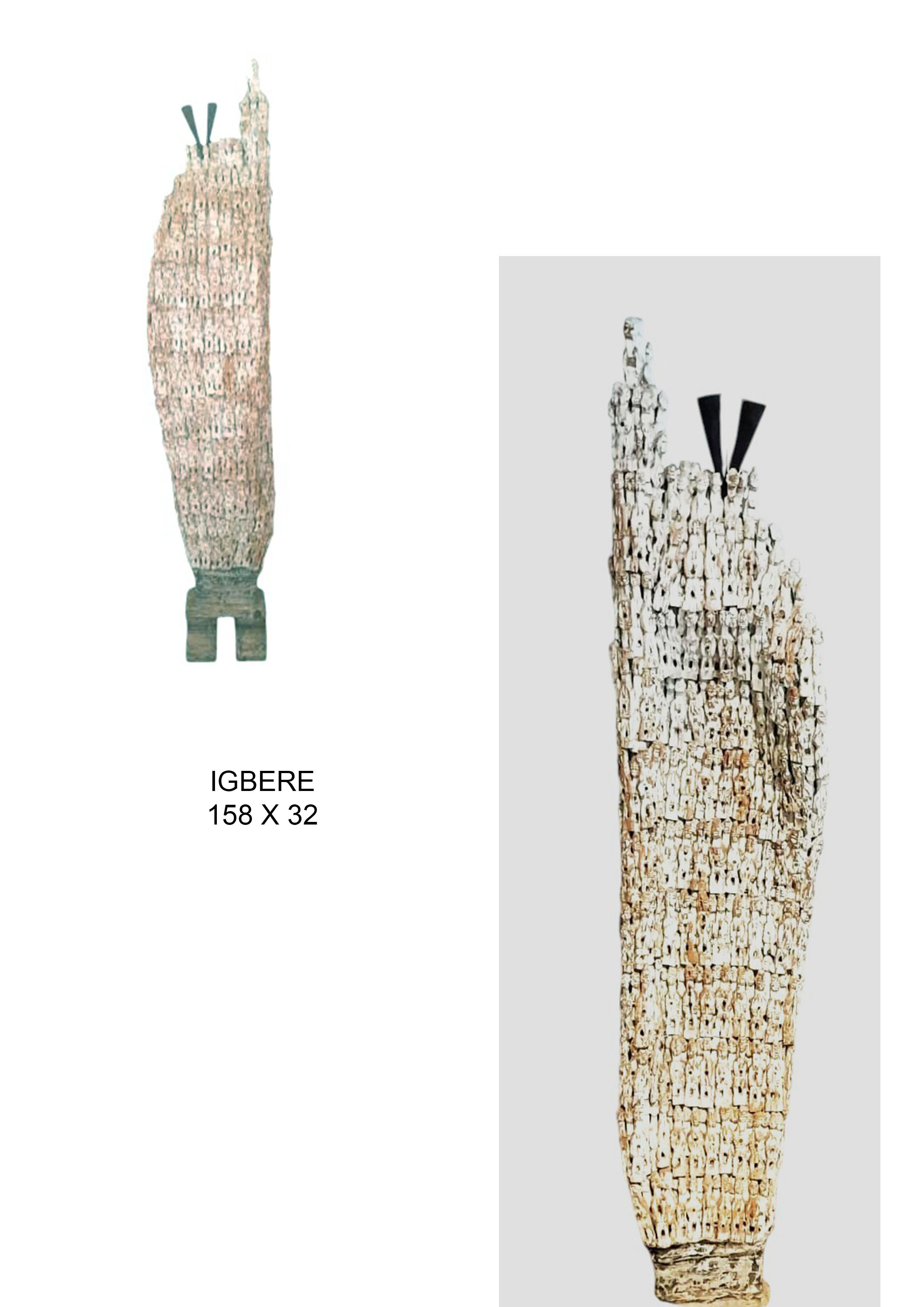 Ses statues sont réalisées avec un assemblage de poupées Yorubas, les Ibedji traditionnelles utilisées pour le culte des jumeaux.